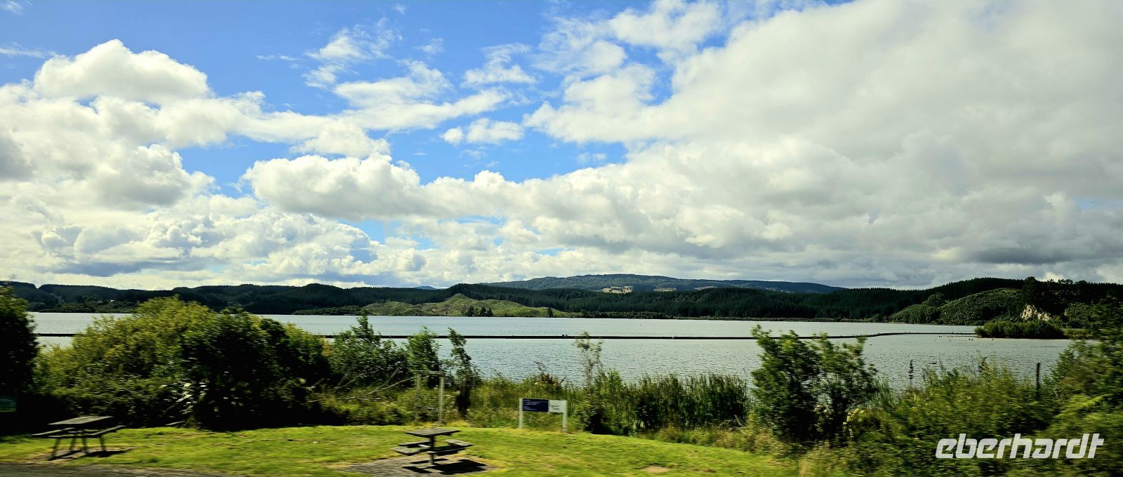 Die Rotorua-Fraktion startet mit dem Bus entlang der Strandpromenade von Tauranga und durch die edlen Wohngebiete der Stadt. Unser Guide John übernimmt das Mikrofon und liefert fachkundig und charmant gleich die passende Landschaftsinterpretation: erst Kiwi-Plantagen, dann dichte Wälder, schließlich eine malerische Seenlandschaft. Neuseeland zeigt sich heute in Bestform.