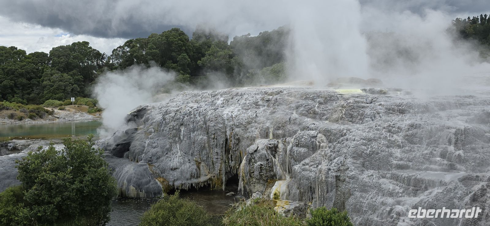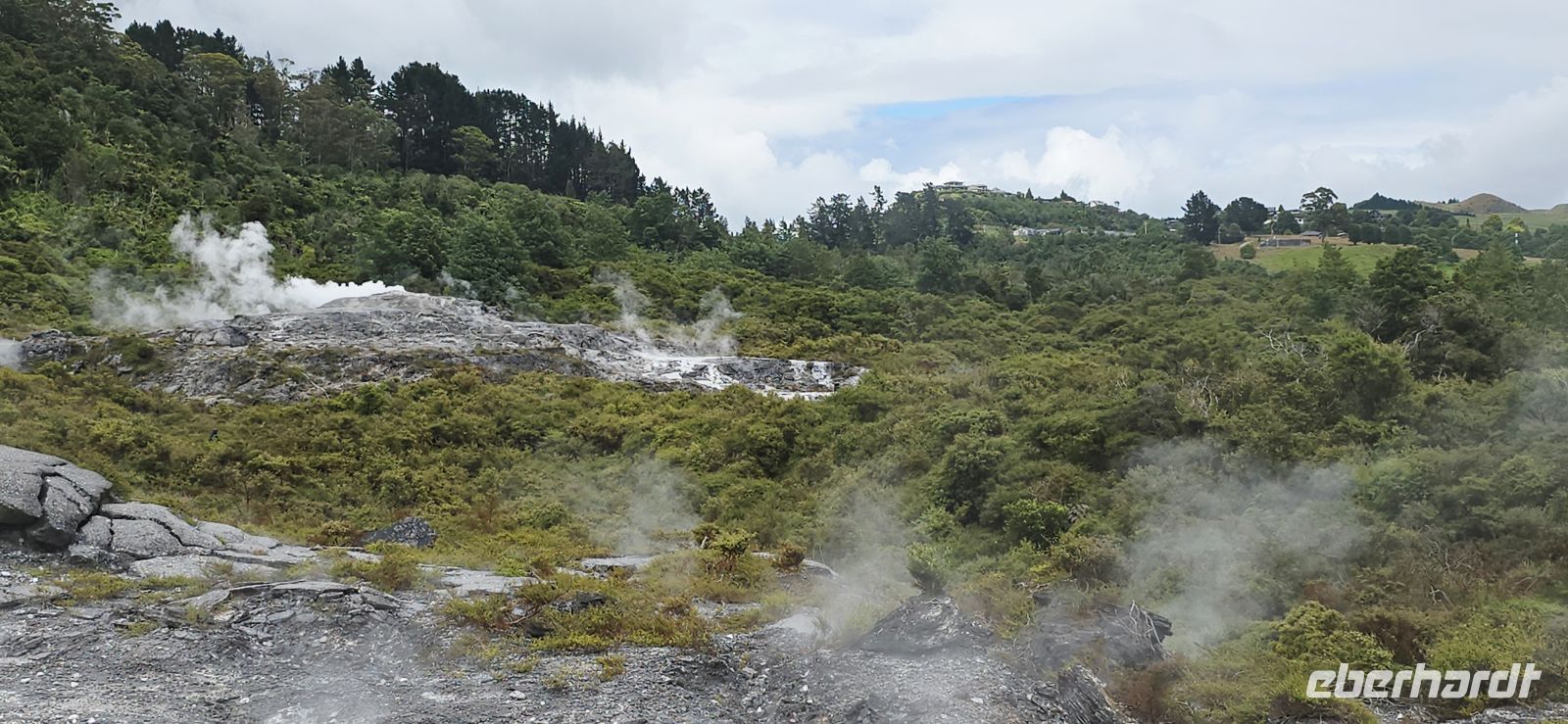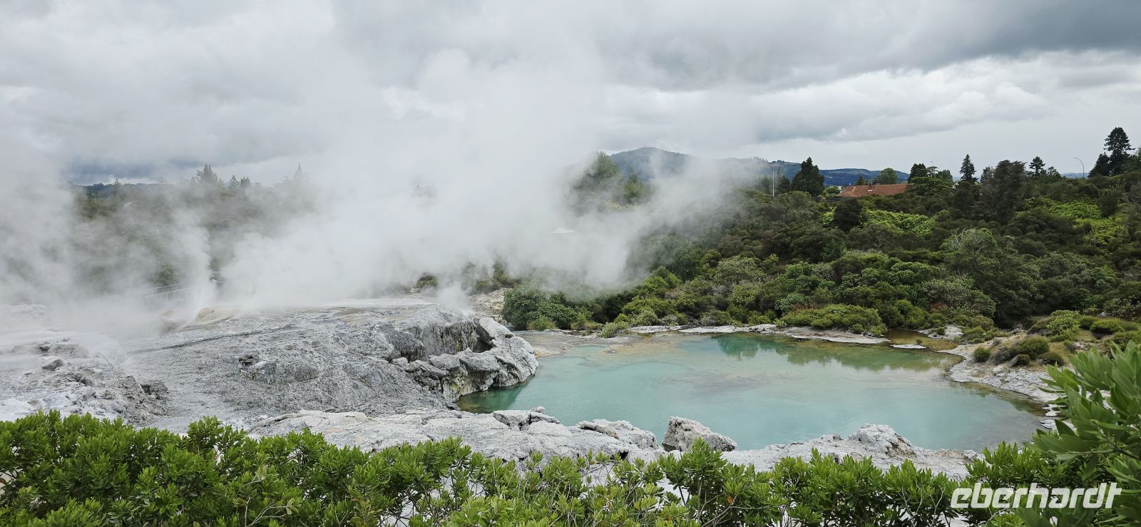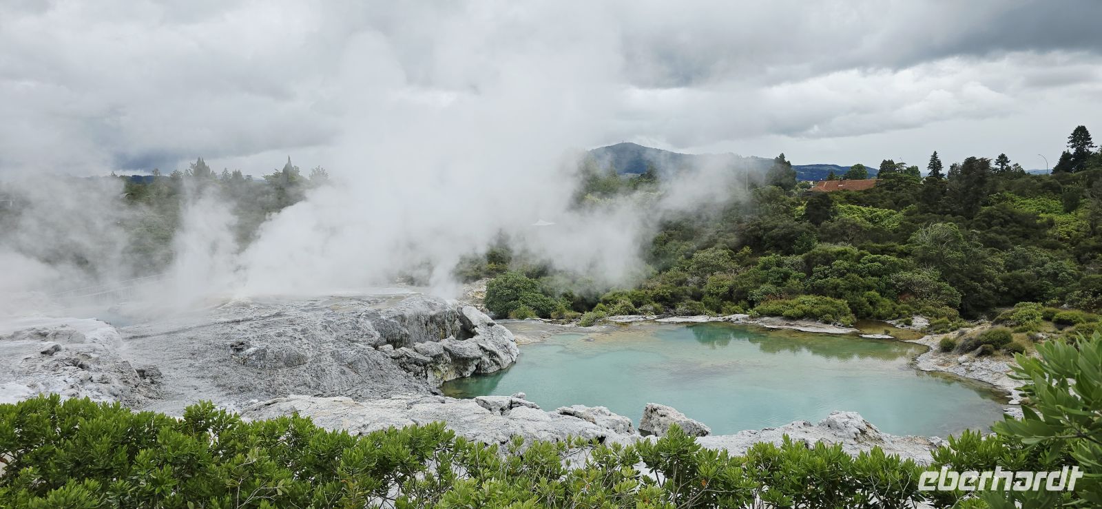 Überall zischt, blubbert und rumort es, und plötzlich schießen die ersten Geysirfontänen aus dem Boden – mal hier, mal dort, ganz nach Laune der Natur. Unterhalb schimmert ein tiefblauer Badesee, während uns eine kleine Bahn gemütlich hinüber ins Māori-Dorf bringt.