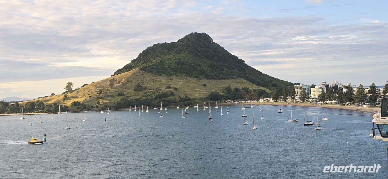 Schon am frühen Nachmittag heißt es wieder: Leinen los. Wir verlassen die Bucht und nehmen Kurs auf Tauranga. Kaum draußen, werden wir von den berühmten Tölpeln begleitet, die elegant um das Schiff kreisen. Ihre größte Brutkolonie liegt am Cape Kidnappers, das – der Legende nach – von Kapitän Cook seinen Namen erhielt. Die Sonne meint es heute besonders gut mit uns, und so genießen viele das warme Wetter an Deck oder gönnen sich ein erfrischendes Bad im Pool.