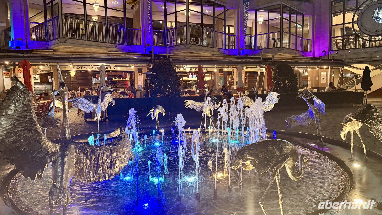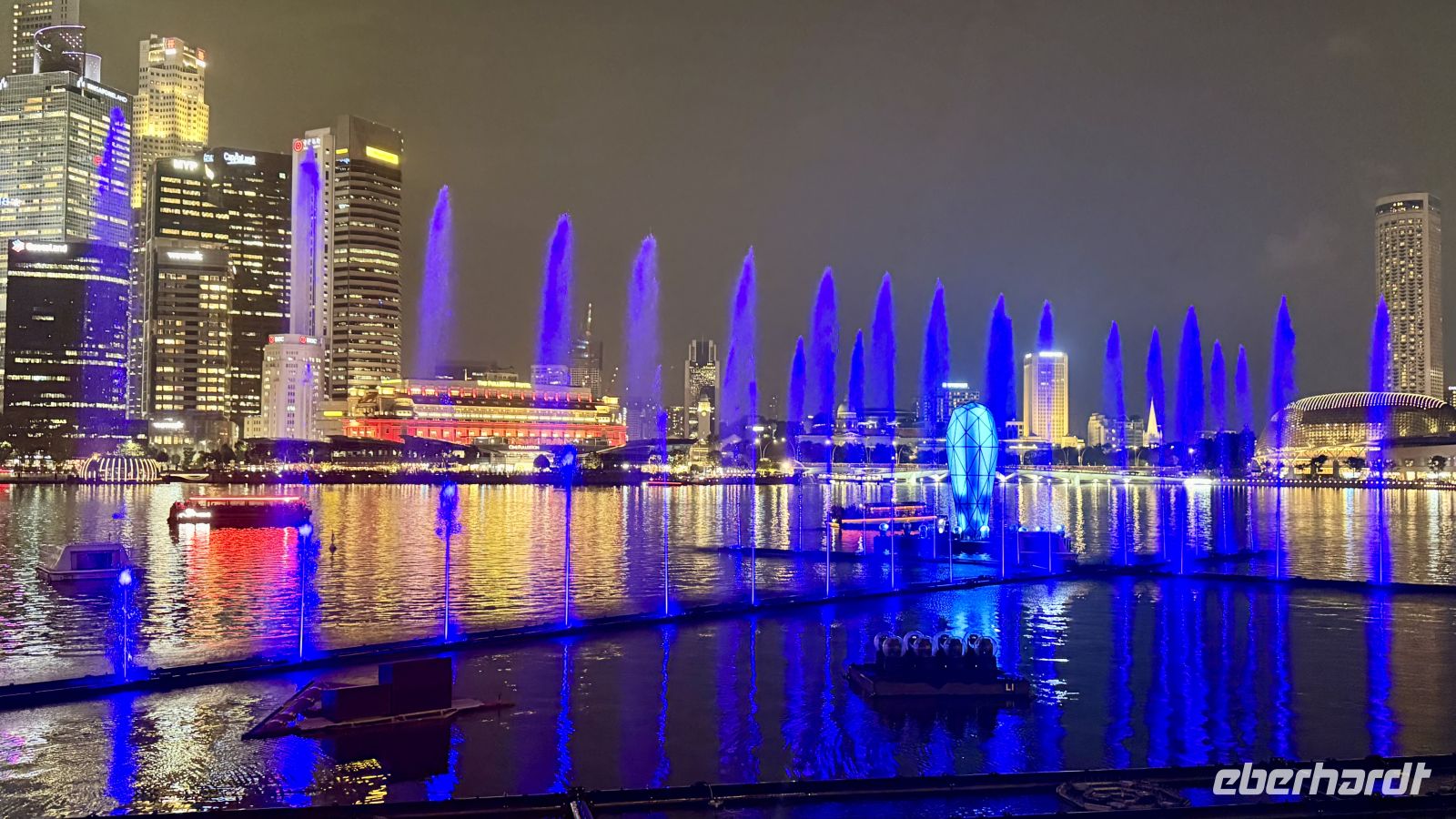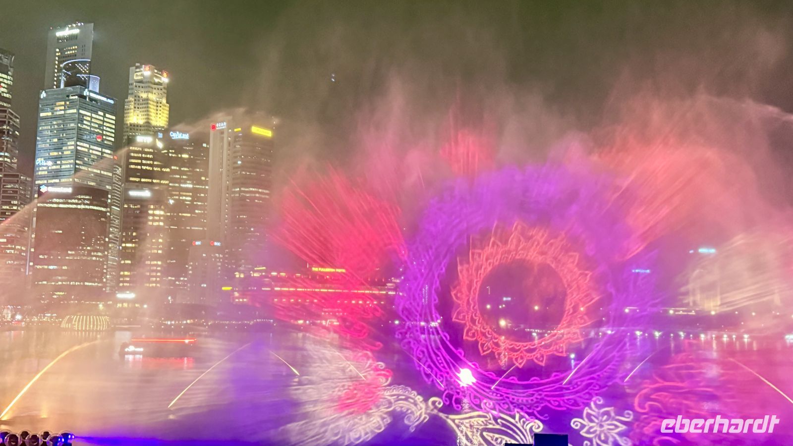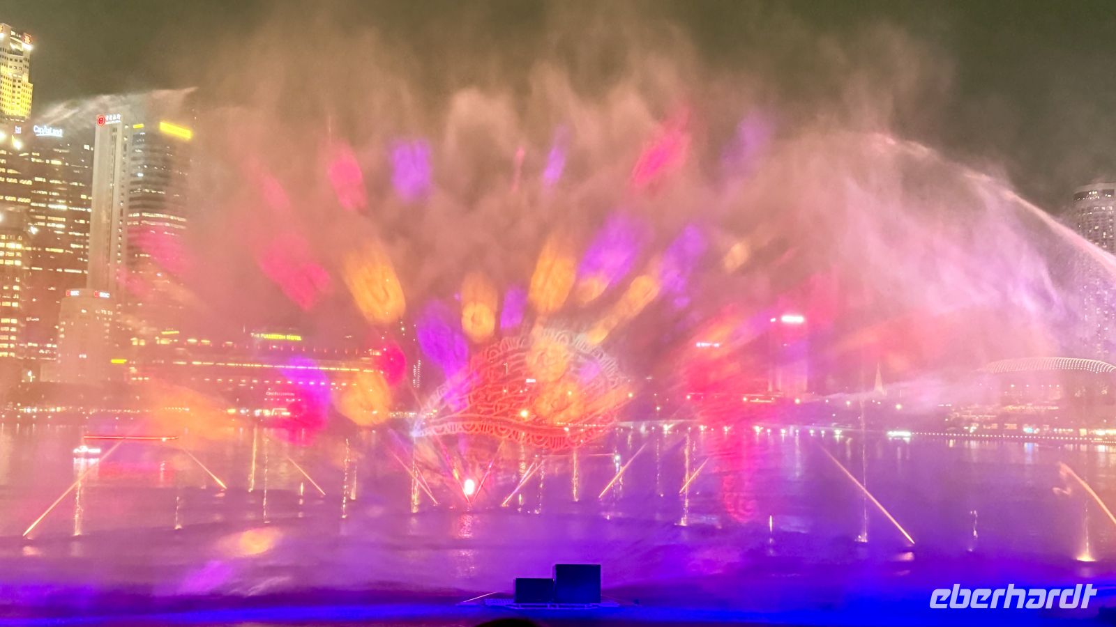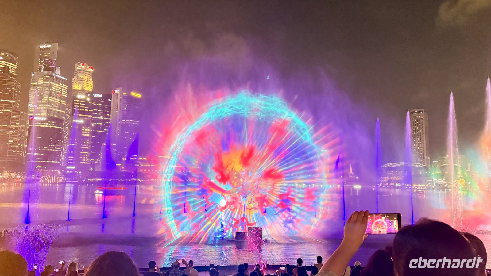 Zuerst schauten wir uns Spectra – A Light & Water Show an. Diese beeindruckende Multimedia-Show findet jeden Abend an der Marina Bay vor dem Marina Bay Sands Hotel statt. Wasserfontänen, Laser, Projektionen und Musik erzählen eine kleine Geschichte über die Entwicklung Singapurs. Vor der beleuchteten Skyline der Stadt ist diese Show ein echtes Highlight und zieht täglich zahlreiche Besucher an.