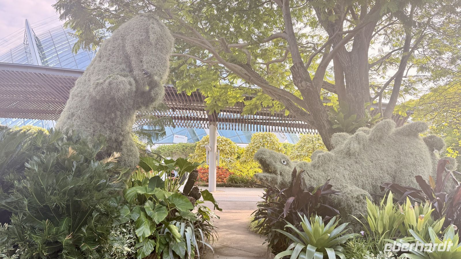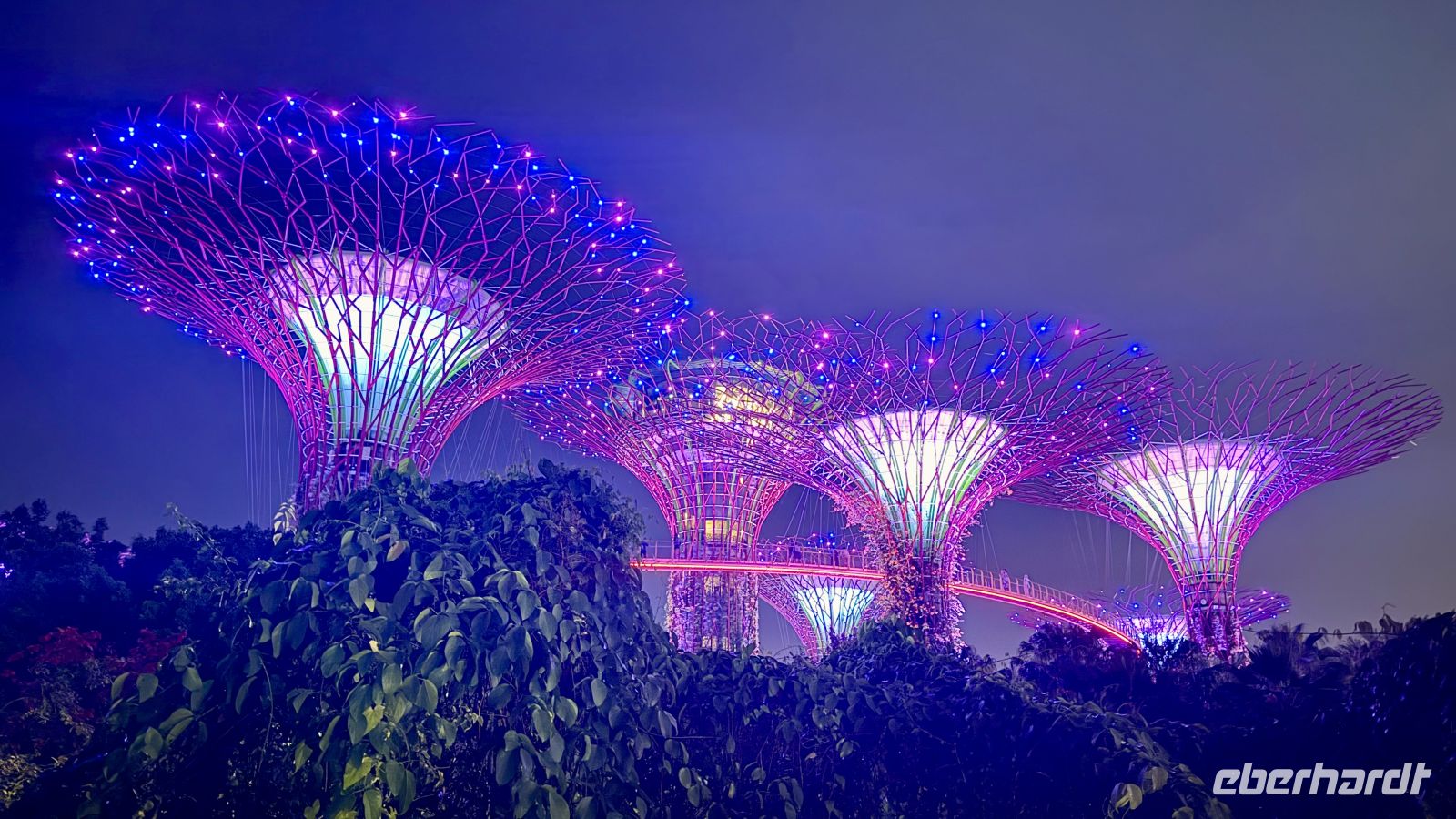Danach ging es weiter zu den Gardens by the Bay, einem der bekanntesten Parks Singapurs. Der futuristische Naturpark erstreckt sich über mehr als 100 Hektar und ist besonders für seine bis zu 50 Meter hohen „Supertrees“ berühmt. Diese künstlichen Baumkonstruktionen sind mit Pflanzen bewachsen und dienen gleichzeitig als vertikale Gärten, Energiespeicher und Belüftungssysteme für die Gewächshäuser. Am Abend werden sie bei der „Garden Rhapsody“-Show eindrucksvoll beleuchtet und bieten eine magische Atmosphäre.
