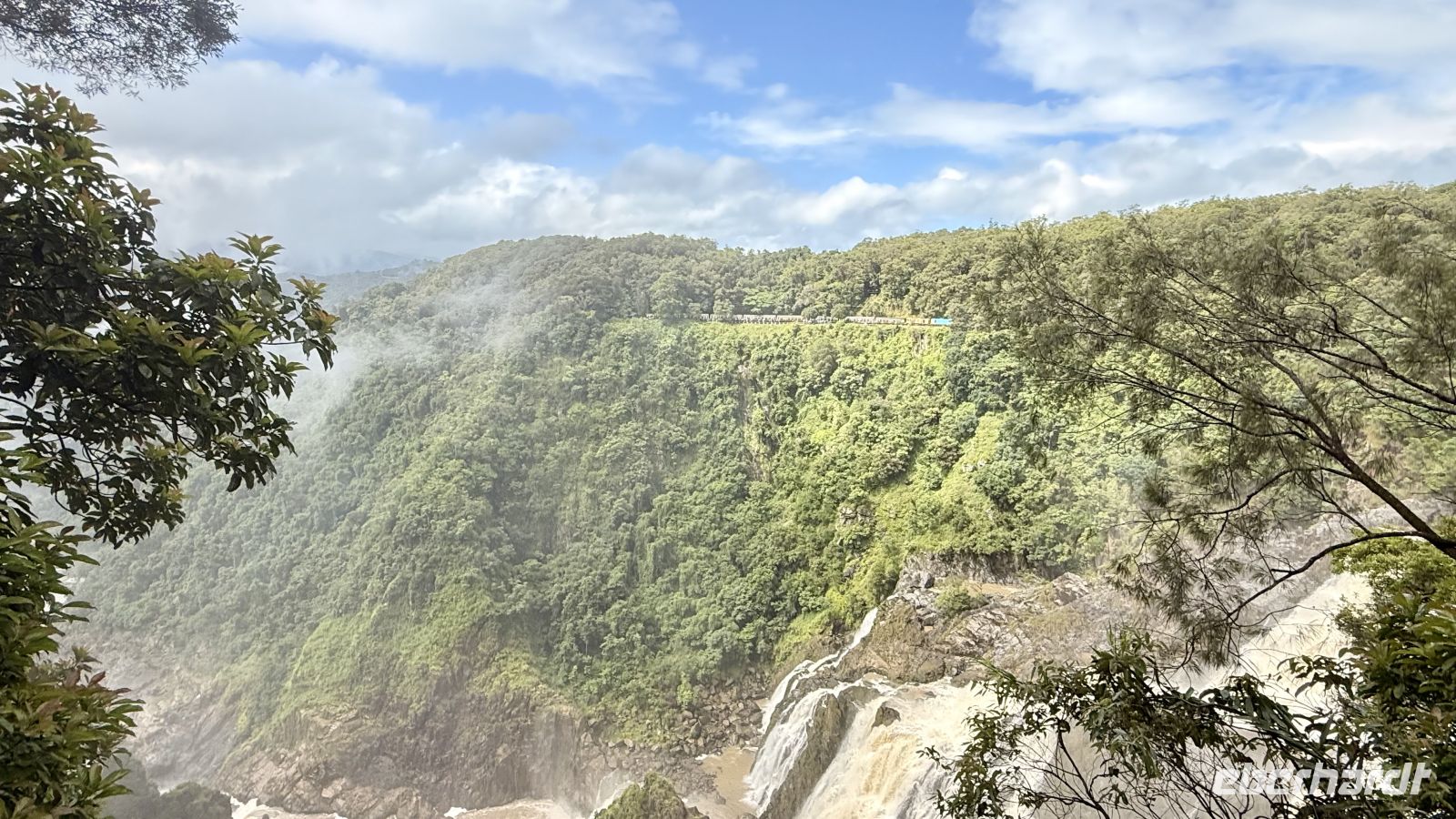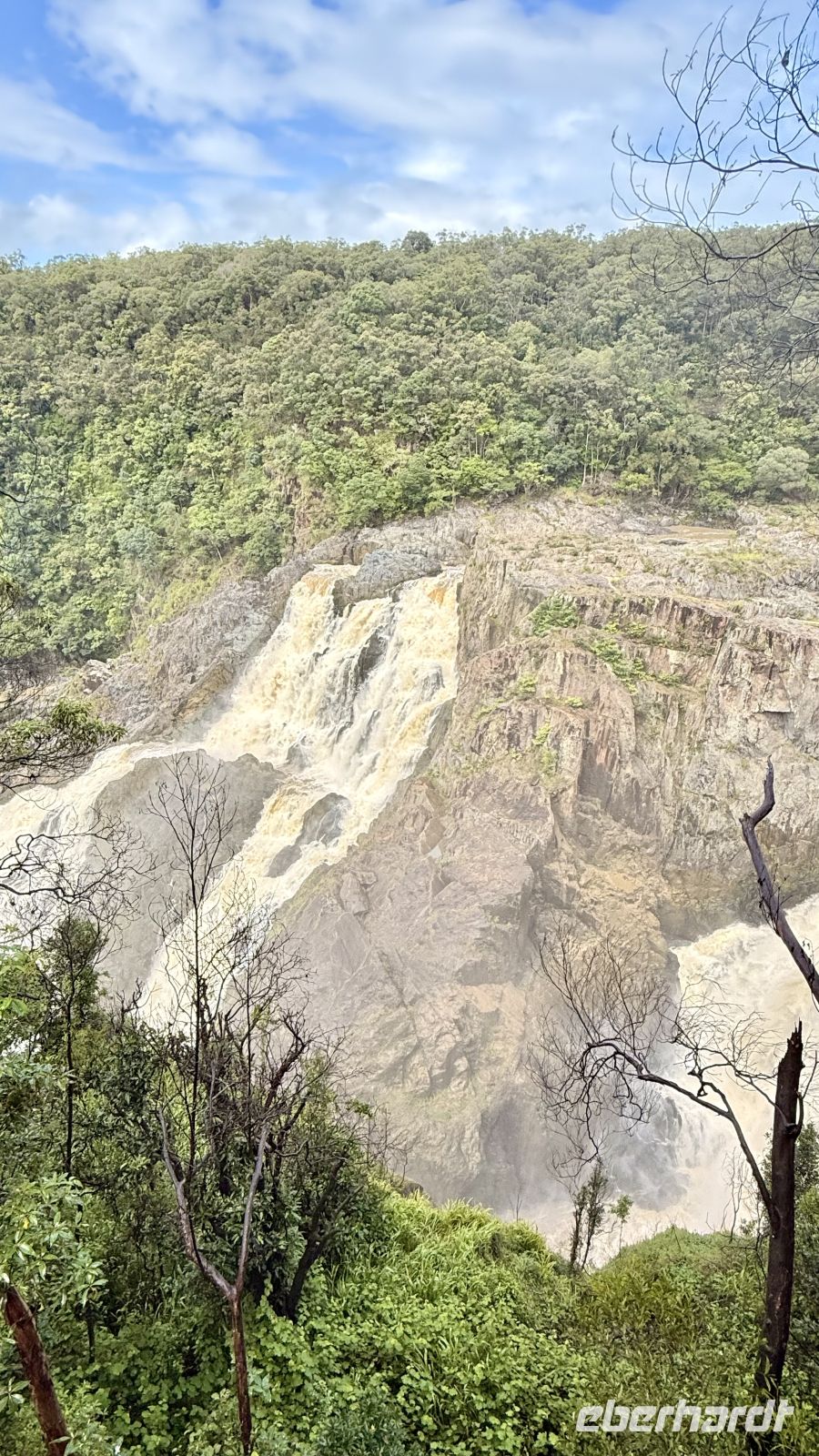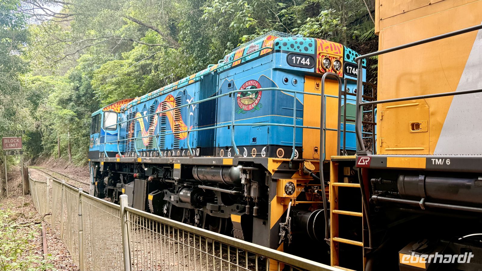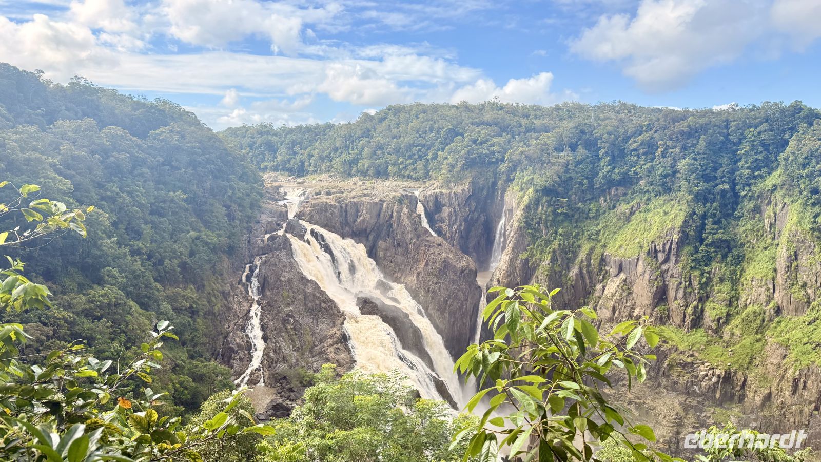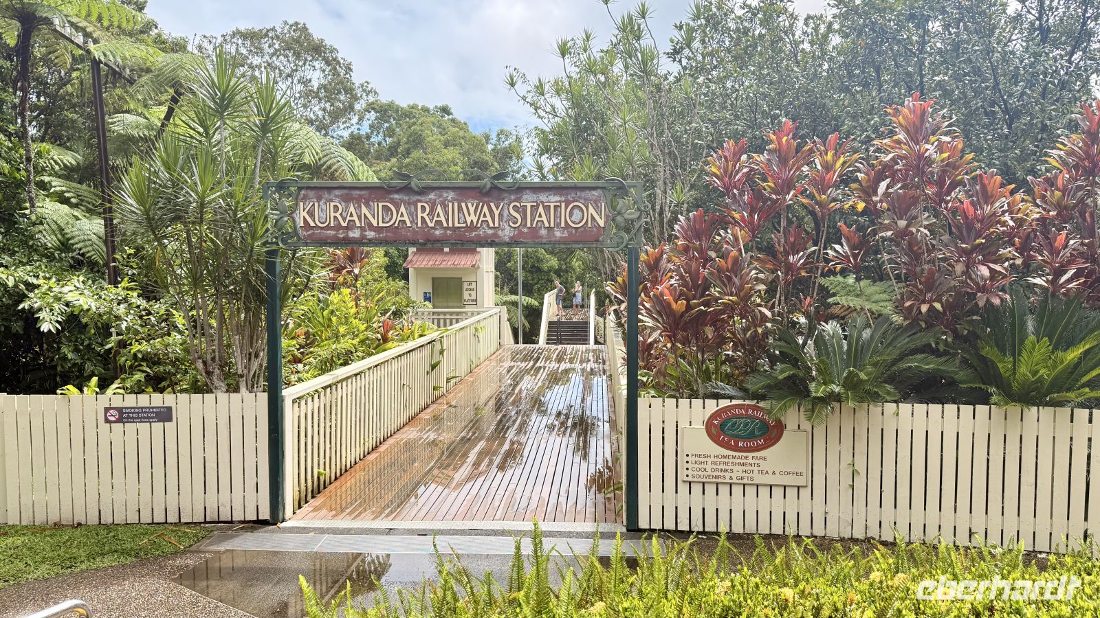 Weiter ging es mit dem Kuranda Scenic Railway wieder zurück nach Cairns. Diese historische Eisenbahnstrecke wurde bereits Ende des 19. Jahrhunderts gebaut und gilt als eine der schönsten Zugstrecken Australiens. Während der etwa zweistündigen Fahrt überquert der Zug zahlreiche Brücken und fährt durch mehrere Tunnel, vorbei an spektakulären Wasserfällen und durch dichten Regenwald. Besonders beeindruckend ist der Blick auf die Barron Falls, einen der bekanntesten Wasserfälle der Region.