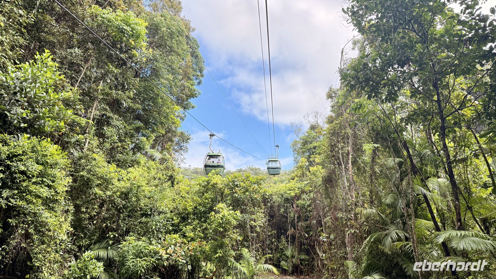 Am heutigen Tag starteten wir mit einer Seilbahnfahrt über den Regenwald, und passend dazu regnete es heute auch etwas – was im tropischen Norden Australiens gar nicht ungewöhnlich ist. Die Fahrt erfolgte mit der Skyrail Rainforest Cableway, einer der spektakulärsten Seilbahnen Australiens. Sie führt über etwa 7,5 Kilometer hinweg über den uralten tropischen Regenwald der Wet Tropics of Queensland, der zum UNESCO-Weltnaturerbe gehört. Während der Fahrt hat man einen fantastischen Blick auf die dichten Baumkronen, Wasserfälle und die beeindruckende Landschaft dieses über 100 Millionen Jahre alten Ökosystems.