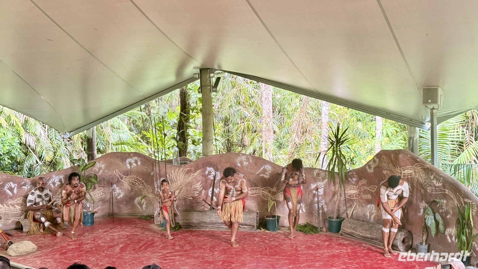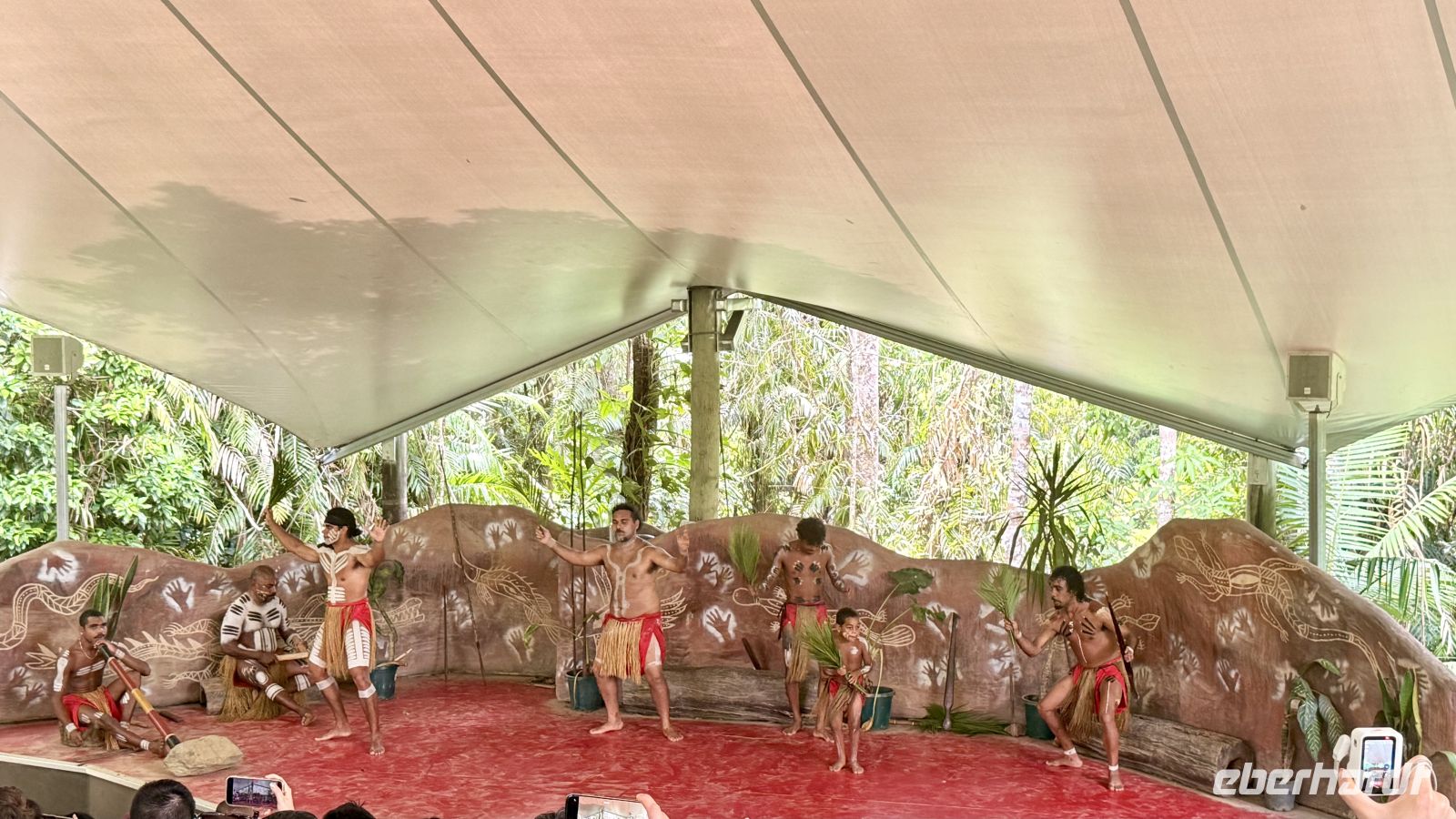 Aborigines zeigten uns dort, wie man traditionell Speer und Bumerang wirft, führten einen traditionellen Tanz auf und demonstrierten auch, wie man ein Didgeridoo spielt – ein traditionelles Blasinstrument der australischen Ureinwohner, das aus einem ausgehöhlten Eukalyptusstamm besteht und einen sehr tiefen, rhythmischen Klang erzeugt. Dabei erfuhren wir auch einiges über die Kultur, Geschichte und Lebensweise der Aborigines, deren Traditionen viele tausend Jahre zurückreichen.