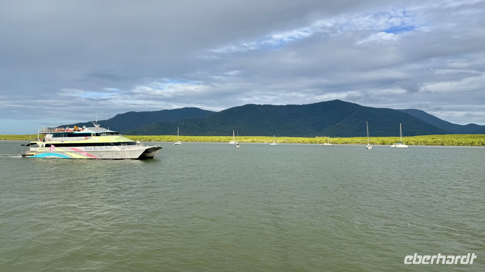 Komplett glücklich und zufrieden traten wir anschließend die Rückfahrt nach Cairns an. An Bord wurden wir während der gesamten Fahrt hervorragend umsorgt und bewirtet – mit Getränken, Snacks und einem leckeren Mittagessen.