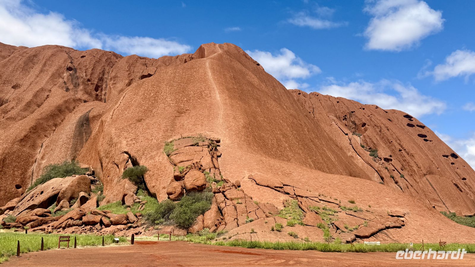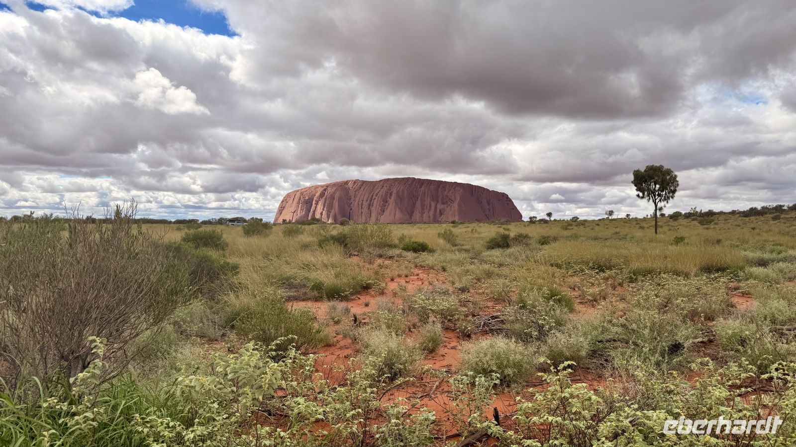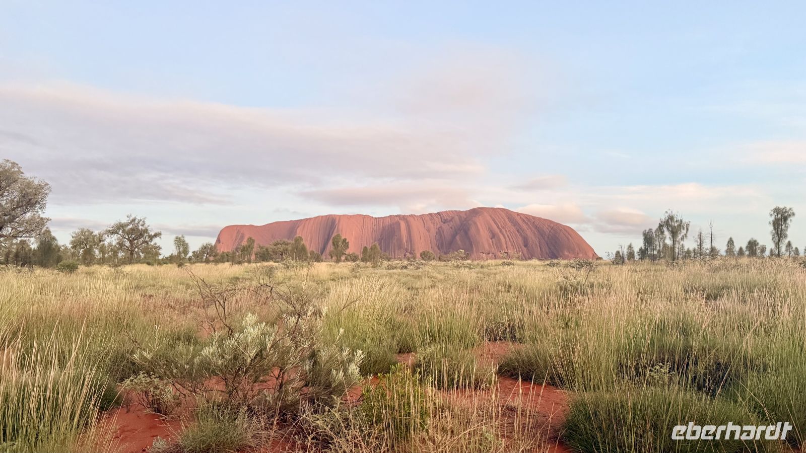 Danach ging es direkt zum Uluru, einem der bekanntesten Wahrzeichen Australiens. Der riesige Monolith aus Sandstein ragt etwa 348 Meter über die umgebende Landschaft hinaus und hat einen Umfang von rund neun Kilometern. Uluru ist über 500 Millionen Jahre alt und verändert je nach Tageszeit und Sonnenstand seine Farbe – von kräftigem Rot über Orange bis hin zu tiefem Braun. Für die Anangu ist der Felsen ein heiliger Ort, weshalb das Besteigen des Uluru inzwischen verboten ist.