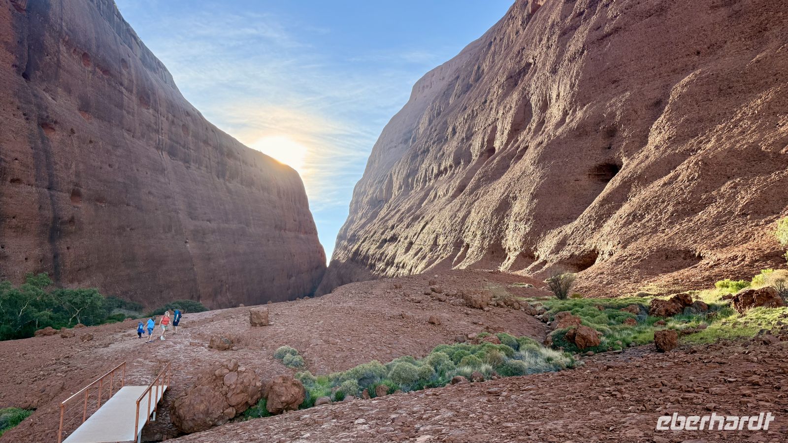 Dort unternahmen wir eine kleine Wanderung durch den Walpa Gorge Walk. Dieser etwa zwei bis drei Kilometer lange Wanderweg führt zwischen zwei der großen Felskuppeln hindurch in eine beeindruckende Schlucht. Während der Wanderung konnte man gut erkennen, wie Wasser und Wind über Millionen von Jahren diese Landschaft geformt haben. Außerdem wachsen in der Schlucht einige Pflanzenarten, die man sonst im trockenen Outback kaum findet.