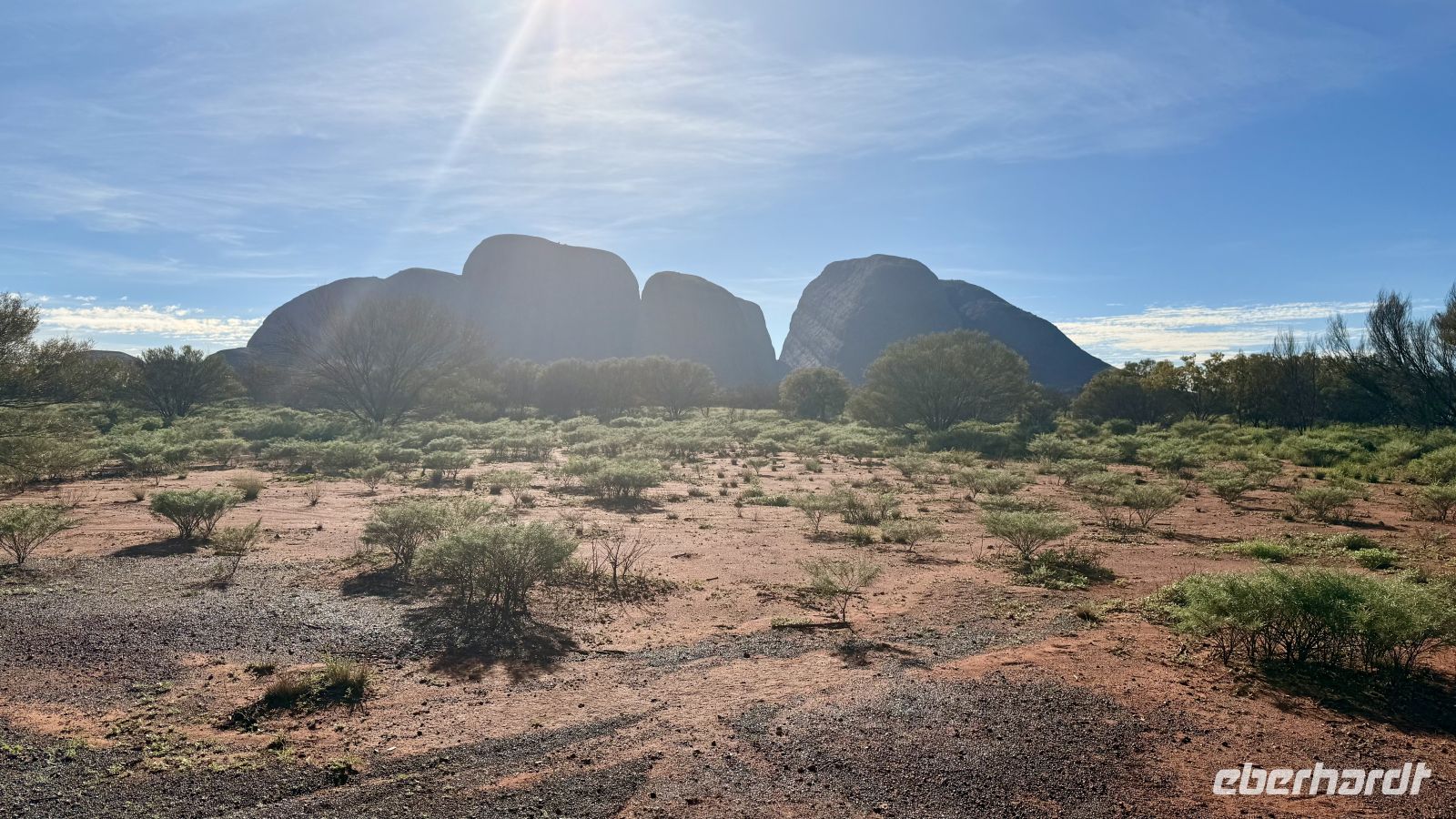 Danach ging es weiter zu den Kata Tjuta, die auch als „The Olgas“ bekannt sind. Diese beeindruckende Felsformation besteht aus 36 großen, runden Felskuppeln und liegt etwa 40 Kilometer vom Uluru entfernt. Der Name „Kata Tjuta“ stammt aus der Sprache der Anangu und bedeutet „viele Köpfe“. Die Felsen sind ebenfalls heilig für die indigene Bevölkerung und bestehen aus einem anderen Gestein als der Uluru – einem Konglomerat aus vielen verschiedenen Gesteinsarten.