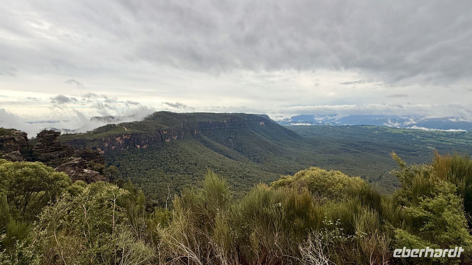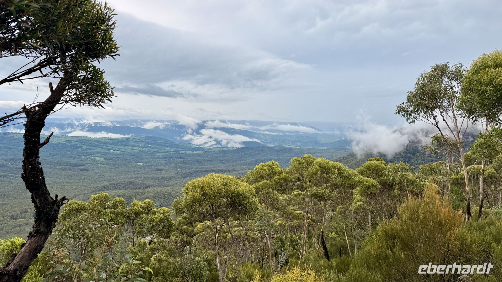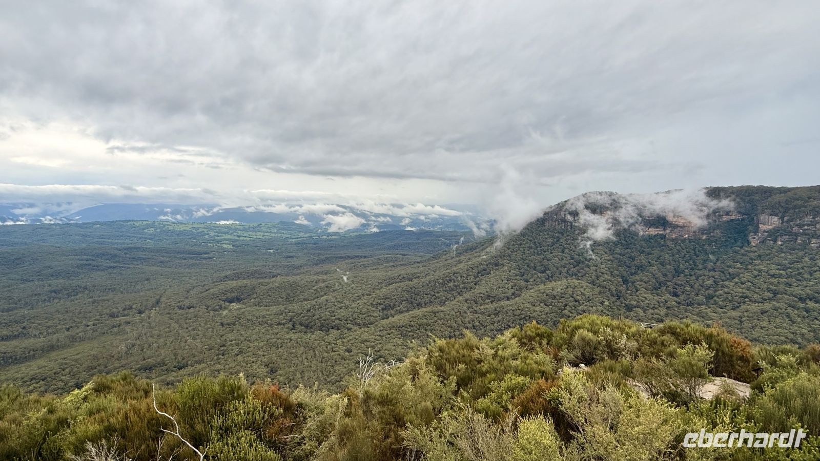 Auch am Boars Head Lookout war die Sicht besser, sodass wir die weiten Täler und Wälder der Region gut überblicken konnten. Der Aussichtspunkt bietet einen fantastischen Panoramablick über die Jamison Valley Schlucht und die umliegenden Sandsteinfelsen – ein beliebtes Fotomotiv für Besucher aus aller Welt.