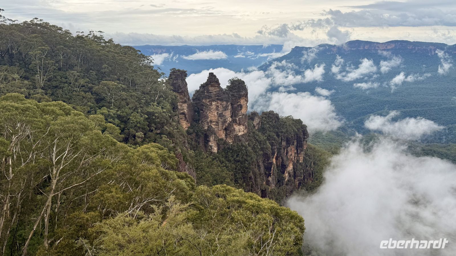 Heute machten wir uns auf den Weg in die Blue Mountains. Das Gebirge liegt etwa 100 Kilometer westlich von Sydney und ist für seine tiefen Schluchten, Eukalyptuswälder und spektakulären Felsformationen bekannt. Leider war die Sicht zunächst nicht so gut, aber die Drei Schwestern konnten wir zum Glück sehen. Diese markante Felsformation besteht aus drei nebeneinanderstehenden Sandsteinfelsen und ist eines der bekanntesten Wahrzeichen der Blue Mountains. Laut Aborigine-Legenden stehen die Felsen für drei Schwestern, die von einem Zauberer in Stein verwandelt wurden.
