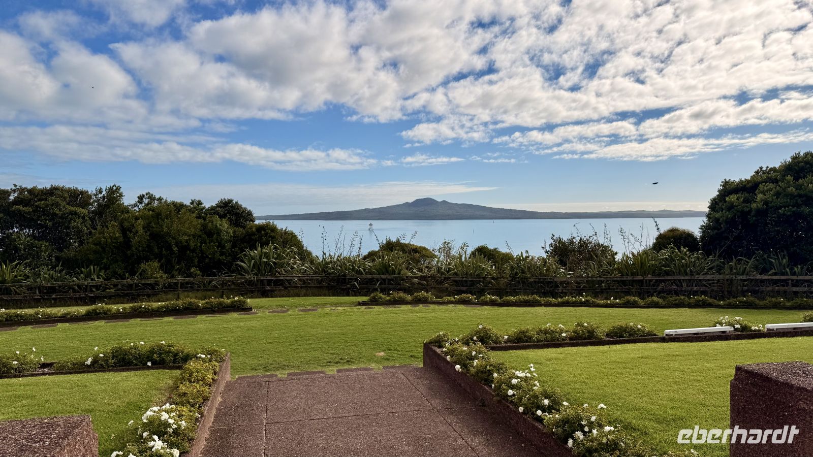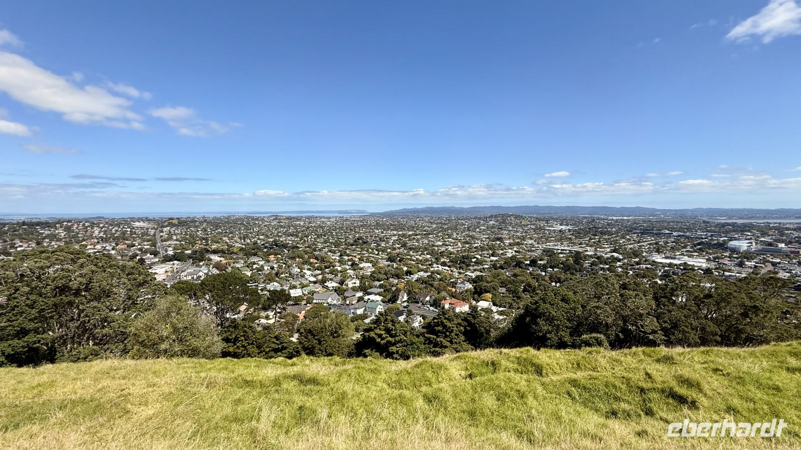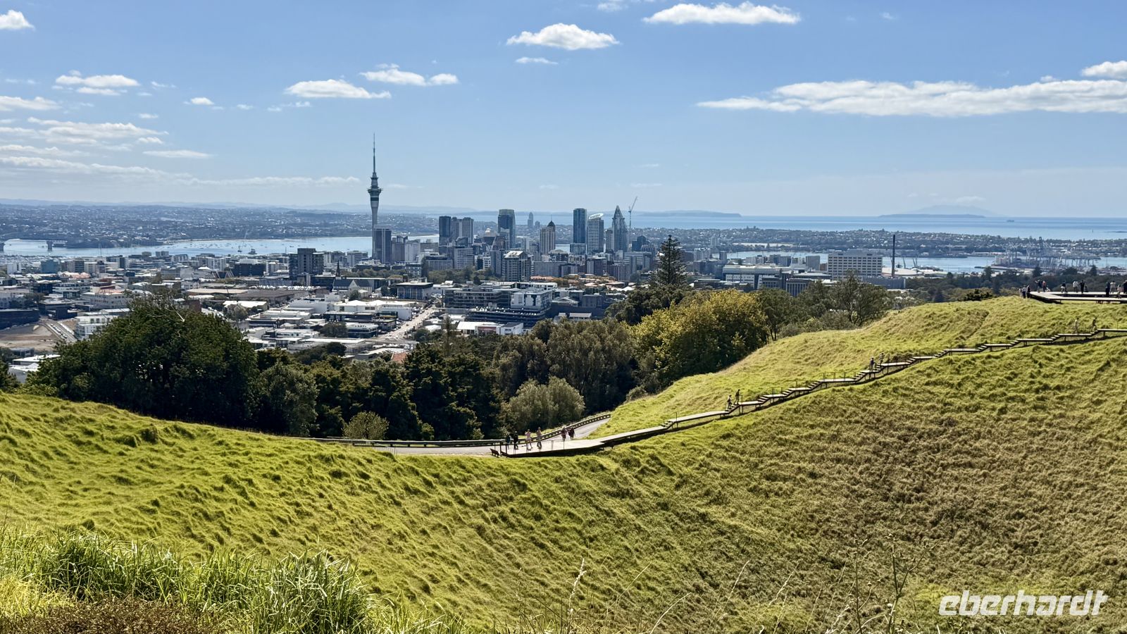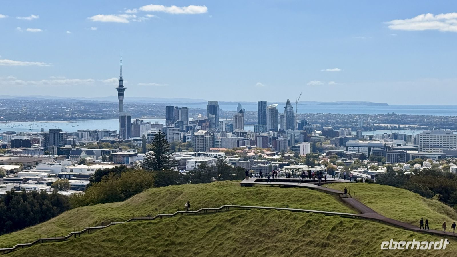 Danach ging es hinauf auf den Mount Eden, einen erloschenen Vulkan und mit 196 Metern einer der höchsten Punkte der Stadt. Von hier aus hatten wir einen atemberaubenden Rundumblick über Auckland – bei bestem Wetter konnten wir die Weite der Stadt und die umliegenden Buchten besonders gut erkennen.