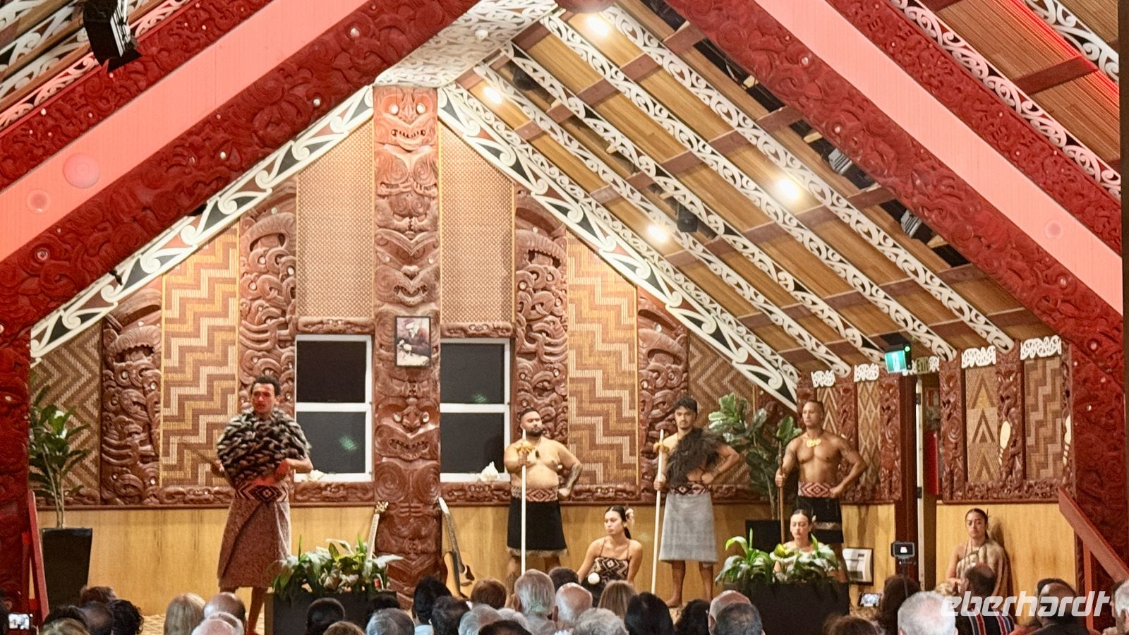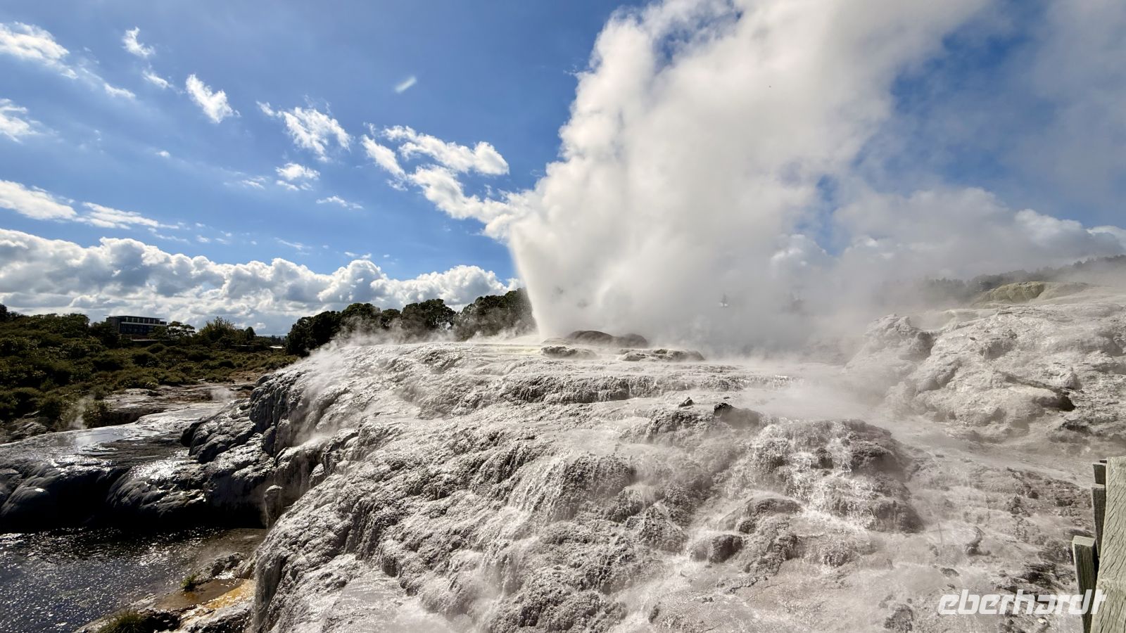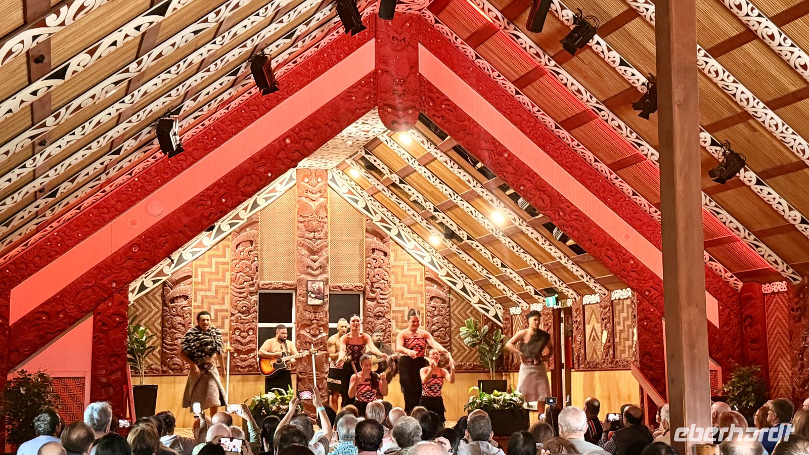Ein besonderes Highlight war der Besuch im Kiwi Center, wo wir tatsächlich drei Kiwi-Vögel sehen konnten – einer davon erst ein Jahr alt. Insgesamt gibt es heute nur noch etwa 6.800 Tiere, weshalb sie stark geschützt werden. Natürlich durften auch die geothermischen Besonderheiten Rotoruas nicht fehlen: Wir sahen blubbernde Schlammlöcher und beeindruckende Geysire, die regelmäßig heiße Wasserfontänen in die Luft schießen – ein faszinierendes Naturschauspiel. Zum Abschluss genossen wir ein traditionelles Hangi, ein Māori-Essen, das in einem Erdofen gegart wird. Fleisch und Gemüse werden dabei langsam unter der Erde gegart, was den Speisen ein ganz besonderes Aroma verleiht. Viele Gäste nutzten anschließend noch die Gelegenheit, im Souvenirshop zu stöbern, bevor unser erlebnisreicher Ausflug endete und wir zurück zum Hafen fuhren.