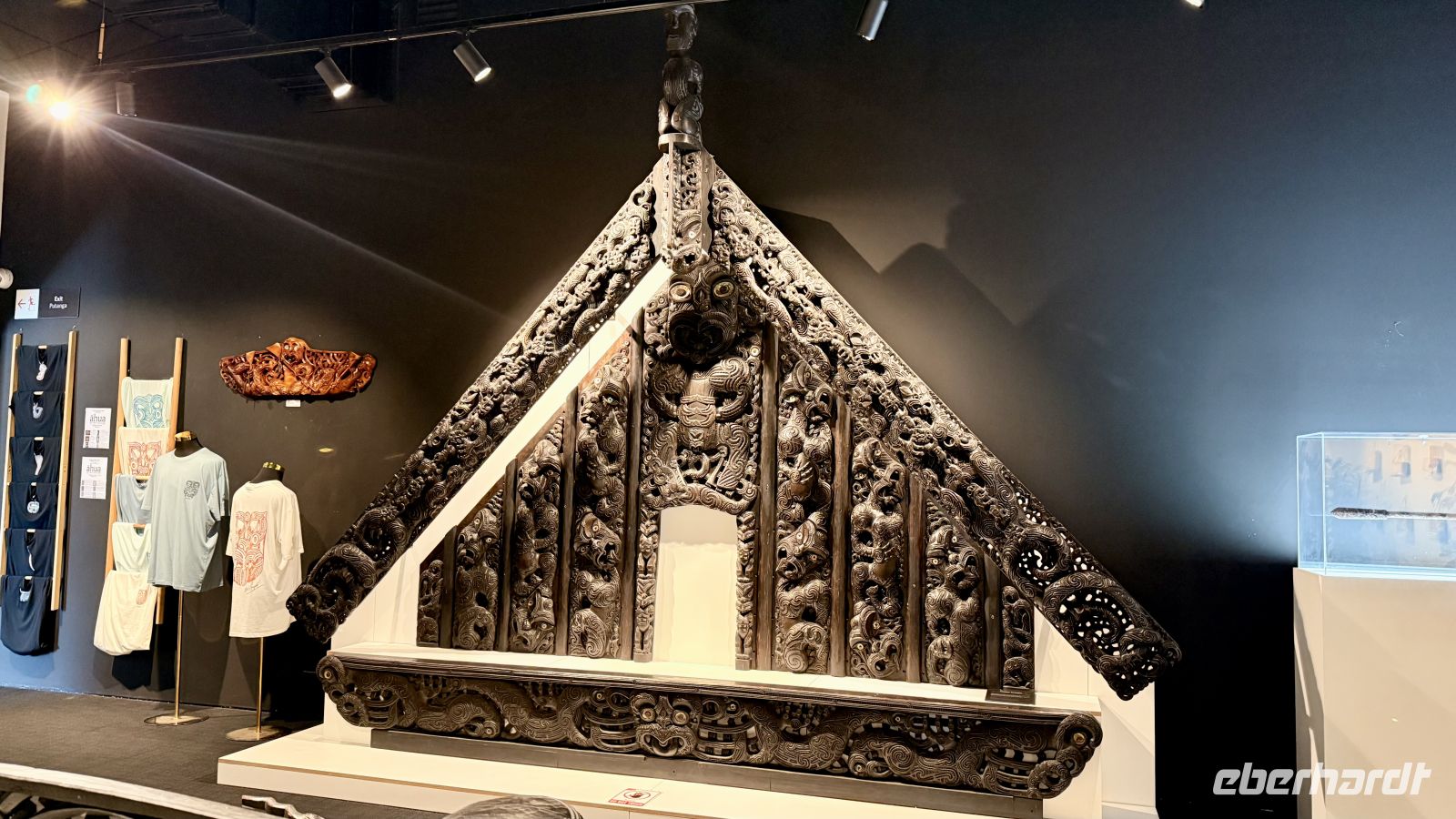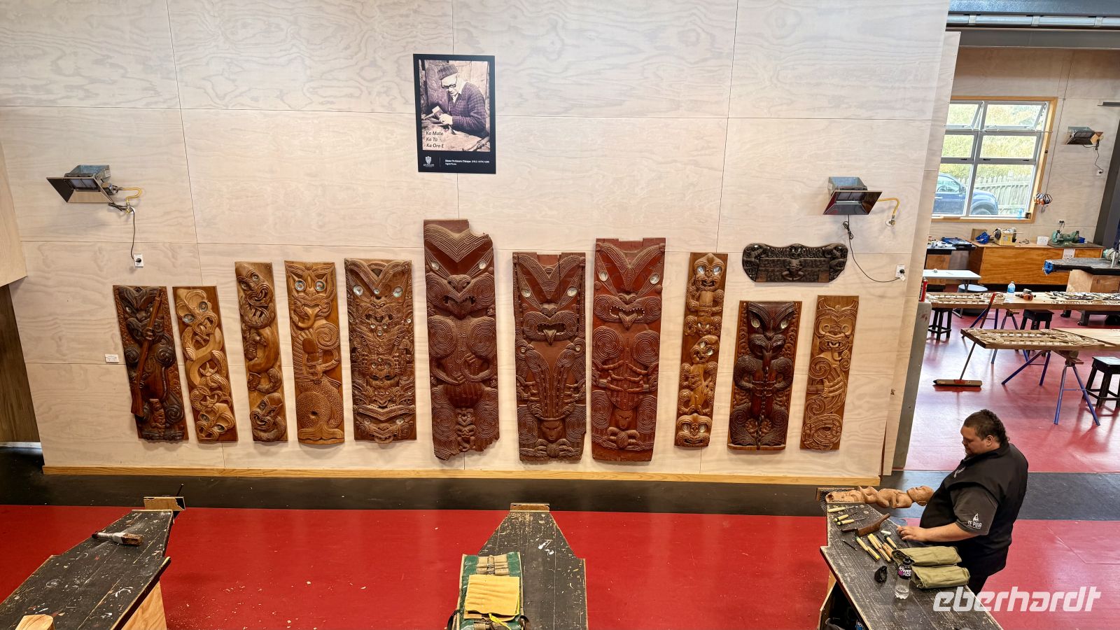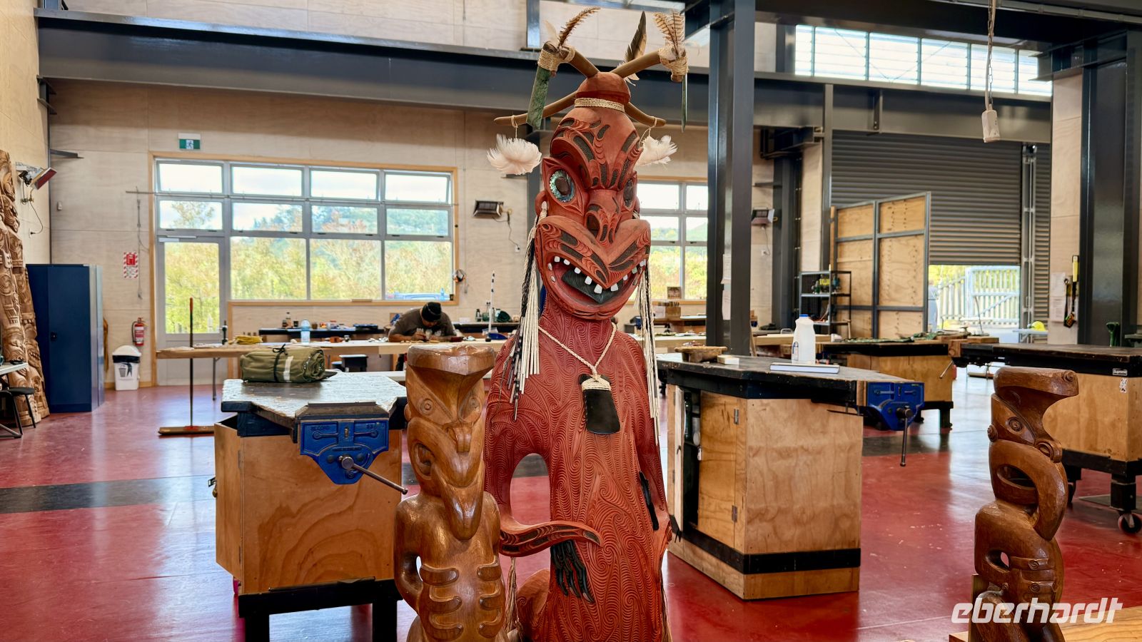 In Rotorua angekommen, besuchten wir das Kulturzentrum Te Puia, ein bedeutendes Zentrum der Māori-Kultur. Dort wurden wir mit einer traditionellen Willkommenszeremonie empfangen. Dabei wurde symbolisch ein Farnzweig aufgehoben – ein Zeichen dafür, dass wir in Frieden kommen. Anschließend beeindruckten uns die Māori mit traditionellen Tänzen, Gesängen und dem berühmten Haka. Im Kulturzentrum erhielten wir spannende Einblicke in die Schnitzkunst der Māori. Die Ausbildung dauert hier etwa zwei Jahre. Verwendet werden Materialien wie Holz, Stein und sogar Walknochen. Jede Schnitzerei erzählt eine Geschichte und repräsentiert oft einzelne Stämme. Auch die Pflanze Flax spielt eine wichtige Rolle – sie wird für Kleidung, Taschen und sogar zum Isolieren von Häusern genutzt.
