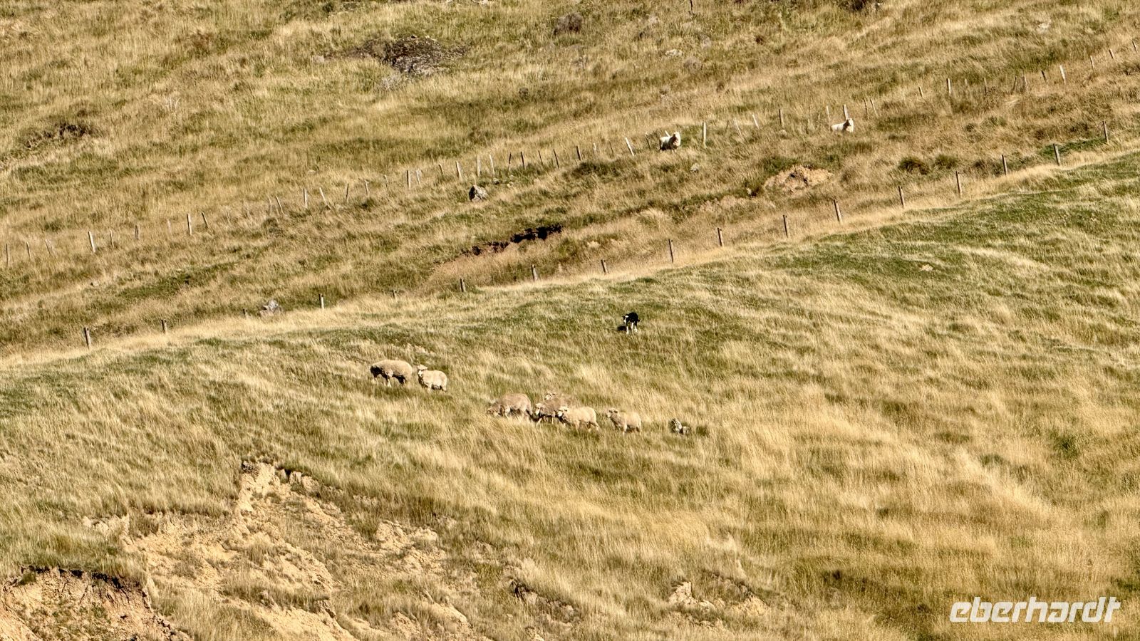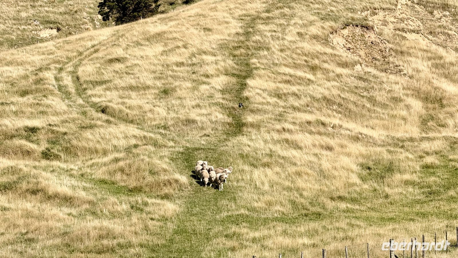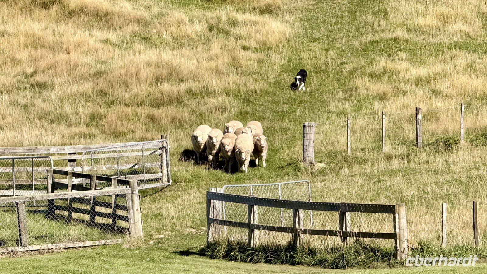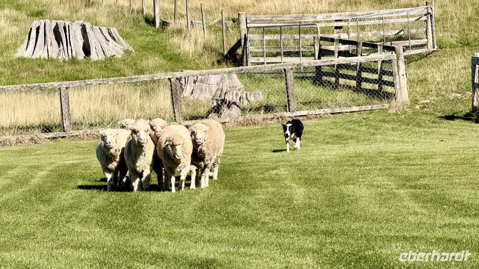 Ein weiteres Highlight war das Hüten der Schafe mit speziell trainierten Hütehunden. Bereits im Alter von etwa fünf Monaten beginnen die Hunde mit dem Training. Durch gezielte Pfeifsignale können sie nach rechts oder links gelenkt werden und treiben die Schafe kontrolliert zusammen – ein faszinierendes Zusammenspiel zwischen Mensch, Tier und Natur. Auf der Farm sahen wir auch die Wassertanks, die meist auf den Hügeln stehen und die Versorgung sicherstellen.