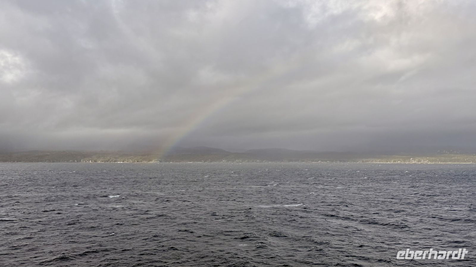 Am Dusky Sound erwartete uns dann typisches Fjordland-Wetter mit Regen – doch genau das gehört hier dazu, denn die Region zählt zu den regenreichsten Gegenden der Welt. Als krönenden Abschluss wurden wir jedoch mit einem wunderschönen Regenbogen belohnt, der sich über die dramatische Landschaft spannte – ein unvergesslicher Moment.