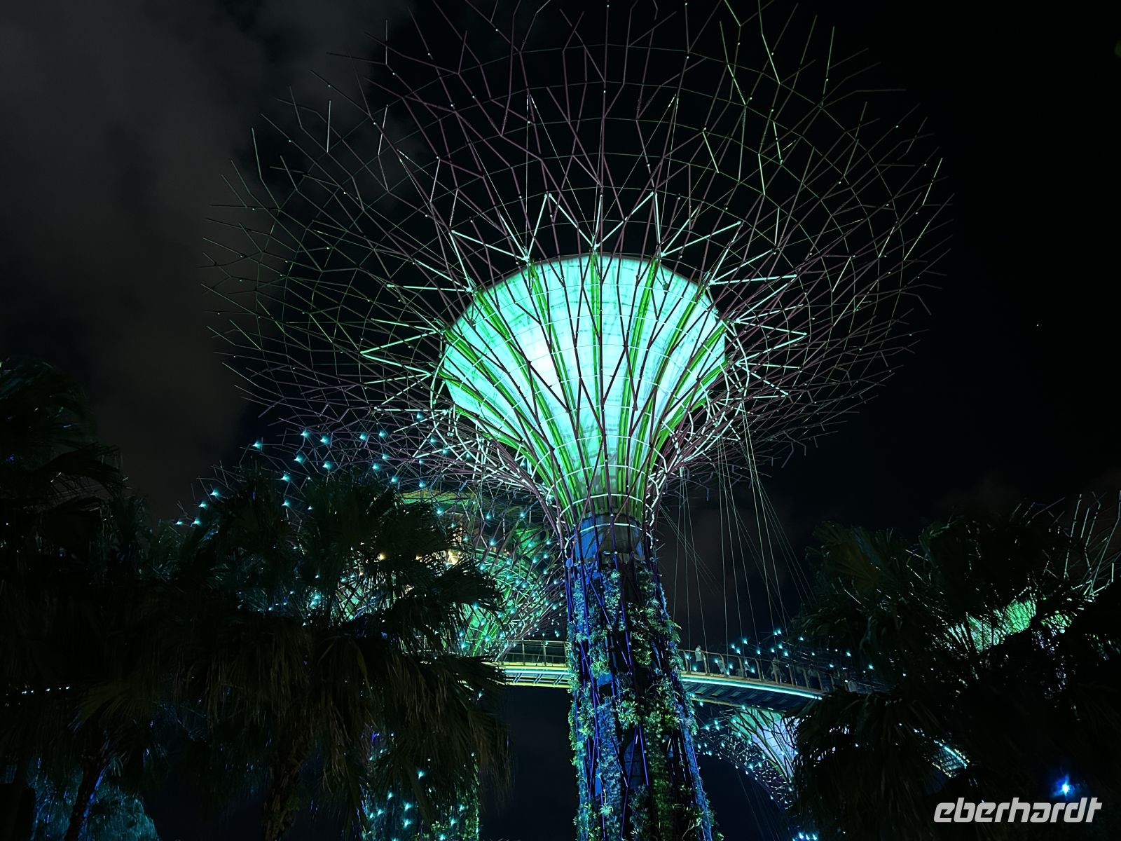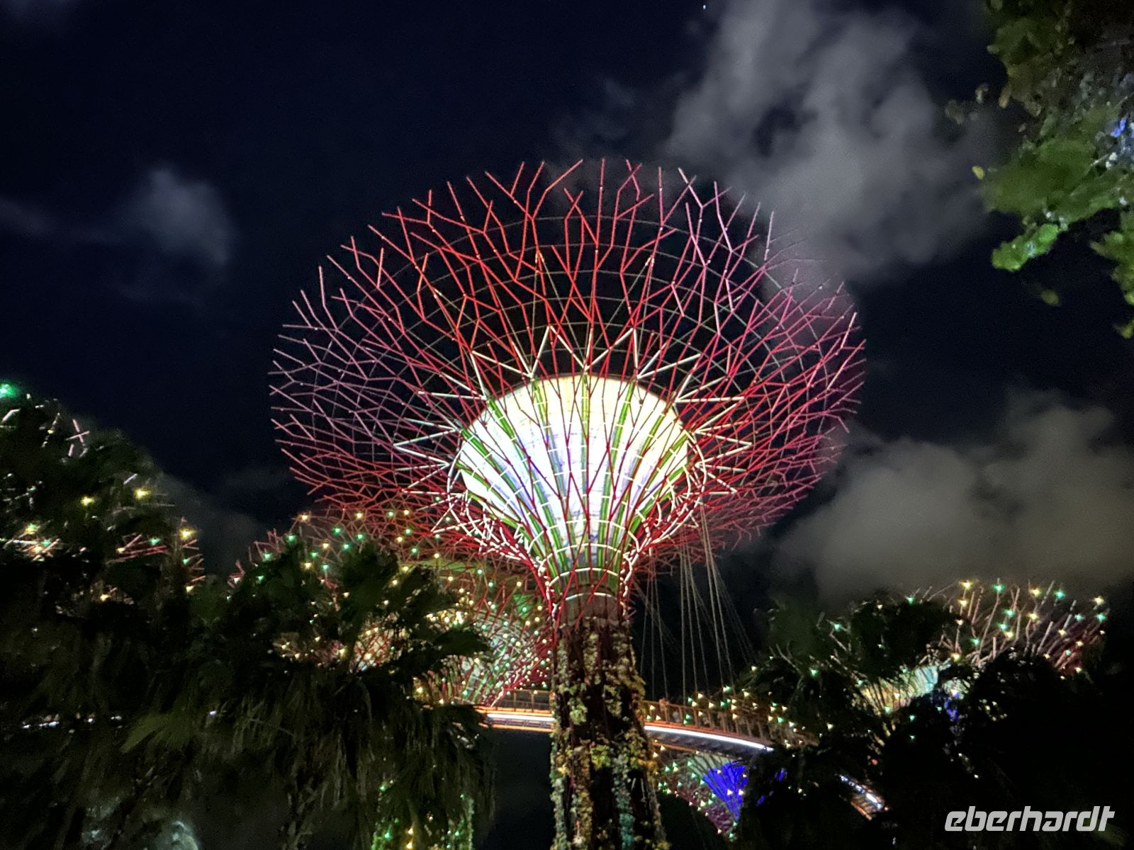 Nach ca. 12 Stunden Flugzeit landen wir hier auch schließlich. Durch die Einreiseschaltet am Flughafen sind wir in windeseile durch, da alles komplett automatisiert läuft. Begrüßt werden wir von unserem Reiseleiter Achim, der vor 17 Jahren von Deutschland nach Singapur ausgewandert ist. Begrüßt werden wir außerdem von tropisch, schwülwarmen 32 Grad. Im Hotel angekommen checken wir in unserem komfortablen und zentral gelegenen Hotel ein. Am Abend verabreden wir uns, um gemeinsam die Licht-und Wassershow am berühmten Marina Bay Sands Hotel anzuschauen. Der Weg dorthin bürgt aber einige Herausforderungen, denn mit uns sind auch 3 große Kreuzfahrtschiffe angekommen. Entsprechend viele Menschen strömen zu zu den abendlichen Attraktionen. Das ist aber kein Problem für uns, denn wir bahnen uns unseren Weg und kommen schließlich auf die Minute zur traumhaft schönen Lichter und Wassershow an. Ganz beeindruckt von diesem Spektakel machen wir uns auf zu einem weiteren Highlight, den Super Trees by Gardens by the Bay. Hier werden gigantische Bäume in verschiedenen Farben angestrahlt und musikalisch begleitet. Ein muss, wenn man in Singapur ist. Langsam macht sich ein kleiner Hunger bemerkbar, deswegen laufen wir zurück in das Marina Bay Sands und lassen es uns dort im Foodcourt ordentlich schmecken. Wieder im Hotel angekommen, fallen wir müde aber glücklich in unsere Betten.