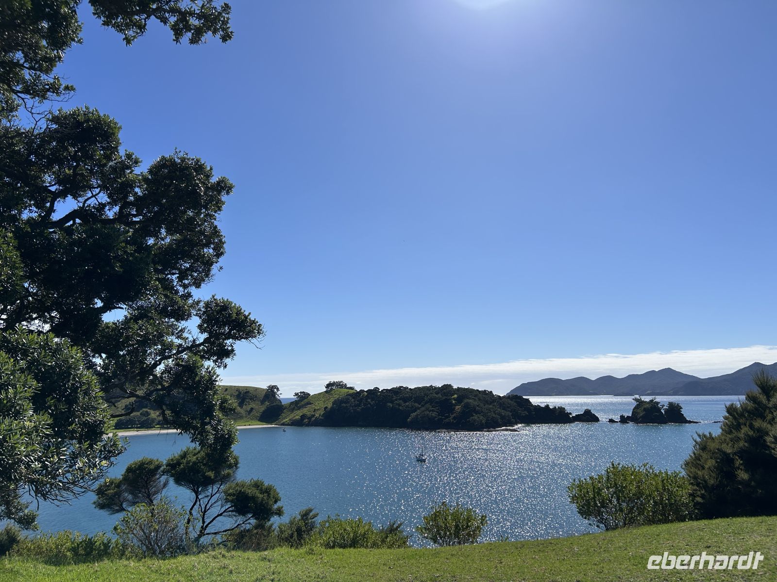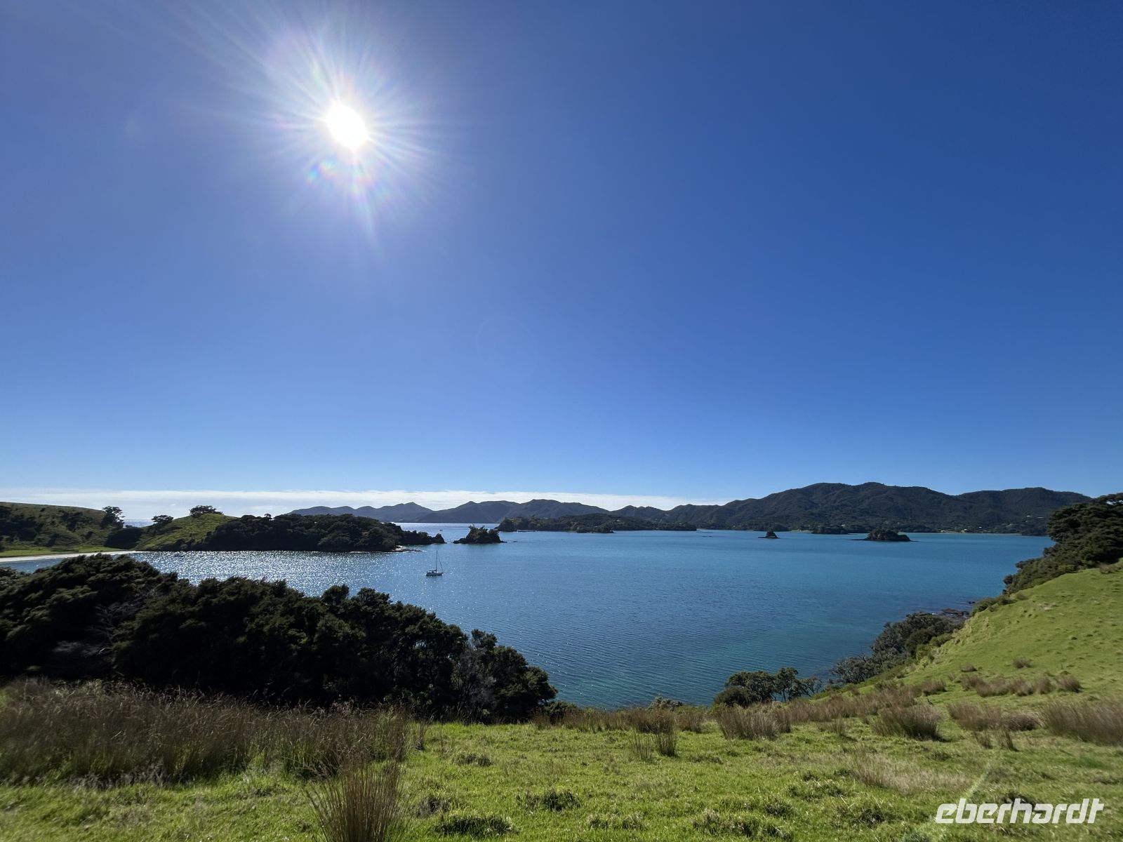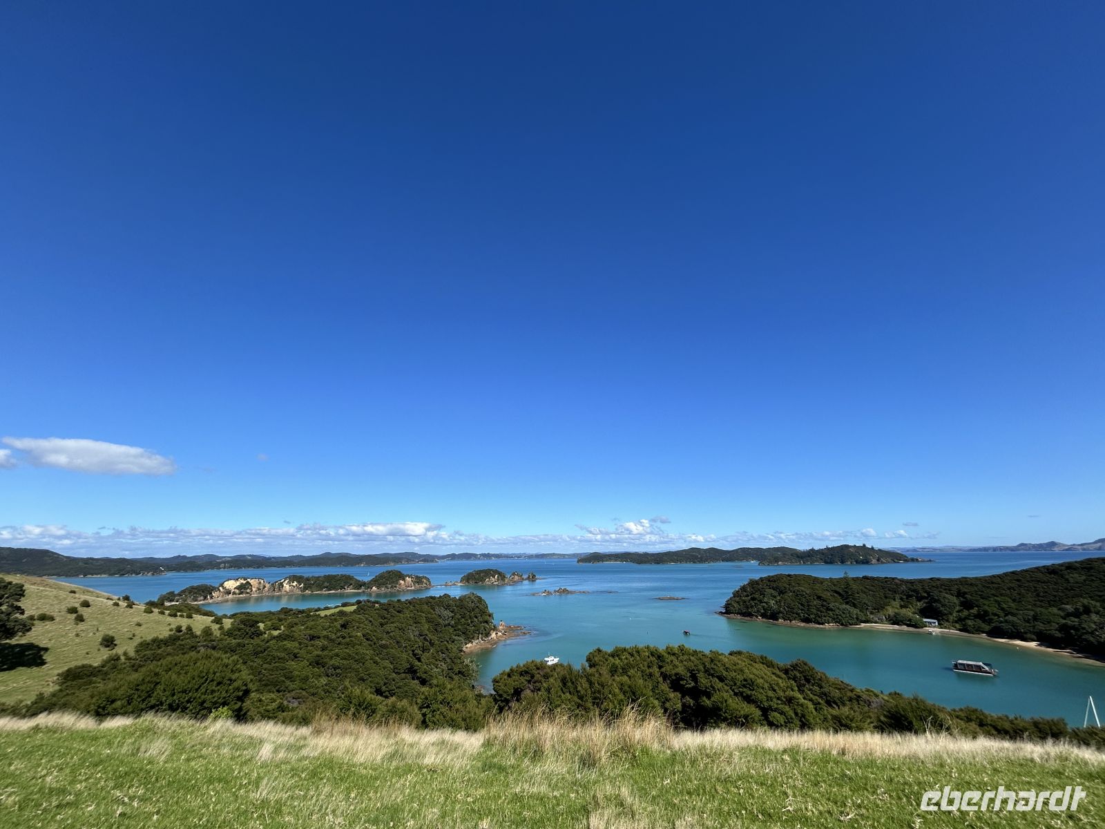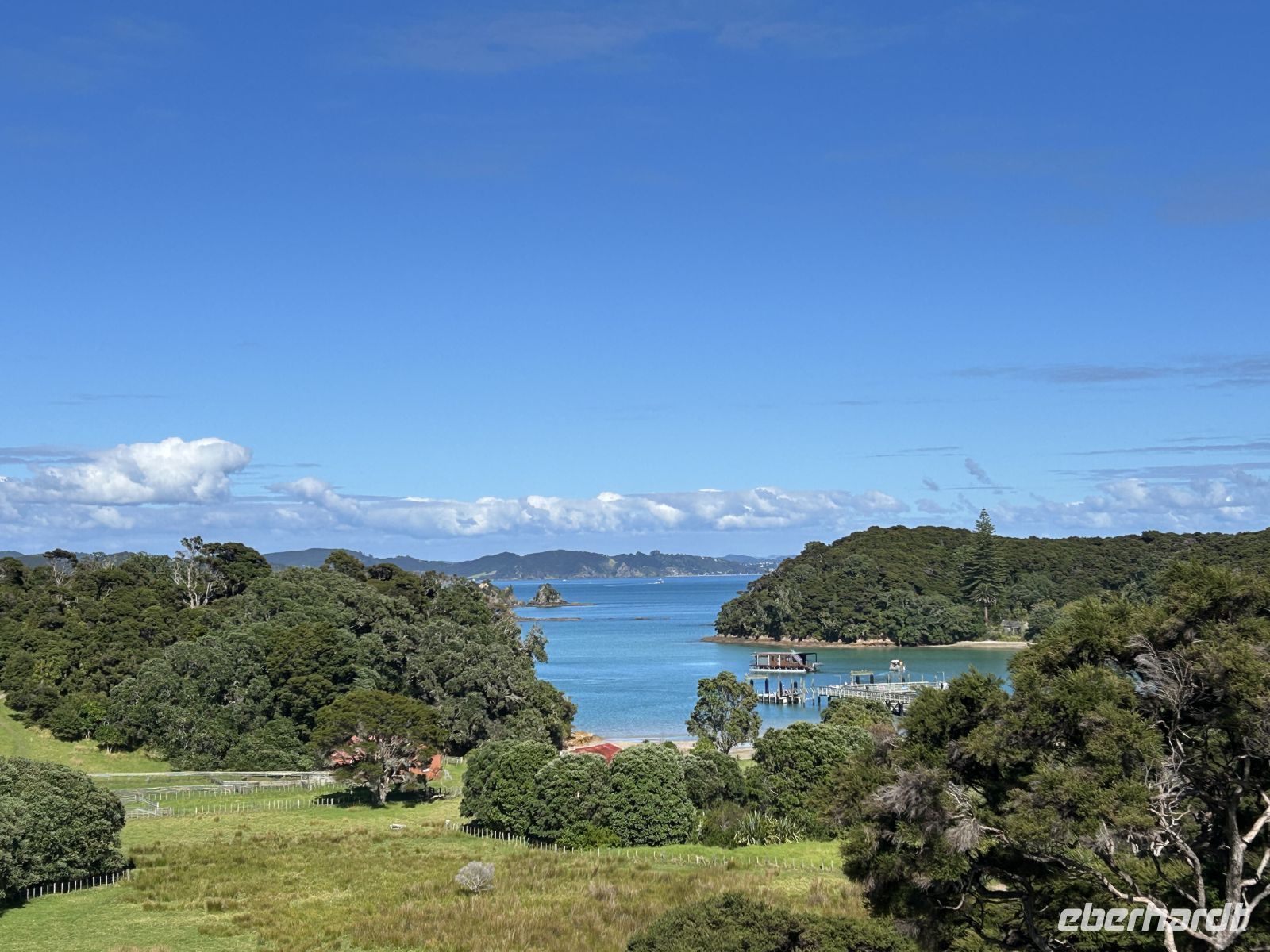 Wenig später machen wir uns auf zum nahegelegen Schiffsanleger und besteigen unser heutiges Gefährt. Wir sichern uns natürlich gleich ein paar Plätze auf dem Oberdeck um die herrliche Aussicht genießen zu können. Während der Fahrt halten wir Ausschau nach Delfinen oder Robben, jedoch haben wir heute leider kein Glück die putzigen Gesellen zu Gesicht zu bekommen. Dies ist aber überhaupt nicht schlimm, denn wir nähern uns bereits dem Highlight des Tages, den Hole in the Rock. Ein von Wellen geschlagenes Loch durch eine Felseninsel. Das Loch hat einen Durchmesser von ca. 17 Metern und ist das Fotomotiv schlechthin. Wir schippern weiter durch die herrliche Inselwelt und traumhaften Buchten. Auf einer dieser Inseln, Urupukapuka Island gehen wir schließlich an Land. Ein entspannter Spaziergang führt uns hinauf auf einen Hügel, und oben erwartet uns ein Ausblick, der uns den Atem raubt: die Otehei Bay, umgeben von weiteren Inseln, die sich am Horizont verlieren. Das Wasser leuchtet in intensivem Türkis – fast zu schön, um real zu sein. Am frühen Nachmittag, gegen 13 Uhr, kehren wir nach Paihia zurück. Der Tag war so reich an Eindrücken, dass wir ihn ruhig ausklingen lassen