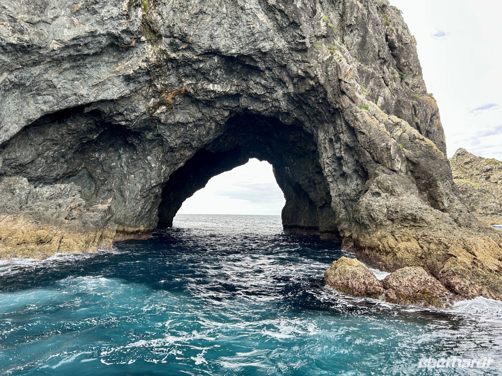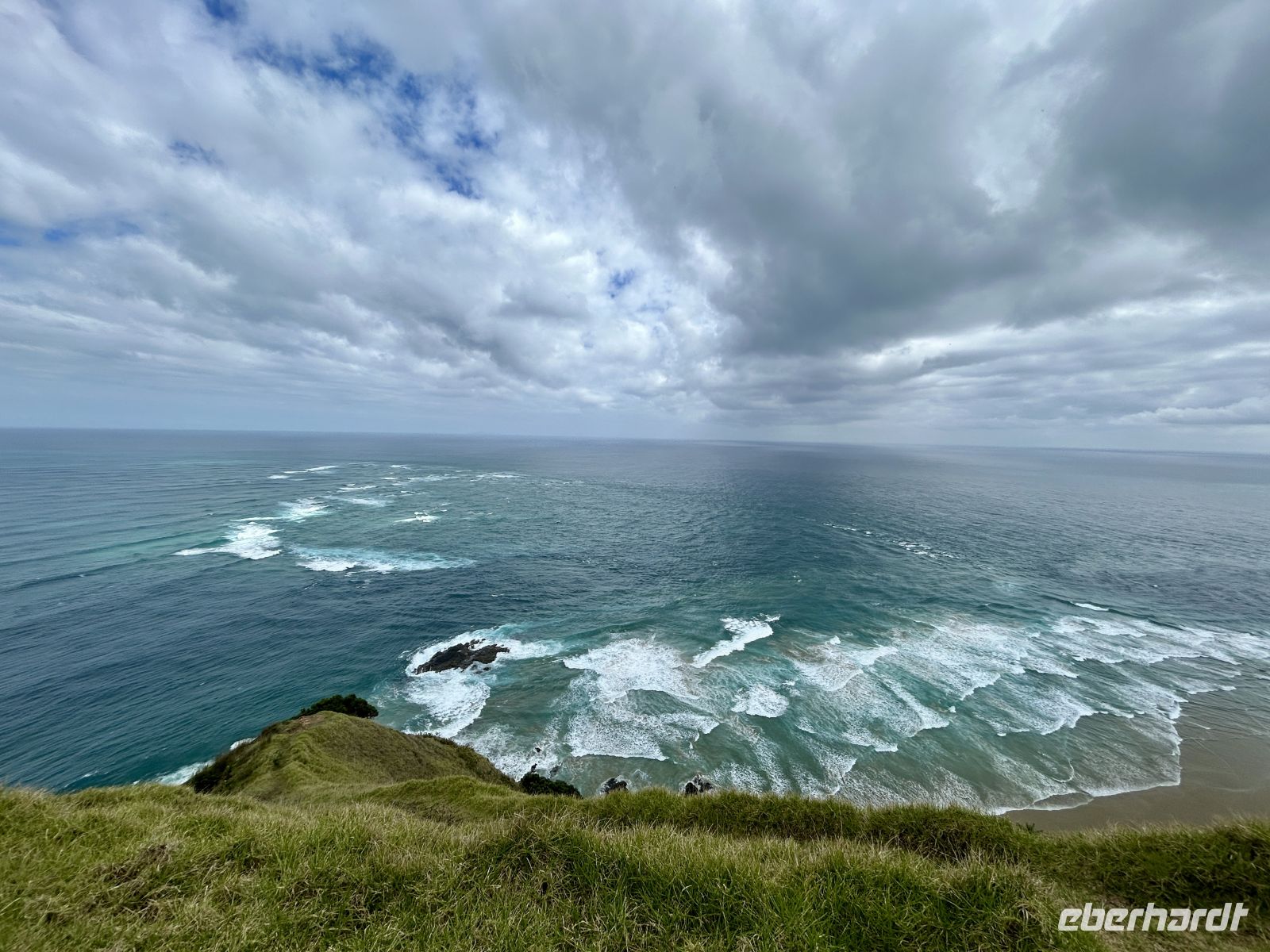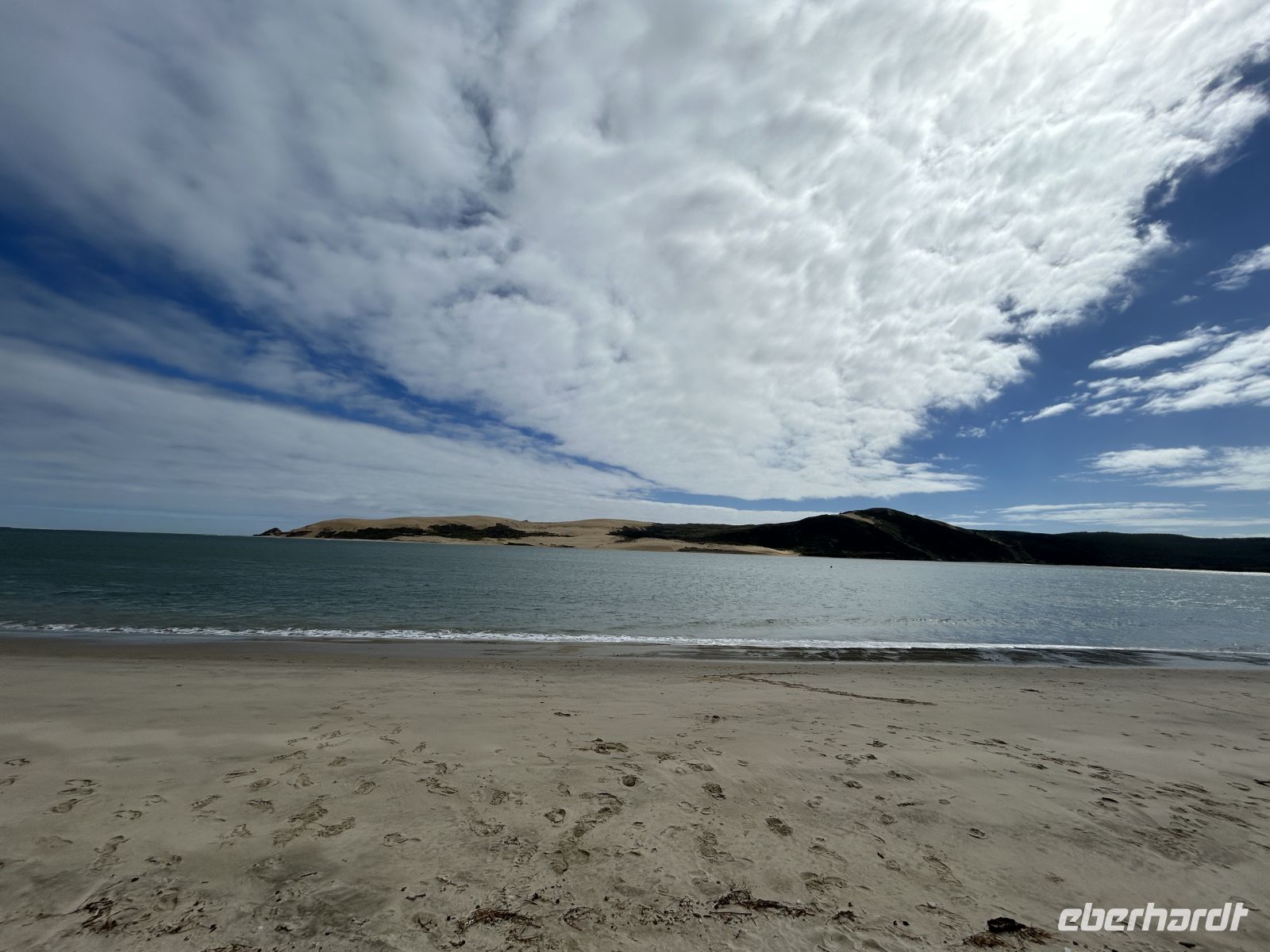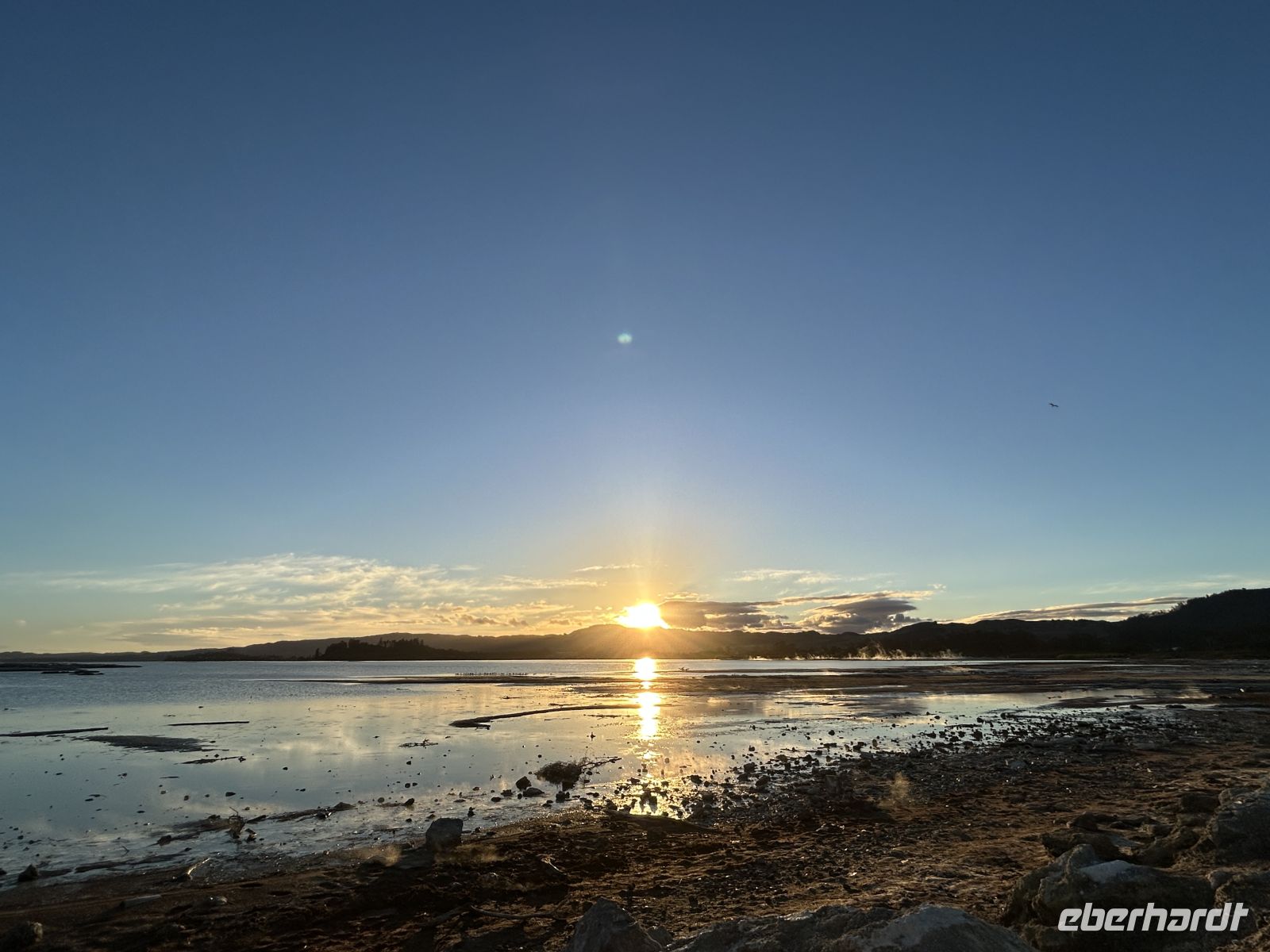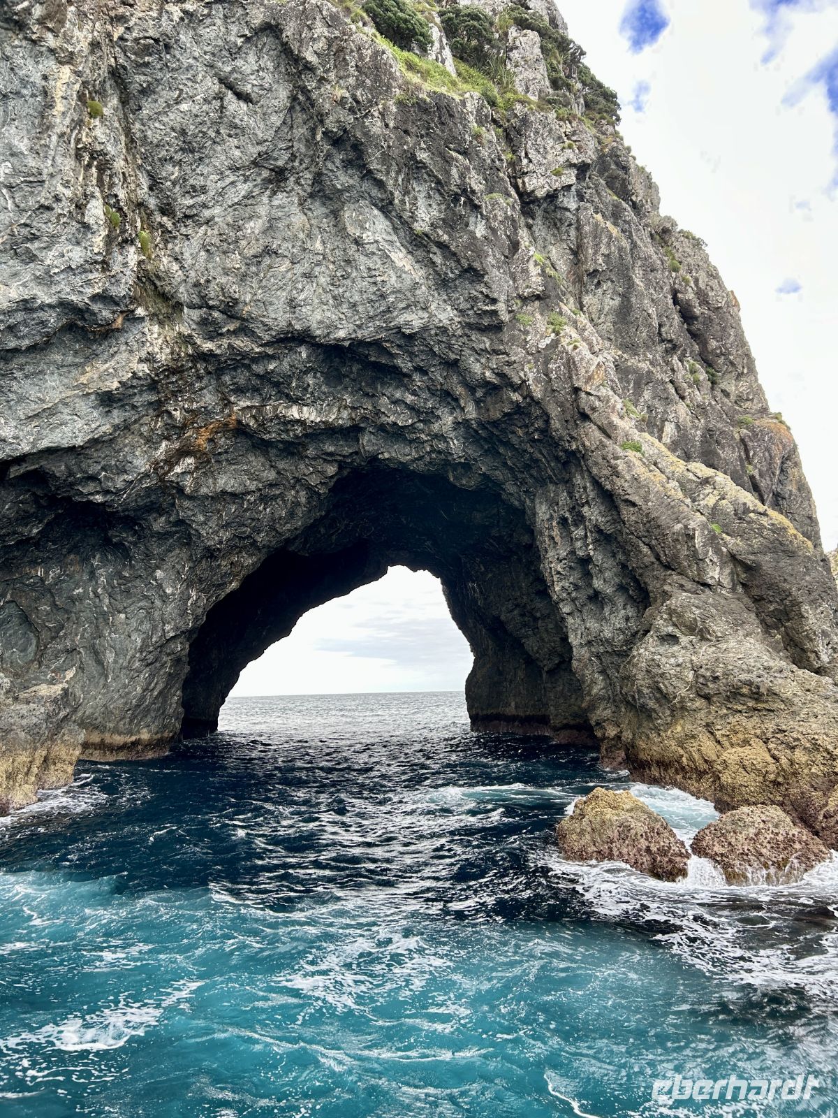Wenig später machen wir uns auf zum nahegelegen Schiffsanleger und besteigen unser heutiges Gefährt. Wir sichern uns natürlich gleich ein paar Plätze auf dem Oberdeck um die herrliche Aussicht genießen zu können. Während der Fahrt halten wir Ausschau nach Delfinen oder Robben, jedoch haben wir heute leider kein Glück die putzigen Gesellen zu Gesicht zu bekommen. Dies ist aber überhaupt nicht schlimm, denn wir nähern uns bereits dem Highlight des Tages, den Hole in the Rock. Ein von Wellen geschlagenes Loch durch eine Felseninsel. Das Loch hat einen Durchmesser von ca. 17 Metern und ist das Fotomotiv schlechthin. Wir schippern weiter durch die herrliche Inselwelt und traumhaften Buchten. Auf einer dieser Inseln, Urupukapuka Island gehen wir schließlich an Land. Ein entspannter Spaziergang führt uns hinauf auf einen Hügel, und oben erwartet uns ein Ausblick, der uns den Atem raubt: die Otehei Bay, umgeben von weiteren Inseln, die sich am Horizont verlieren. Das Wasser leuchtet in intensivem Türkis – fast zu schön, um real zu sein. Am frühen Nachmittag, gegen 13 Uhr, kehren wir nach Paihia zurück. Der Tag war so reich an Eindrücken, dass wir ihn ruhig ausklingen lassen