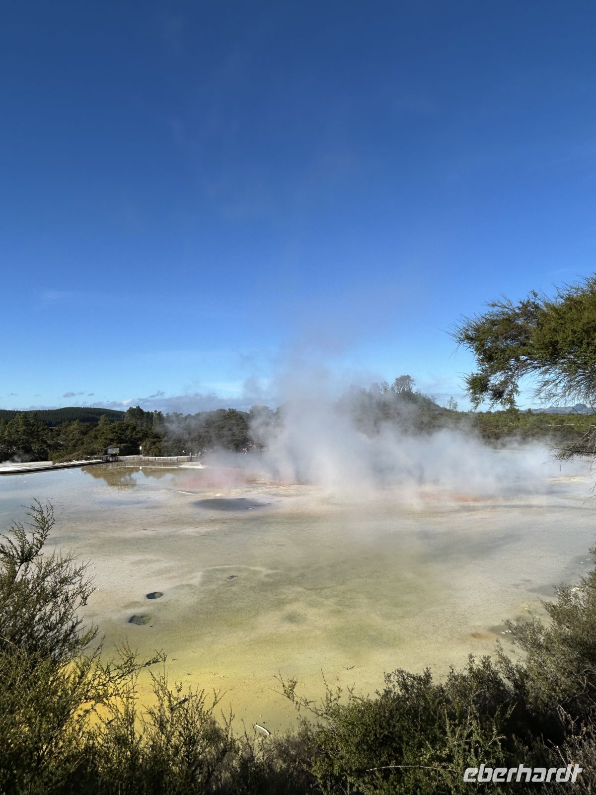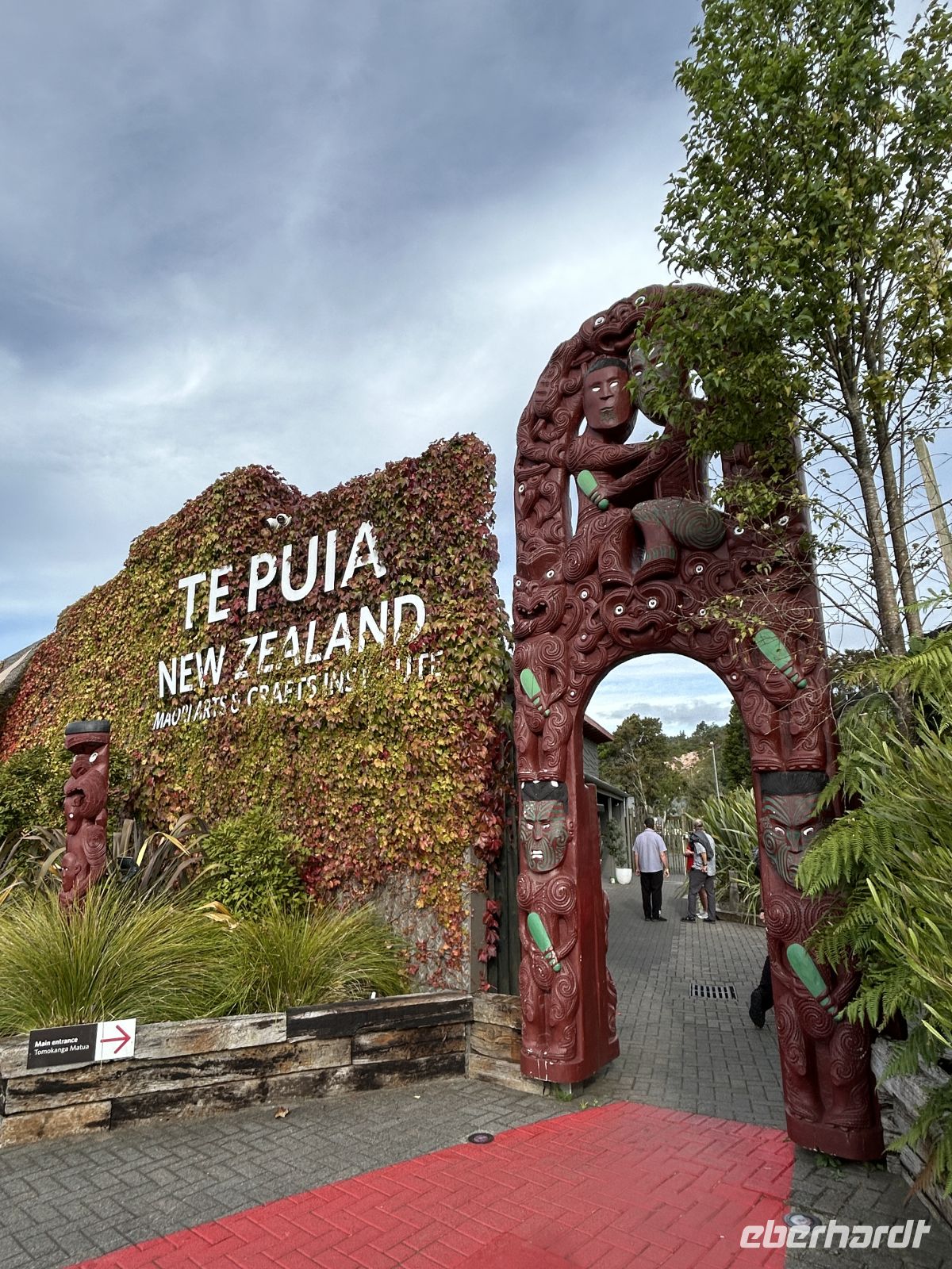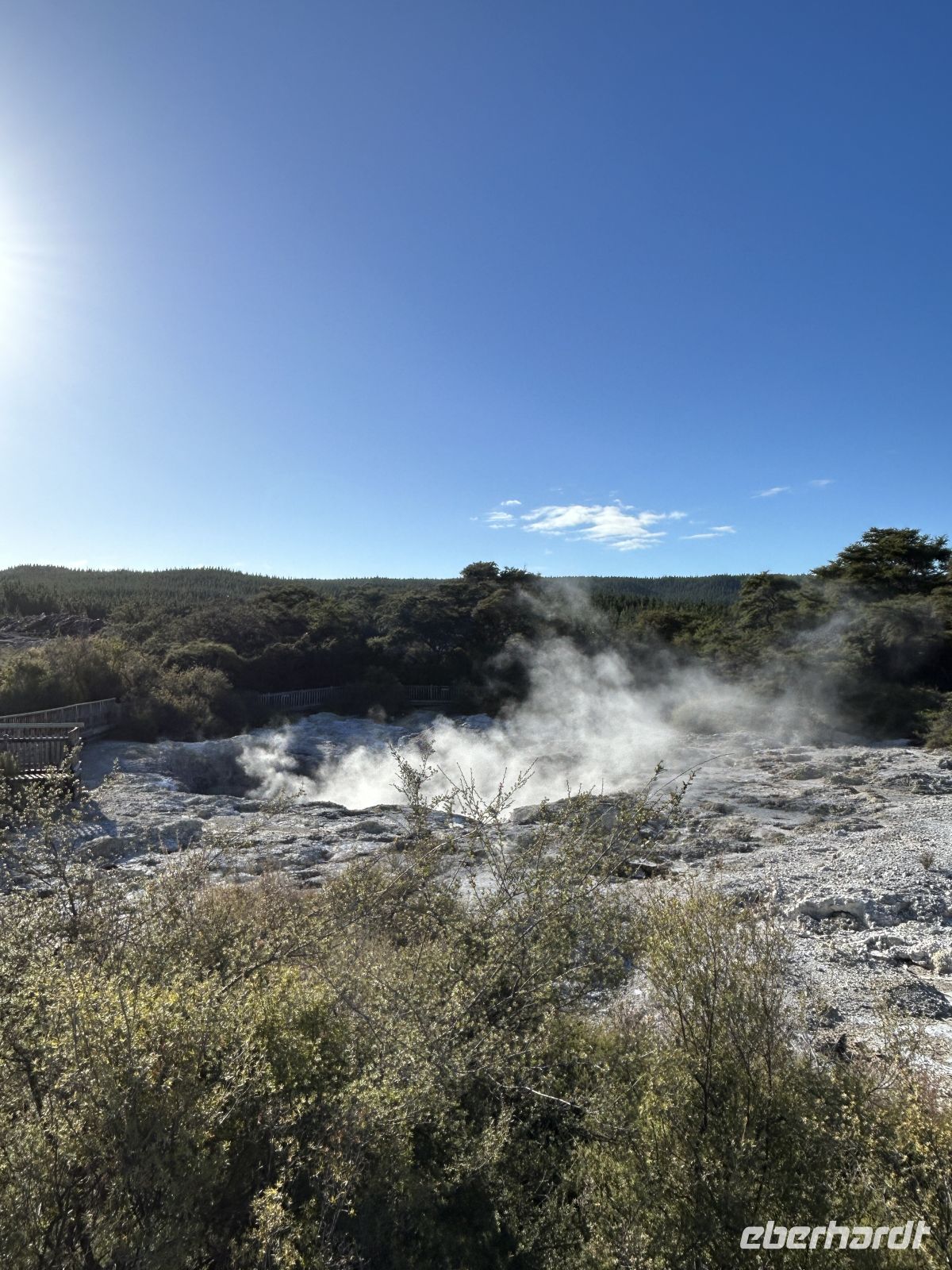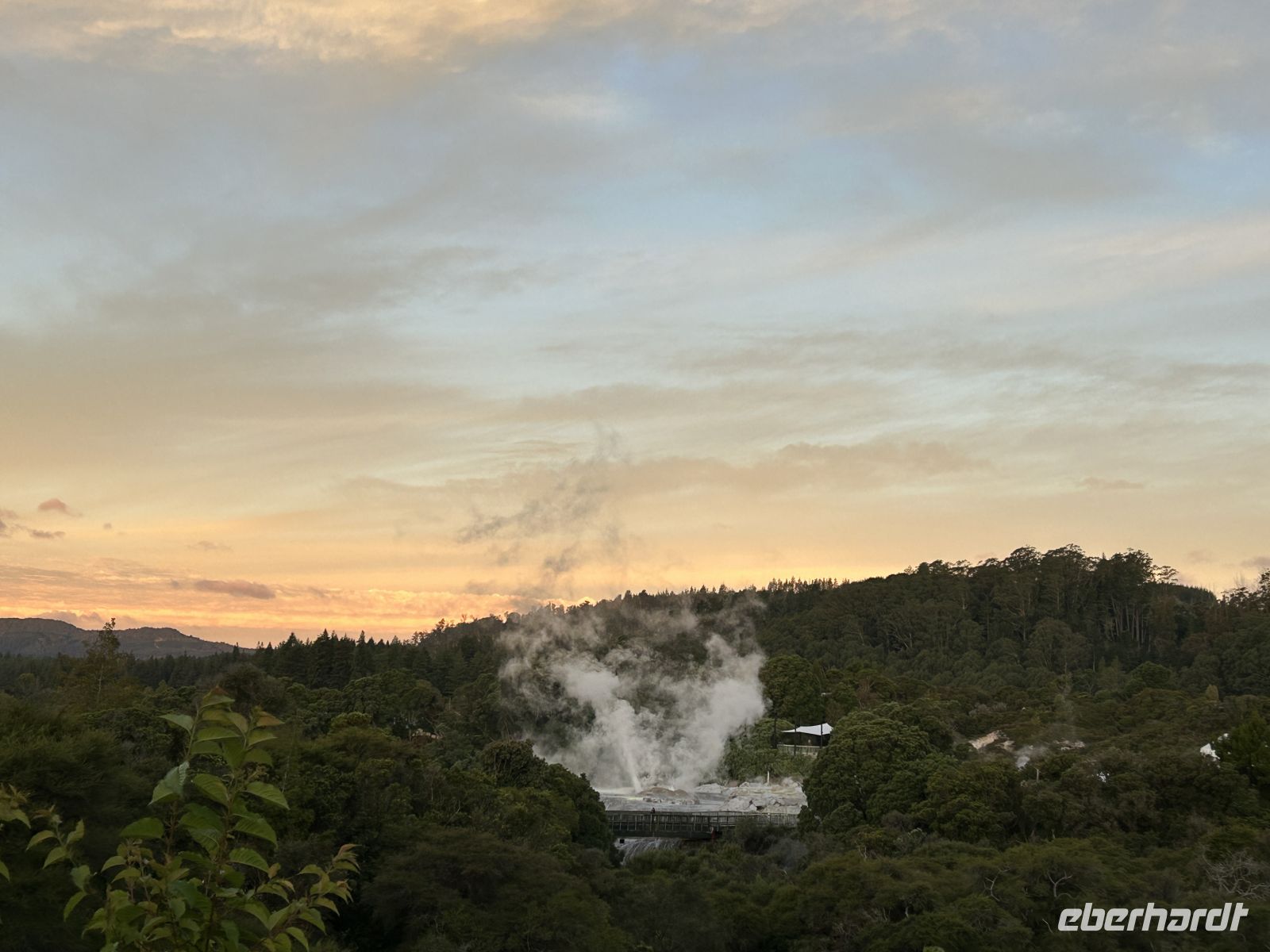 Heute führt uns unsere Reise weiter nach Rotorua. Unseren ersten Stopp machen wir an der berühmten Toilette, welche von Friedensreich Hundertwasser eigenhändig erbaut wurde. Von 1973 bis zu seinem Tod 2000 lebte der Künstler in Kawakawa. Als Zeichen seiner Liebe für die Stadt errichtetet er indem für ihn typischen Stil mit geschwungenen Linien, unregelmäßigen Keramikfliesen, integrierten Kleinskulpturen, farbigen Gläsern und einem in die Architektur einbezogenen Baum gestaltet. Im Jahr 1999 wurde das stille Örtchen eröffnet. Unsere Fahrt für uns immer weiter und weiter bis wir schließlich endlich in Rotorua, der Geothermalregion ankommen wo wir die Nacht verbringen werden. Bereits beim aussteigen aus dem Bus wedelt uns ein schwefeliger Duft um die Nase. Das ist aber vollkommen normal hier in der Gegend, denn die Geysire der haben Schwefelablagerungen was den Geruch zur Folge hat. Den Abend verbringen wir in Te Puia bei einem klassischen Hangi Abendessen. Zu Beginn der Veranstaltung werden wir Teil einer traditionellen und zu gleich beeindruckenden Willkommenszeremonie am Meetinghaus der Maori. Im ersten Moment wirkt das ganze Spektakel etwas befremdlich, da während der Zeremonie des Öfteren die Zunge rausgestreckt wird und die Augen ganz weit aufgerissen werden. Anschließend werden uns traditionelle Tänze und Kampftechniken mit musikalischer Umrahmung vorgeführt. Als krönender Abschluss wird uns uns ein schmackhaftes Hangi Essen kredenzt. Es war unglaublich lecker. Frischer Fisch, Austern, verschiedene Fleischspeisen und ein Dessertbuffet lassen unsere Herzen höher schlagen.