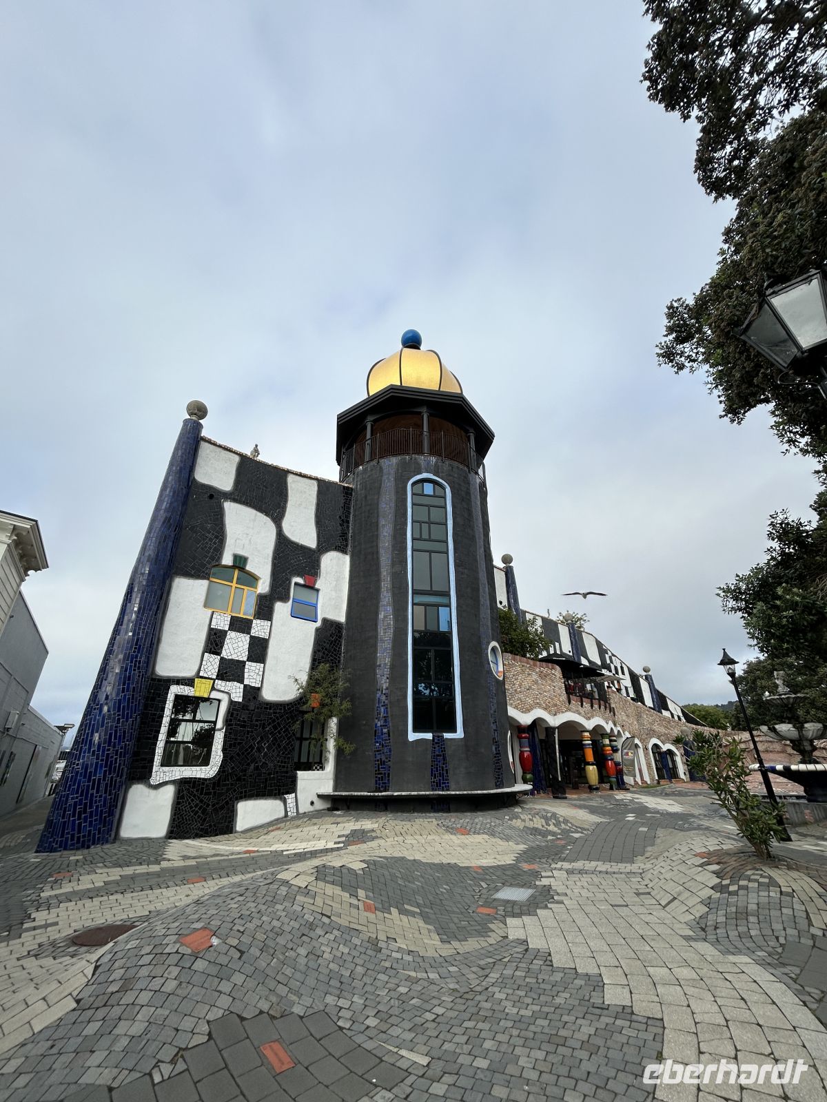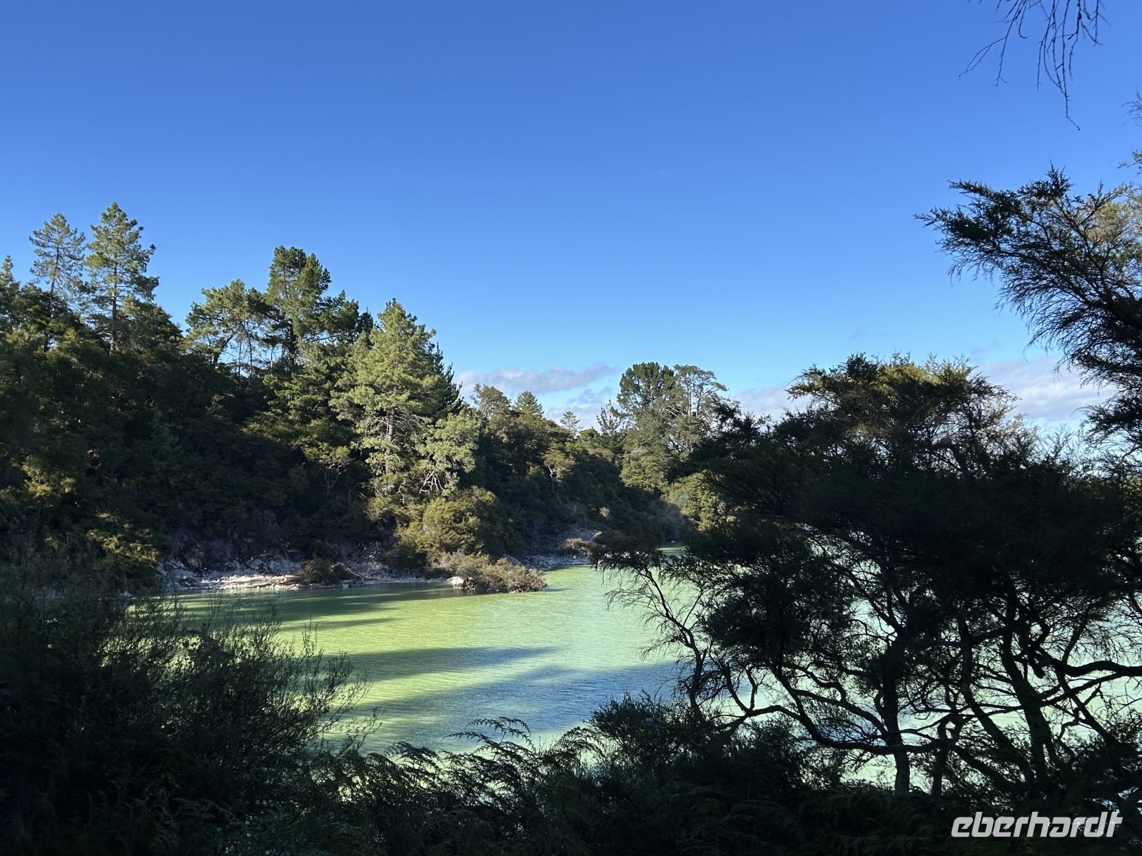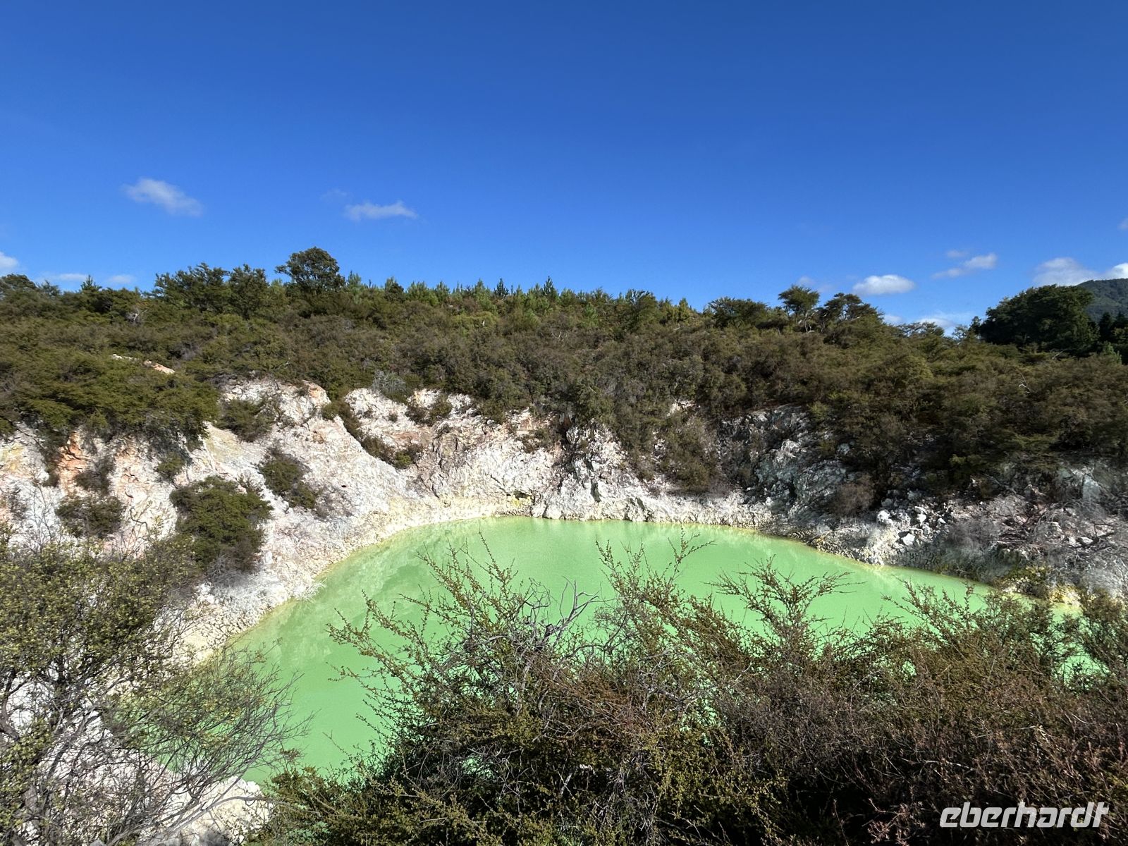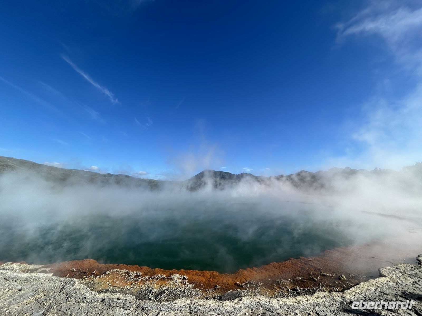 Heute führt uns unsere Reise weiter nach Rotorua. Unseren ersten Stopp machen wir an der berühmten Toilette, welche von Friedensreich Hundertwasser eigenhändig erbaut wurde. Von 1973 bis zu seinem Tod 2000 lebte der Künstler in Kawakawa. Als Zeichen seiner Liebe für die Stadt errichtetet er indem für ihn typischen Stil mit geschwungenen Linien, unregelmäßigen Keramikfliesen, integrierten Kleinskulpturen, farbigen Gläsern und einem in die Architektur einbezogenen Baum gestaltet. Im Jahr 1999 wurde das stille Örtchen eröffnet. Unsere Fahrt für uns immer weiter und weiter bis wir schließlich endlich in Rotorua, der Geothermalregion ankommen wo wir die Nacht verbringen werden. Bereits beim aussteigen aus dem Bus wedelt uns ein schwefeliger Duft um die Nase. Das ist aber vollkommen normal hier in der Gegend, denn die Geysire der haben Schwefelablagerungen was den Geruch zur Folge hat. Den Abend verbringen wir in Te Puia bei einem klassischen Hangi Abendessen. Zu Beginn der Veranstaltung werden wir Teil einer traditionellen und zu gleich beeindruckenden Willkommenszeremonie am Meetinghaus der Maori. Im ersten Moment wirkt das ganze Spektakel etwas befremdlich, da während der Zeremonie des Öfteren die Zunge rausgestreckt wird und die Augen ganz weit aufgerissen werden. Anschließend werden uns traditionelle Tänze und Kampftechniken mit musikalischer Umrahmung vorgeführt. Als krönender Abschluss wird uns uns ein schmackhaftes Hangi Essen kredenzt. Es war unglaublich lecker. Frischer Fisch, Austern, verschiedene Fleischspeisen und ein Dessertbuffet lassen unsere Herzen höher schlagen.