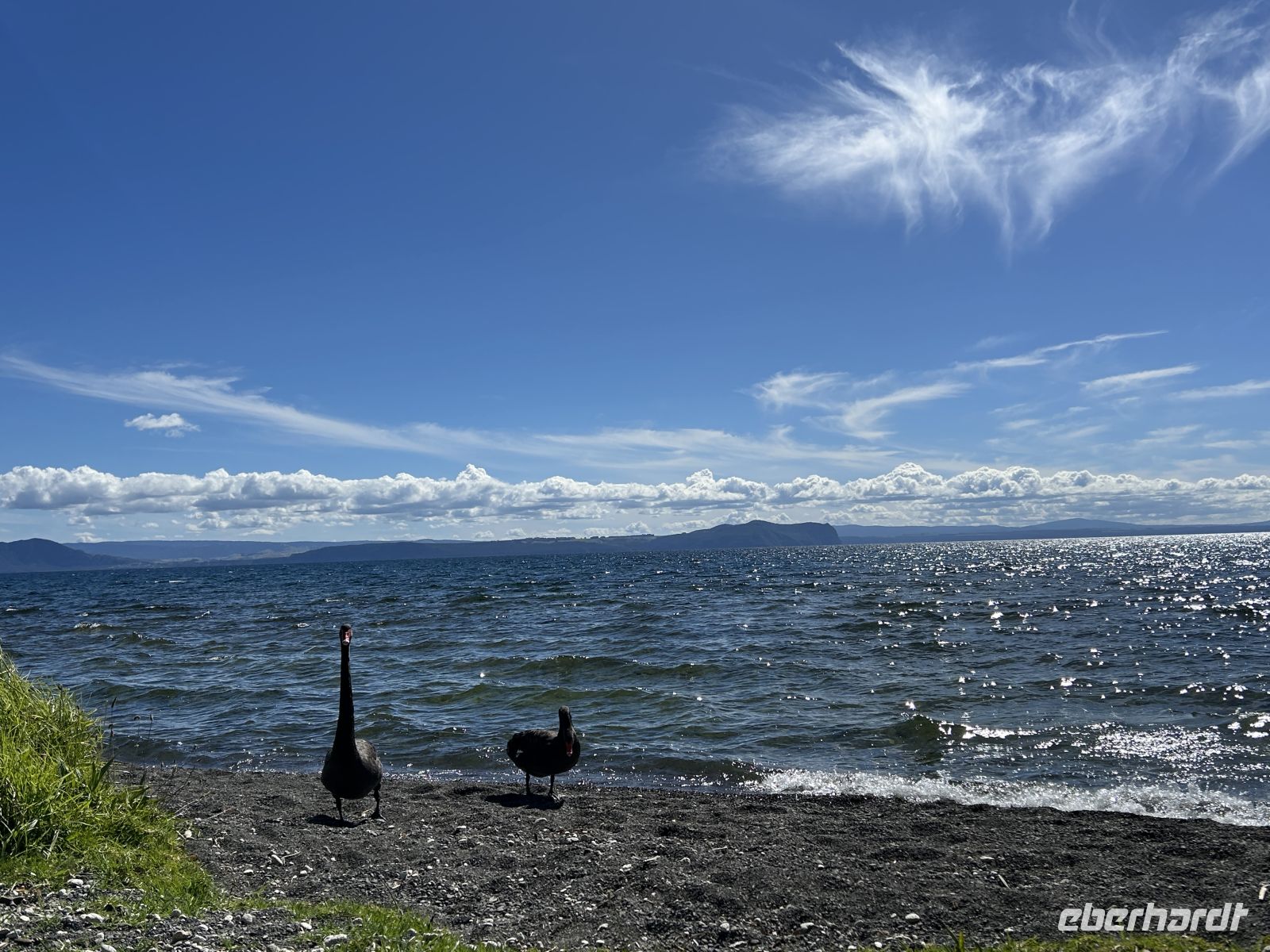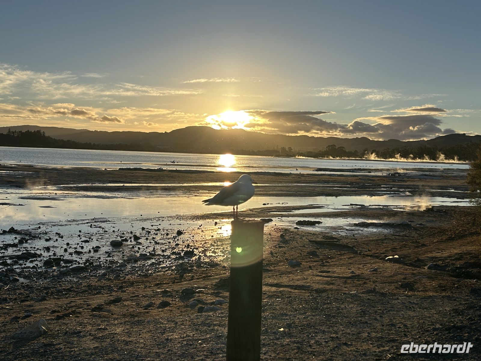 Heute ziehen wieder weiter in Richtung Süden. Zunächst aber machen wir einen Stopp am Lake Rotorua,wo ein herrlicher Sonnenaufgang auf uns wartet. Es scheint als hätten wir auch heute wieder Glück mit dem Wetter. Nach einer kleinen Stadtrundfahrt durch Rotorua setzten wir unsere Fahrt weiter zum Wai o Tapu Thermal Wunderland fort. Hier können wir uns ausgiebig die Füße bei einem Spaziergang durch den Thermalpark vertreten. Insgesamt ist es ein 18 km² großes und farbenfrohes geothermisches Gebiet auf Neuseelands Nordinsel in der Nähe von Rotorua. Verschiedene Pfade mit unterschiedlichen Schwierigkeitsgraden laden zum erkunden ein. Vor allem die blubbernden und dampfenden Schlammbecken sind ein Foto wert. An den schwefeligen Geruch gewöhnen wir uns zum Glück schnell. Weiter geht es Richtung Taupo,wo wir eine Mittagspause machen und das traumhafte Wetter genießen. Aufgrund der Wetterverhältnisse haben wir das Glück alle 3 Vulkane zu sehen. So einen Ausblick hat man selten. Vom Lake Taupo aus linkerhand ist der Ruapehu mit 2797 Metern und der Mitte ist der Ngauruhoe mit 2291 Metern, und der Vulkan der wie gerade abgeschnitten aussieht ist der Tongariro mit 1968 Metern. Der Ngauruhoe ist vor allem bekannt aus den Herr der Ringe Filme, denn dieser Vulkan diente als der „Schicksalsberg“. Vorbei am riesigen Lake Taupo fahren wir weiter in Richtung Tongariro Nationalpark. Hier angekommen beziehen wir unsere Zimmer und verabreden uns wenig später zum gemeinsamen Abendessen.