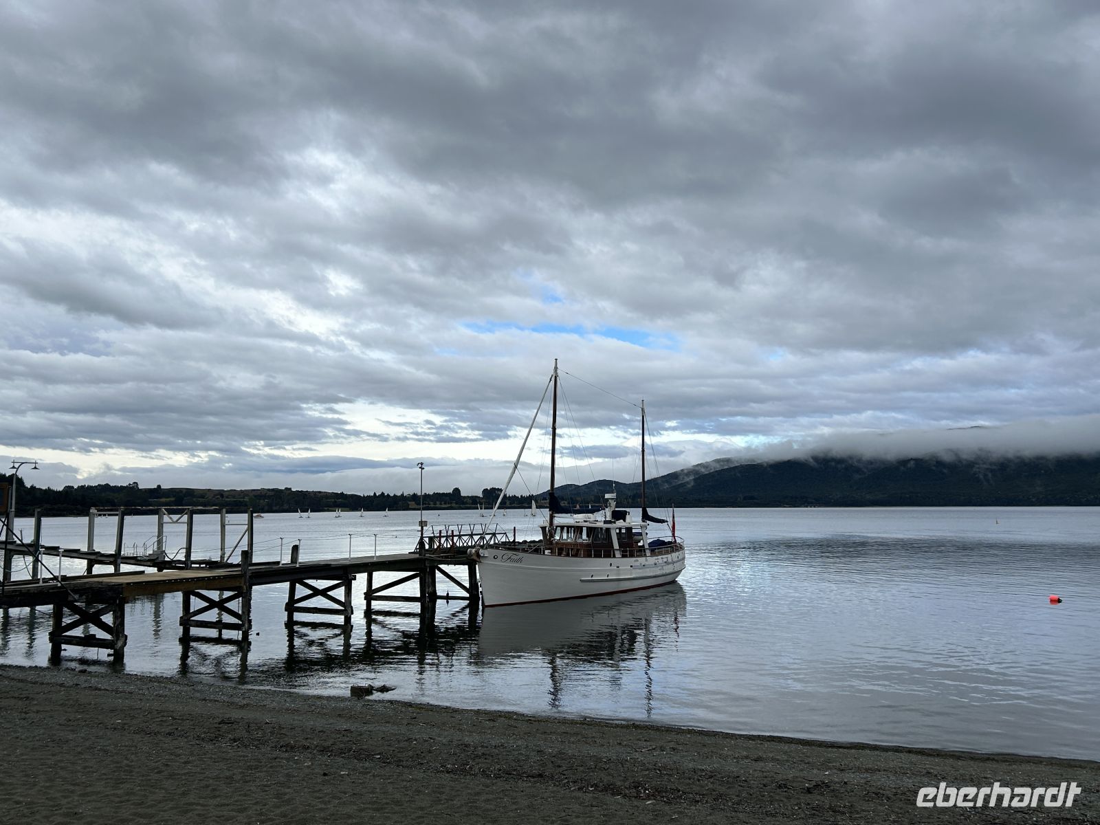 Regen, Regen überall Regen. Unser Glück mit dem Wetter hat uns leider verladen, über Nacht hat es sich ganz schön eingeregnet. Nach unserem frühen Frühstück steigen wir mit Sack und Pack in unser treues Gefährt und fahren los in Richung Haast Pass. Durch den anhaltenden Regen gibt es leider nicht viel links und rechts zu sehen außer endlose Wälder. Der Haast Pass wurde benannt nach Julius von Haast einem Geologe aus Bonn der verschiedene Expedition in Auckland leitete. Am späten Nachmittag haben wir eine Verabredung mit der MS Earnslaw einem mit Kohlebetriebenem Schiff das uns zur Walter Peak Farm bringt. Wir passieren den Lake Wakatipu und steigen auf der Walter Peak High Country Farm aus. Als erstes wird uns ein phänomenales Buffet serviert, womit wir überhaupt nicht gerechnet hätten. Mit vollen Bäuchen, machen wir einen Rundgang über die Farm zum Amphitheater, wo wir Border Collie Cam in Aktion beim Schafetreiben auf der Weide erleben dürfen. Gigantisch wie gut trainiert diese Hündin ist. Ein Highlight ist natürlich auch die Vorführung wie ein Schaf geschoren wird. Im ersten Moment sah es sehr rabiat aus aber es dient immerhin dem Wohl des Tieres. Gegen 21 Uhr gelangen wir wieder an Land und spazieren bei leichten Nieselregen zu unserem Hotel.
