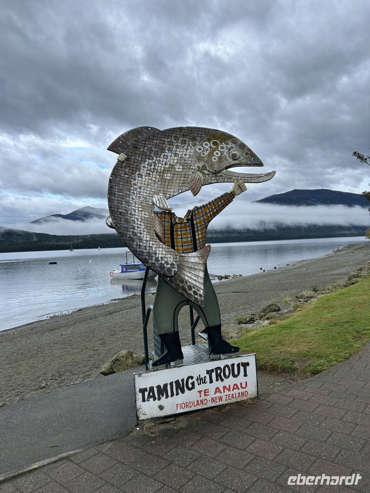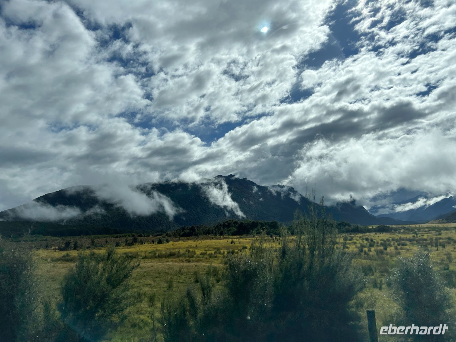 Gisela chauffiert uns sicher nach Te Anau, wo wir erstmal unser Reisegepäck in unserer heutigen Unterkunft abliefern. In Te Anau machen wir ein kleines Kaffeepäuschen und flanieren die kleine Einkaufsstraße rauf und runter. Wieder zurück im Bus setzten wir unsere Reise fort zum Fiordland Nationalpark. Dieser gehört zum UNESCO Weltnaturerbe und wird von