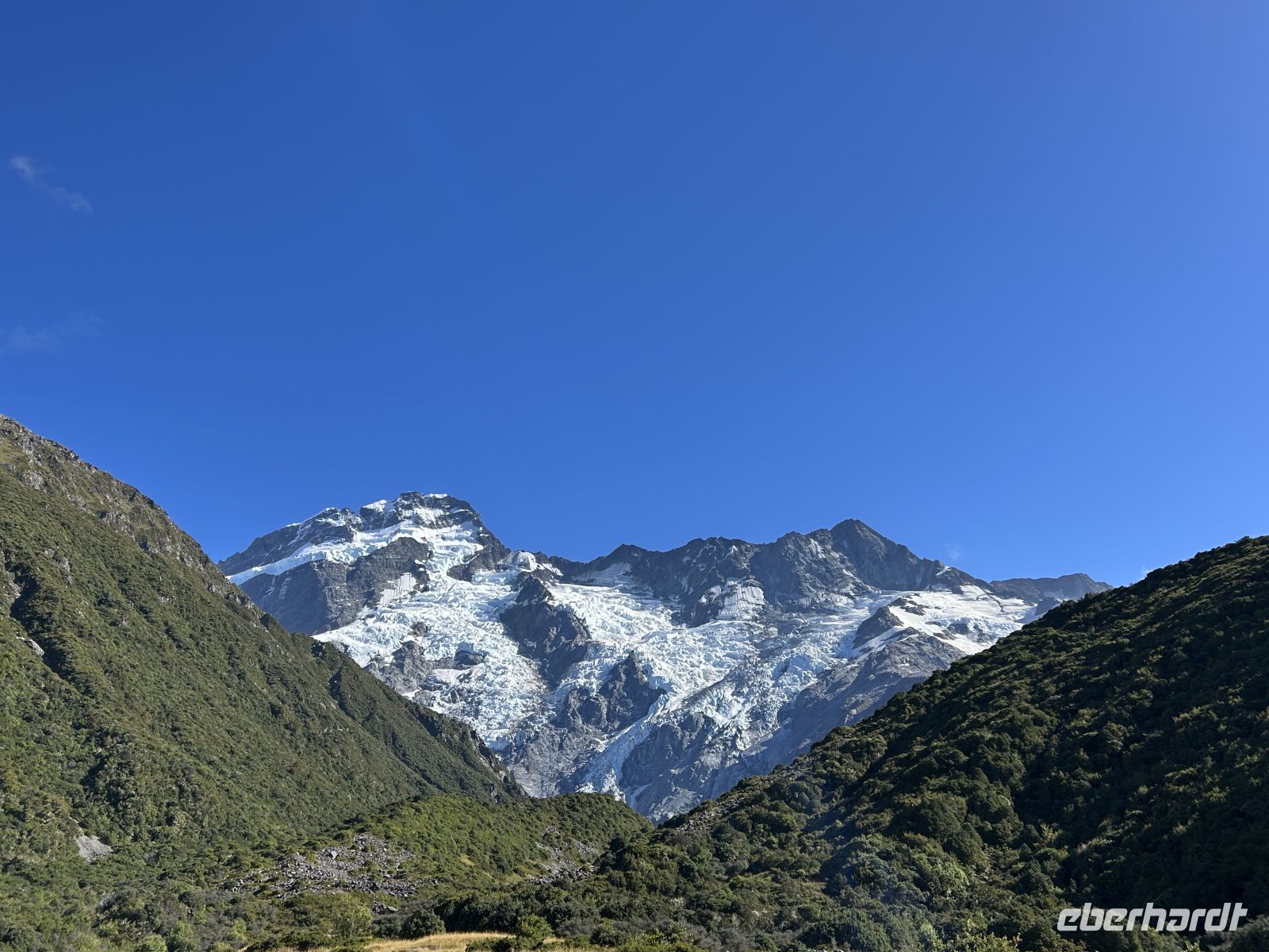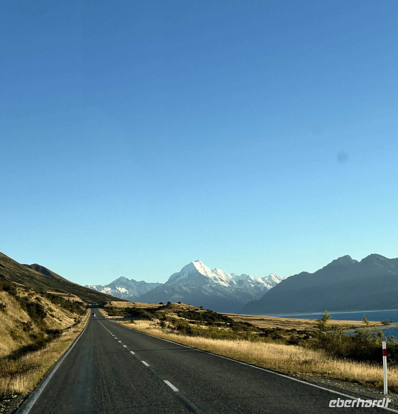 Die Nacht war ruhig und erholsam. Gemeinsam stärken wir uns beim Frühstück für den heutigen Tag. Nachdem unsere Reiseleiterin Gisela wieder unsere Koffer im Bus fachmännisch verstaut hat, setzten wir unsere Rundreise durch Neuseeland fort. Das Wetter ist wieder auf unserer Seite und so mit haben wir einen wahnsinnige tolle Aussicht auf den türkisfarbenden Lake Pukaki der sich entlang der Panoramastraße windet die zum Mount Cook Nationalpark führt. Auf dem Parkplatz angekommen machen wir uns bereit für eine kleine Wanderung auf dem Hooker Valley Track. Über schroffe Gesteine und eine Hängebrücke kommen wir schließlich am Sefton Lookout an, wo wir die traumhafte Aussicht auf den schneebedeckten Mount Sefton ( 3151 Meter Höhe) haben. Leider ist der Rundweg an dieser Stelle auch zu Ende, da die darauffolgende Hängebrücke aktuell gebaut wird. Wir entschließen uns kurzer Hand zurück zum Parkplatz zu laufen und von da aus zum Kea Point zu marschieren. Nacg circa 3 Kilometer erreichen wir die Aussichtsplattform und stehen vor dem gewaltigen Massiv des Mount Sefton. Hier machen wir eine kleine Verschnaufpause und genießen die Sonnenstrahlen und die einzigartige Landschaft die sich um uns befindet. Auf dem Rückweg sammeln wir die den Rest der Gruppe ein die per Helikopter über die Südalpen geflogen sind. Am frühen Nachmittag kommen wir am Lake Tekapo an, wo wir die Nacht verbringen werden. Unser Hotel ist auch direkt am See gelegen, sodass wir uns nach der langen Busfahrt noch ein wenig die Beine vertreten können. Der Lake Tekapo ist ein ehemaliger Gletschersee mit einer Größe von etwa 95 km² und ist nach seiner Aufstauung der größte See der Region Canterbury auf der Südinsel von Neuseeland. Zusammen essen wir im Hotelrestaurant zu Abend und lassen bei angeregten Gesprächen den eindrucksvollen Tag ausklingen.