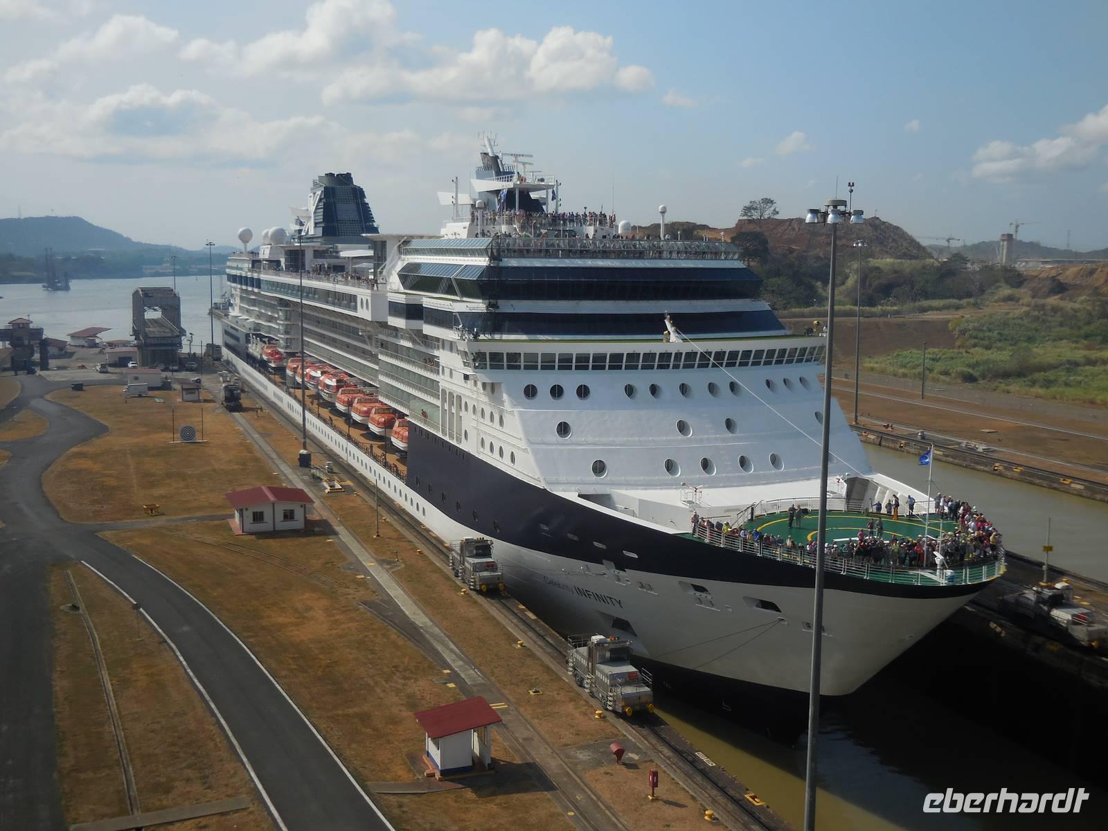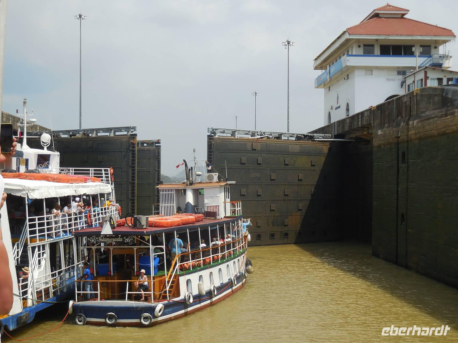 Wir besichtigten zunächst das Museum des Kanals, was auch für die Frauen, die nichts mit Technik am Hut haben, mehr als interessant ist. Anschließend sind wir auf die Besucherterrasse gegangen und wir staunten nicht schlecht, als gerade ein großes Kreuzfahrtschiff von Hanseatic passieren wollte. Nur 1,5% aller Schiffe, die durch den Kanal fahren, sind Kreuzfahrtschiffe und wir sahen an einem Tag gleich drei Stück. 8-10 Stunden dauert der komplette Transit und der Preis richtet sich unter anderem nach der Anzahl an Passagieren. Ein kleines privates Segelboot muss ca. 800 Dollar für die Passage zahlen.