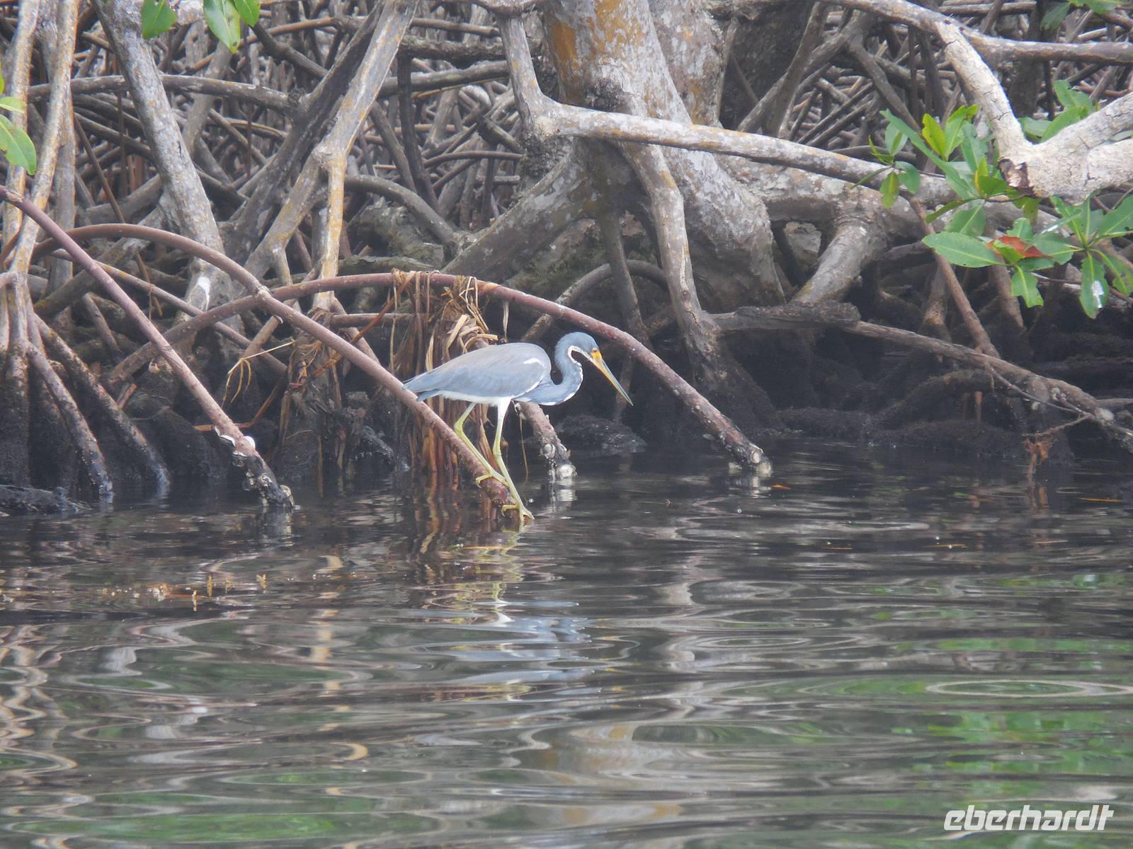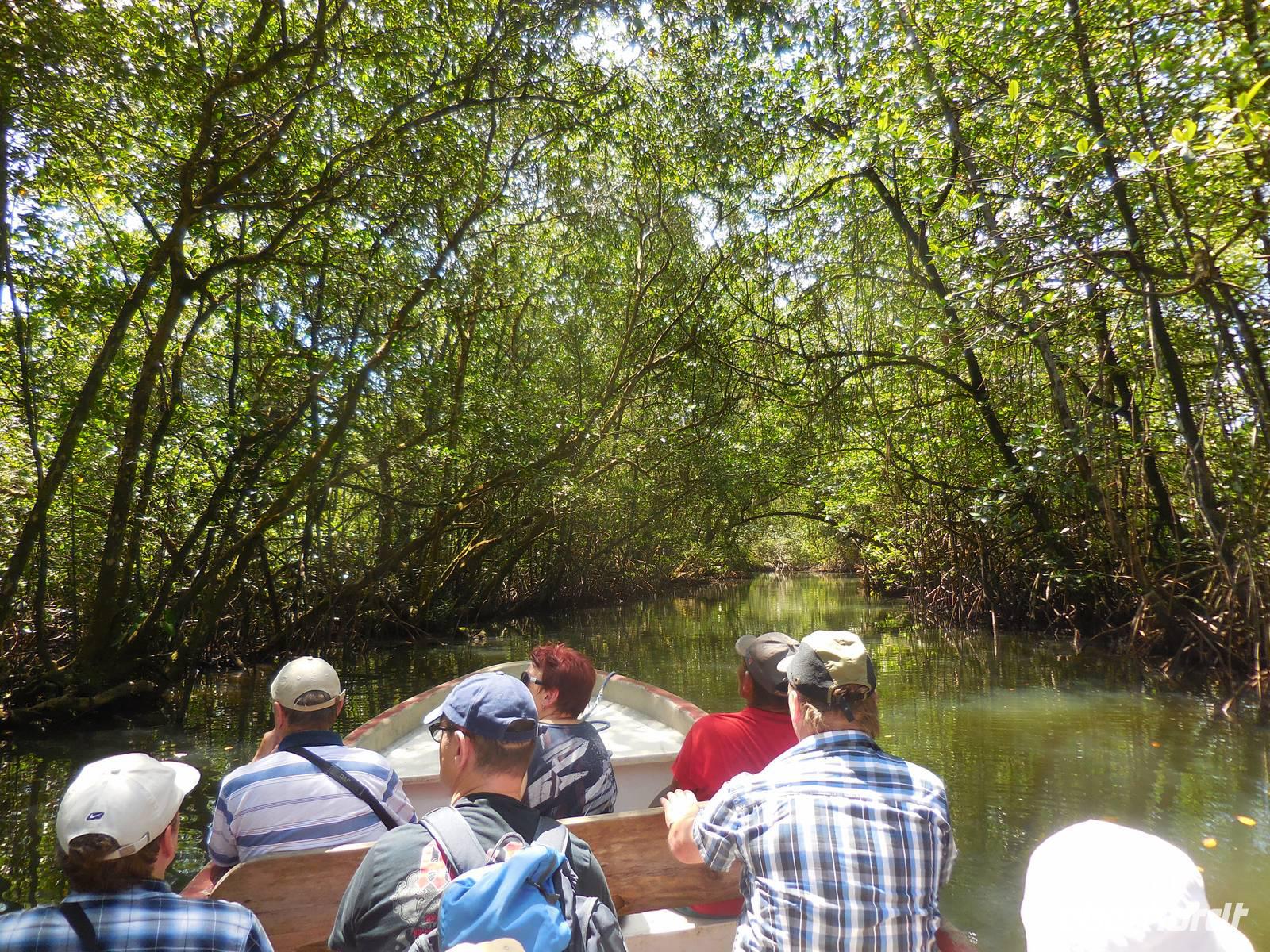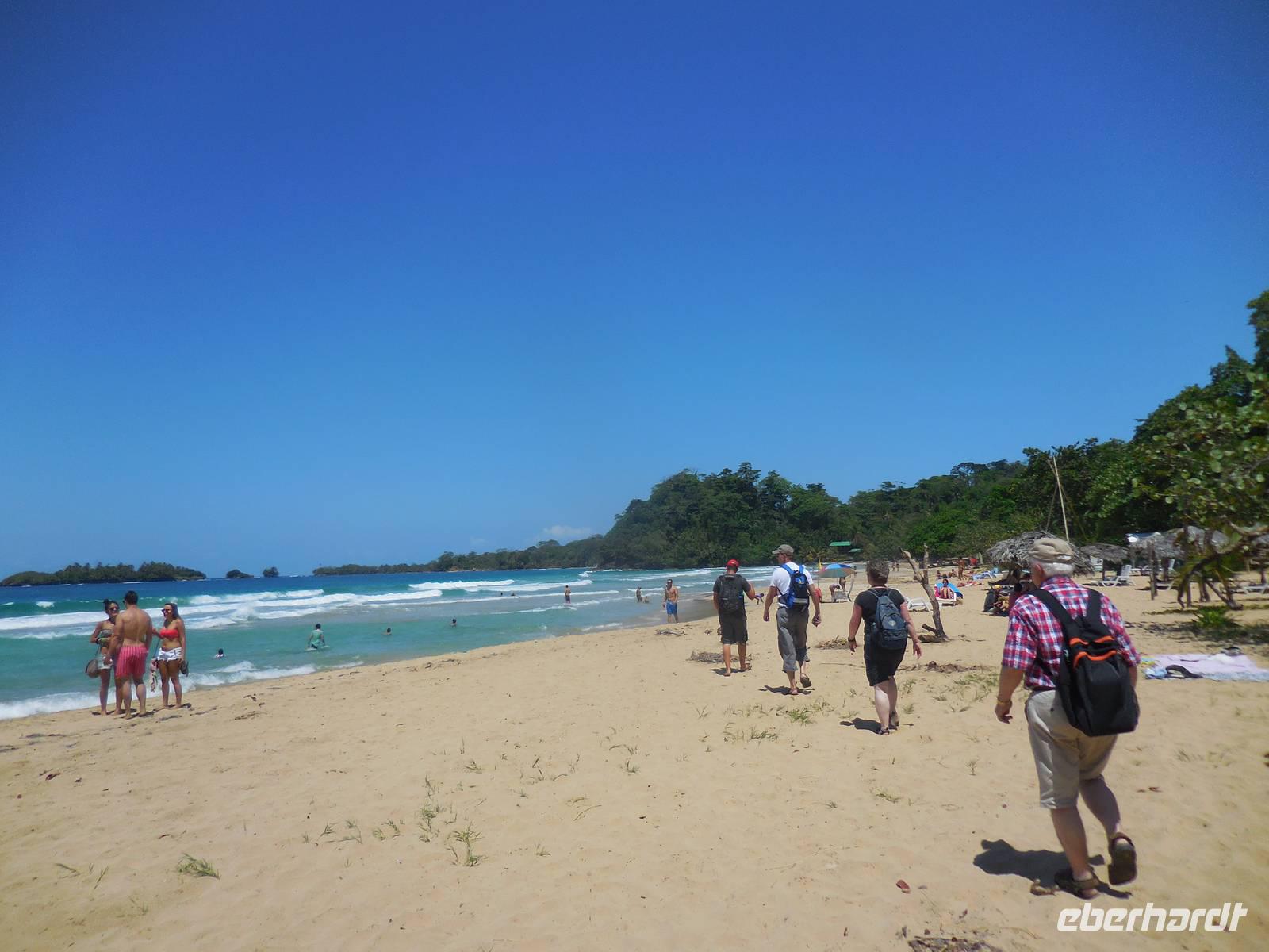 Auf der großen Hotelterrasse im ersten Stock nahmen wir alle gemeinsam bei tollem Sonnenschein unser Frühstück im Freien ein. Es war herrliches karibisches Wetter. Um 9:30 Uhr fuhr unser Boot zur Nachbarinsel Bastimentos ab und wir warteten eine Weile, ehe man aufschloss und wir unser Mittagessen abliefern konnten. Zwei Einheimische kommen mit einem anderen Boot und gemeinsam fuhren wir los zum nahe gelegenen Mangrovenwald. Wir erspähen etliche Krabben, ein Faultier mit einem Baby und auf dem Rückweg sogar etliche Delfine. Das hatte keiner erwartet. Dann kehrten wir zurück zur ersten Station und bereiteten unser Picknick vor, welches vom örtlichen Reiseleiter und der Begleitung am frühen Morgen eingekauft worden ist. Es gibt leckere Tomaten mit frischen Zwiebeln, Sandwich mit Salami, Edamer und Truthahn, frische Mangos und Kekse. Nachdem wir satt sind, bringt uns das Boot zur anderen Seite der Insel und wir laufen ein kurzes Stück Weg zum bekannten Red frog Beach. Die meisten der Gruppe genossen das angenehme Nass der Karibik und im Anschluss ein kühles Bier. Dann kam die Schreckensnachricht: aufgrund der Osterfeiertage sollte es die nächsten Tage keinen Alkohol mehr zu kaufen geben. Was für ein Drama für die deutschen Biertrinker unter uns. Auf dem Rückweg zum Boot erspähten wir tatsächlich einen der giftigen roten Pfeilgiftfrösche und kehrten zurück zum Hotel.