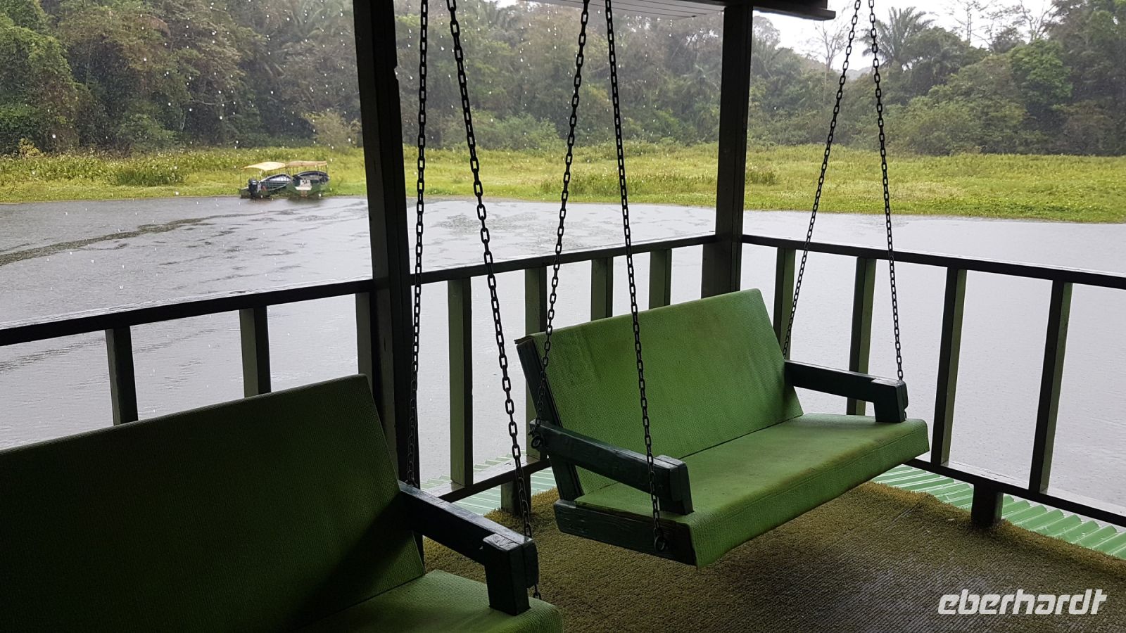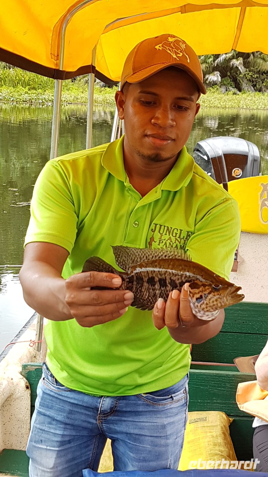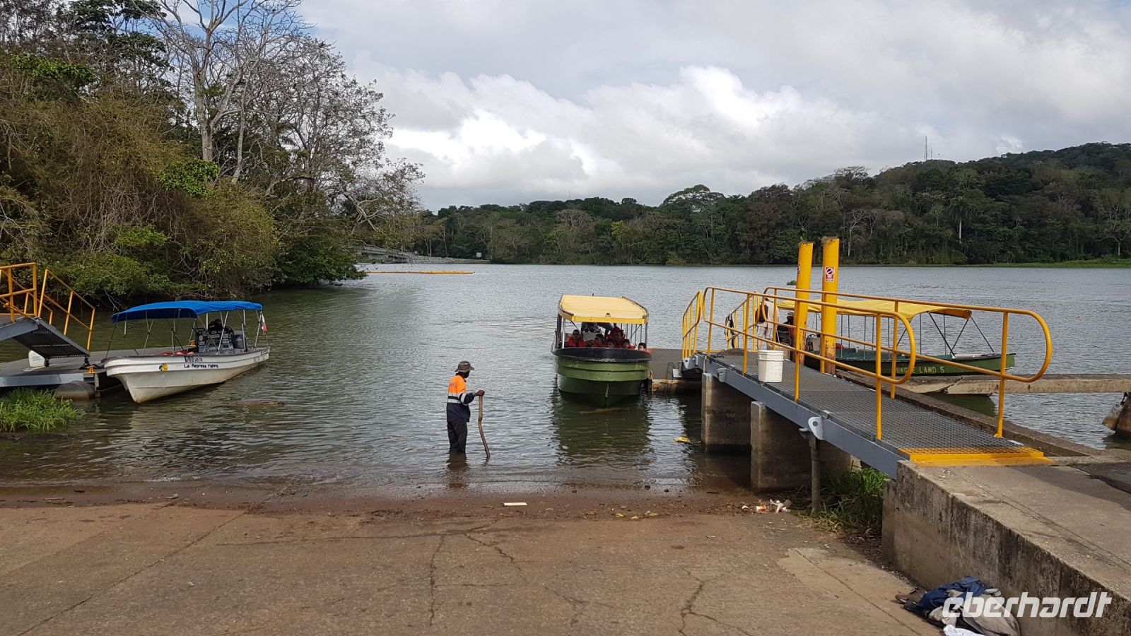 Nach einem leckeren Frühstück im Hotel trafen wir uns wieder in unserem Bus. Auch heute fuhren wir wieder in Richtung Panamakanal. Im angrenzenden Soberania Nationalpark bestiegen wir ein Schnellboot, dass uns über den Gatunsee brachte und in angrenzende Dschungel-Flussarme. Wir beobachteten eine Familie Brüllaffen und staunten über die üppige Vegetation, als der Motor unseres Bootes nicht mehr anspringen wollte. Unser Bootsführer kletterte auf das Dach und hatte Handyempfang, um Hilfe zu holen. Wir warteten und erlebten einen wolkenbruchartigen Regenguss, der uns trotz Dach über dem Kopf ziemlich nass machte. Nach geraumer Zeit kam der helfende Kollege unseres Bootsführers und konnte den Motor wieder in Gang bringen. Wir fuhren nun direkt zur Dschungel-Lodge, wo wir mit einem traditionellen sehr schmackhaften typisch panamaischen Gericht erwartet wurden. Wir ließen es uns schmecken, danach konnten wir unterschiedlichen Aktivitäten nachgehen. Einige fuhren Kayak, andere machten erste Versuche beim Angeln und fingen sogar einige Fische, andere badeten direkt vom Steg der Logde aus oder entspannten in Hängematten oder bequemen Schaukelsofas.