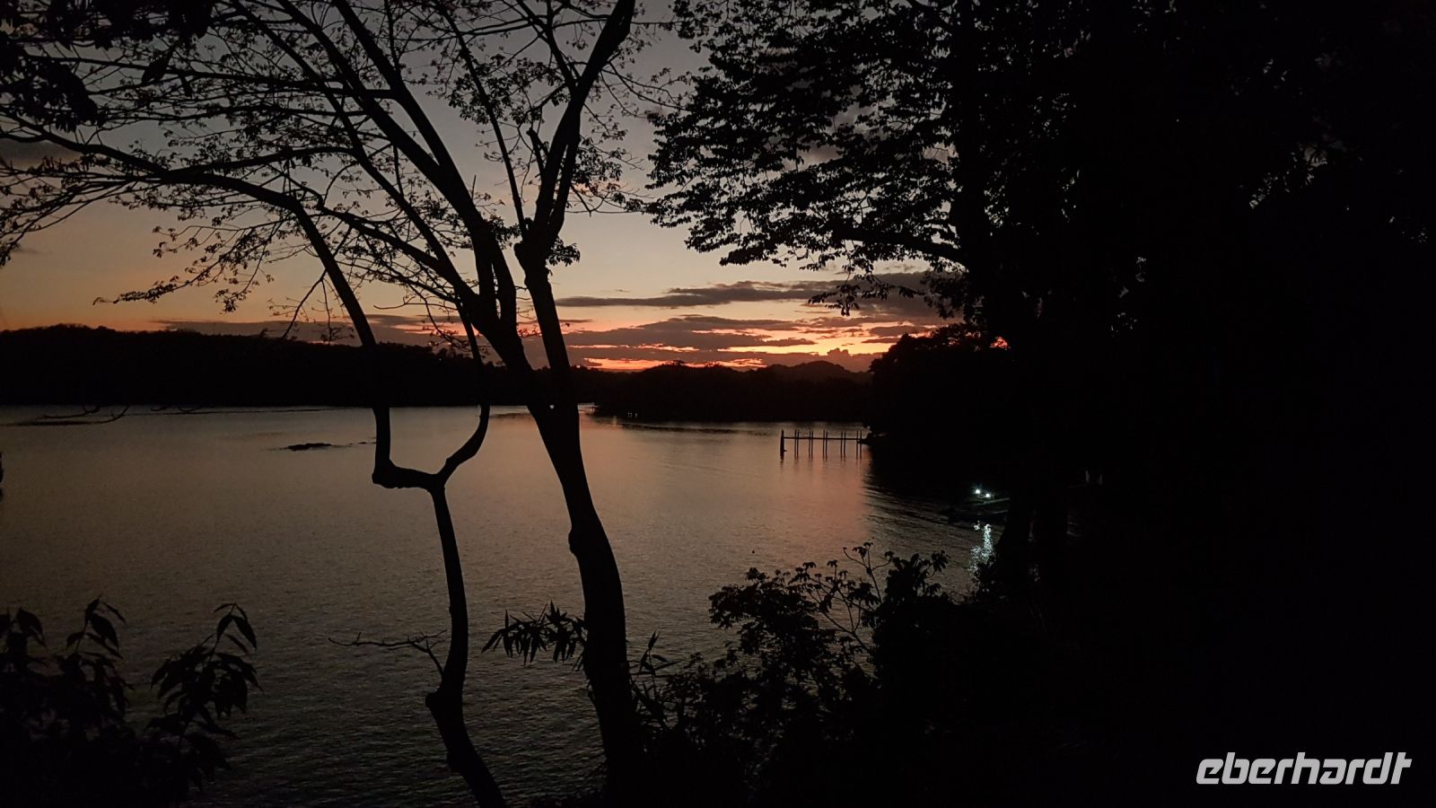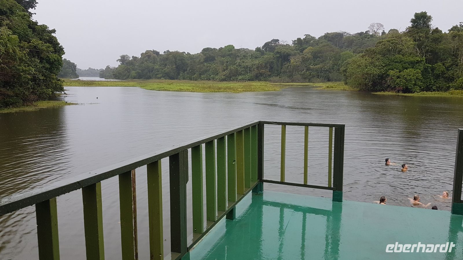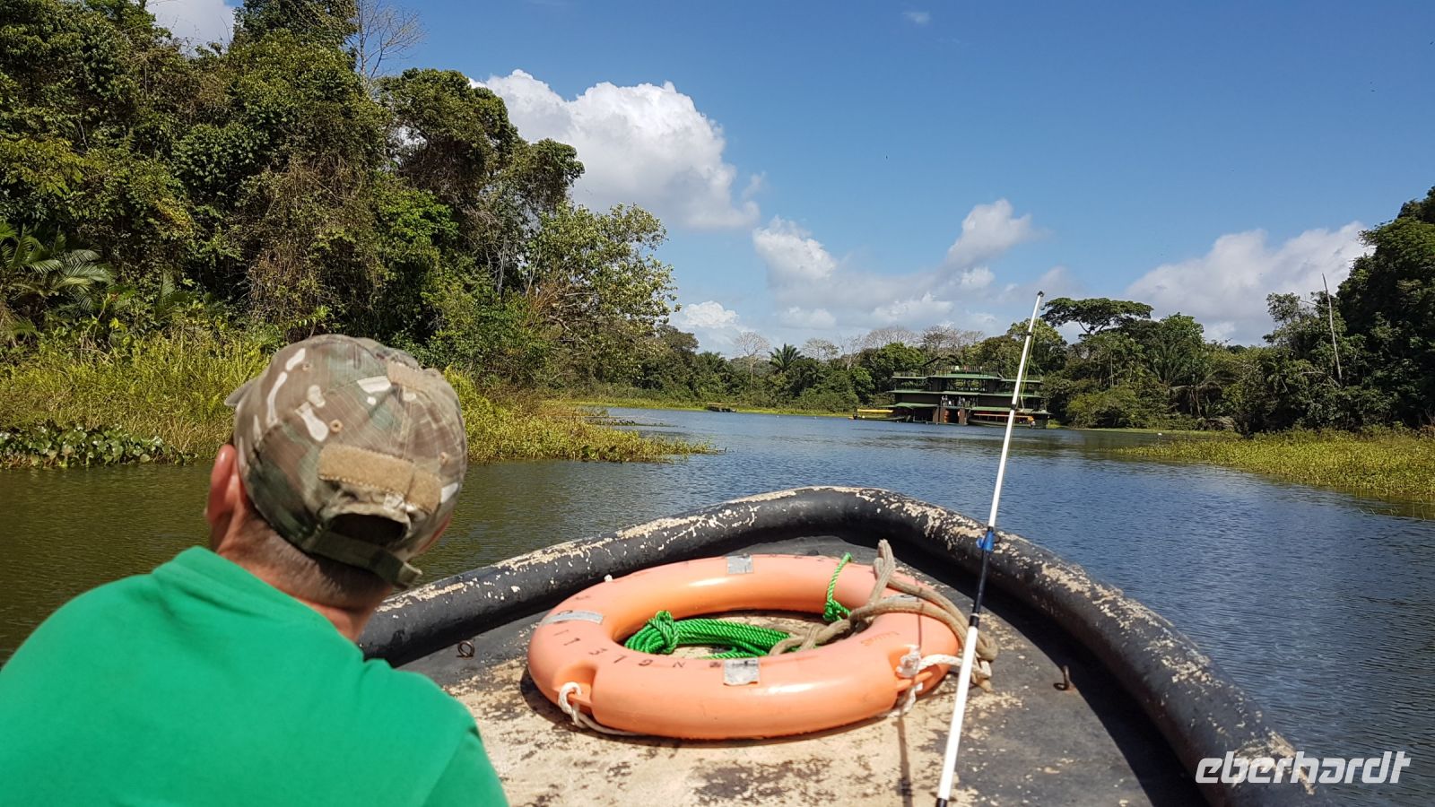 Nach einem leckeren Frühstück im Hotel trafen wir uns wieder in unserem Bus. Auch heute fuhren wir wieder in Richtung Panamakanal. Im angrenzenden Soberania Nationalpark bestiegen wir ein Schnellboot, dass uns über den Gatunsee brachte und in angrenzende Dschungel-Flussarme. Wir beobachteten eine Familie Brüllaffen und staunten über die üppige Vegetation, als der Motor unseres Bootes nicht mehr anspringen wollte. Unser Bootsführer kletterte auf das Dach und hatte Handyempfang, um Hilfe zu holen. Wir warteten und erlebten einen wolkenbruchartigen Regenguss, der uns trotz Dach über dem Kopf ziemlich nass machte. Nach geraumer Zeit kam der helfende Kollege unseres Bootsführers und konnte den Motor wieder in Gang bringen. Wir fuhren nun direkt zur Dschungel-Lodge, wo wir mit einem traditionellen sehr schmackhaften typisch panamaischen Gericht erwartet wurden. Wir ließen es uns schmecken, danach konnten wir unterschiedlichen Aktivitäten nachgehen. Einige fuhren Kayak, andere machten erste Versuche beim Angeln und fingen sogar einige Fische, andere badeten direkt vom Steg der Logde aus oder entspannten in Hängematten oder bequemen Schaukelsofas.