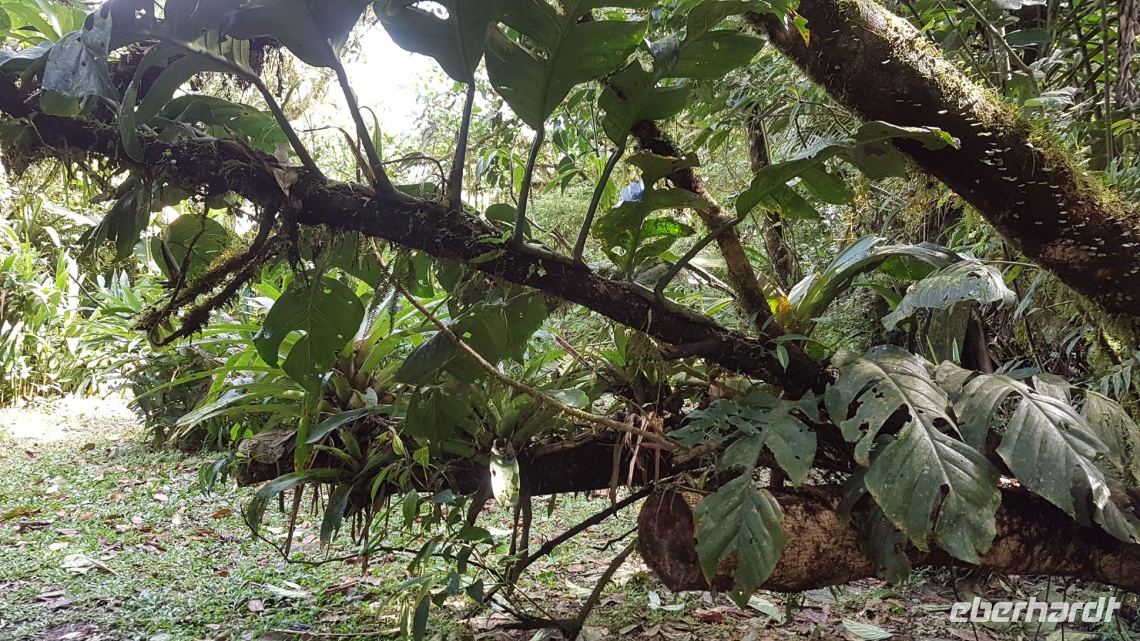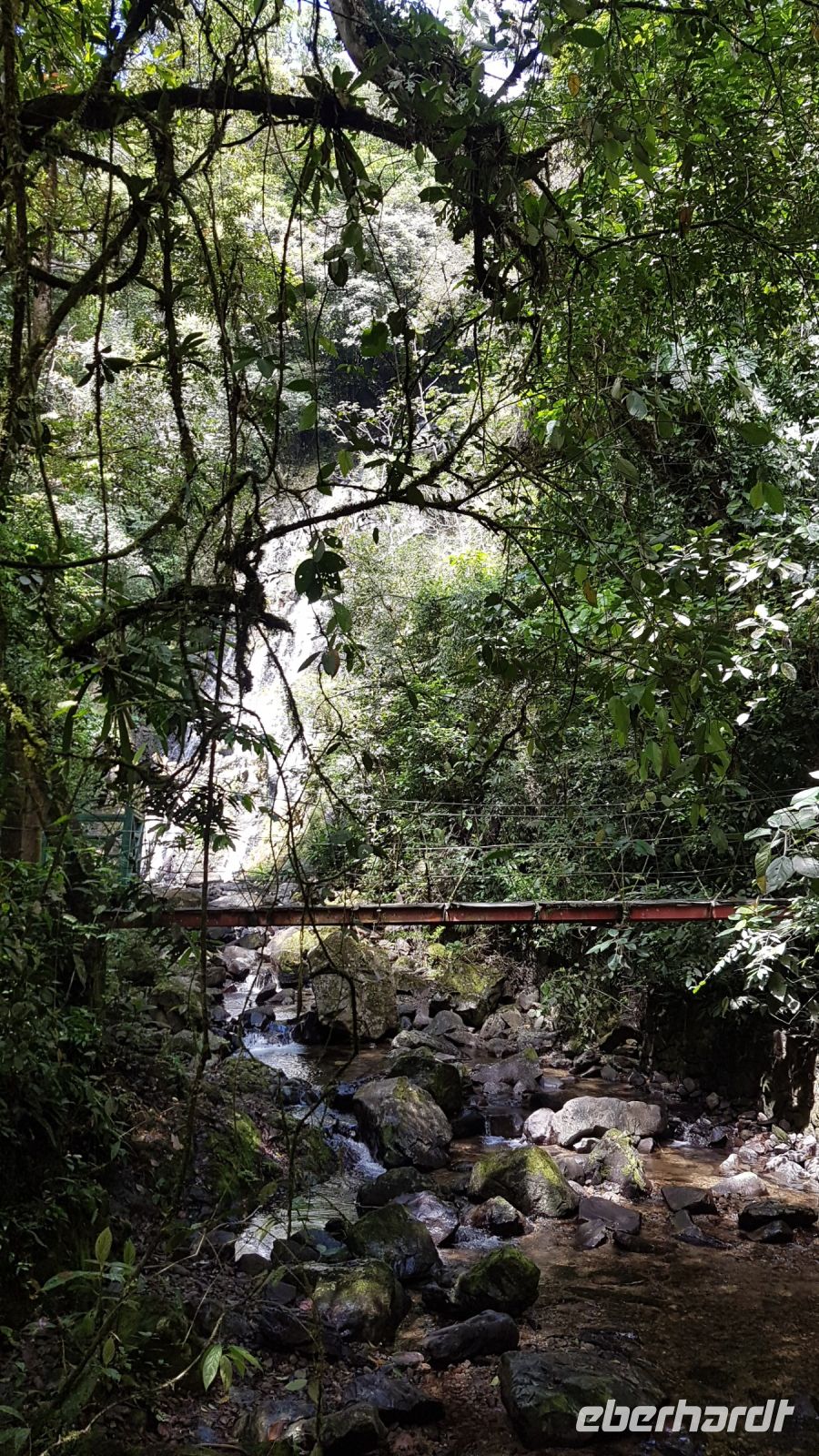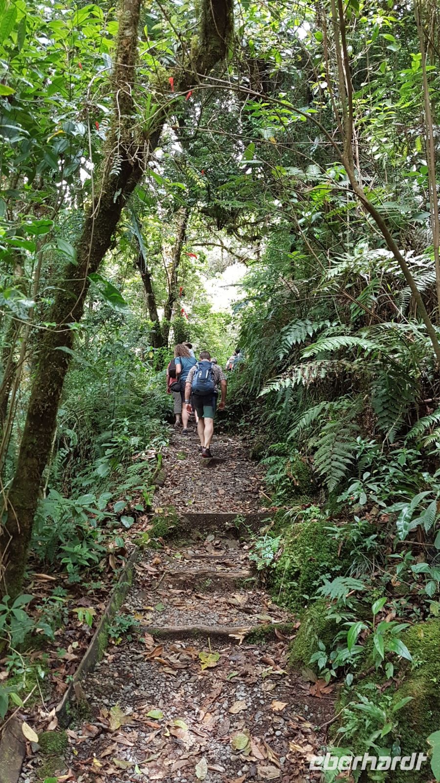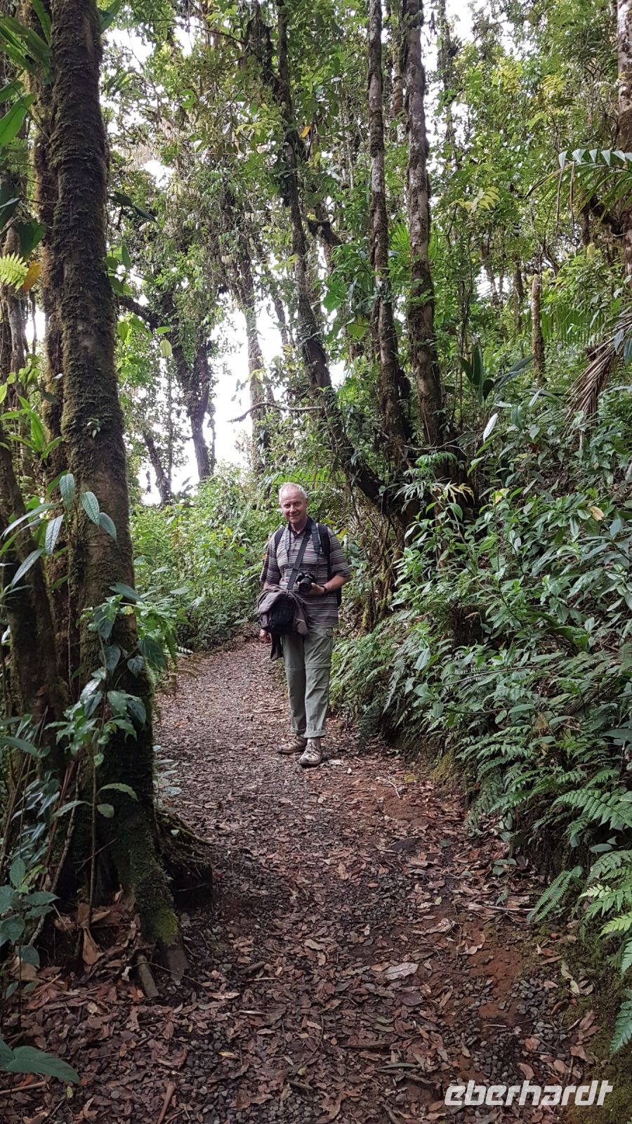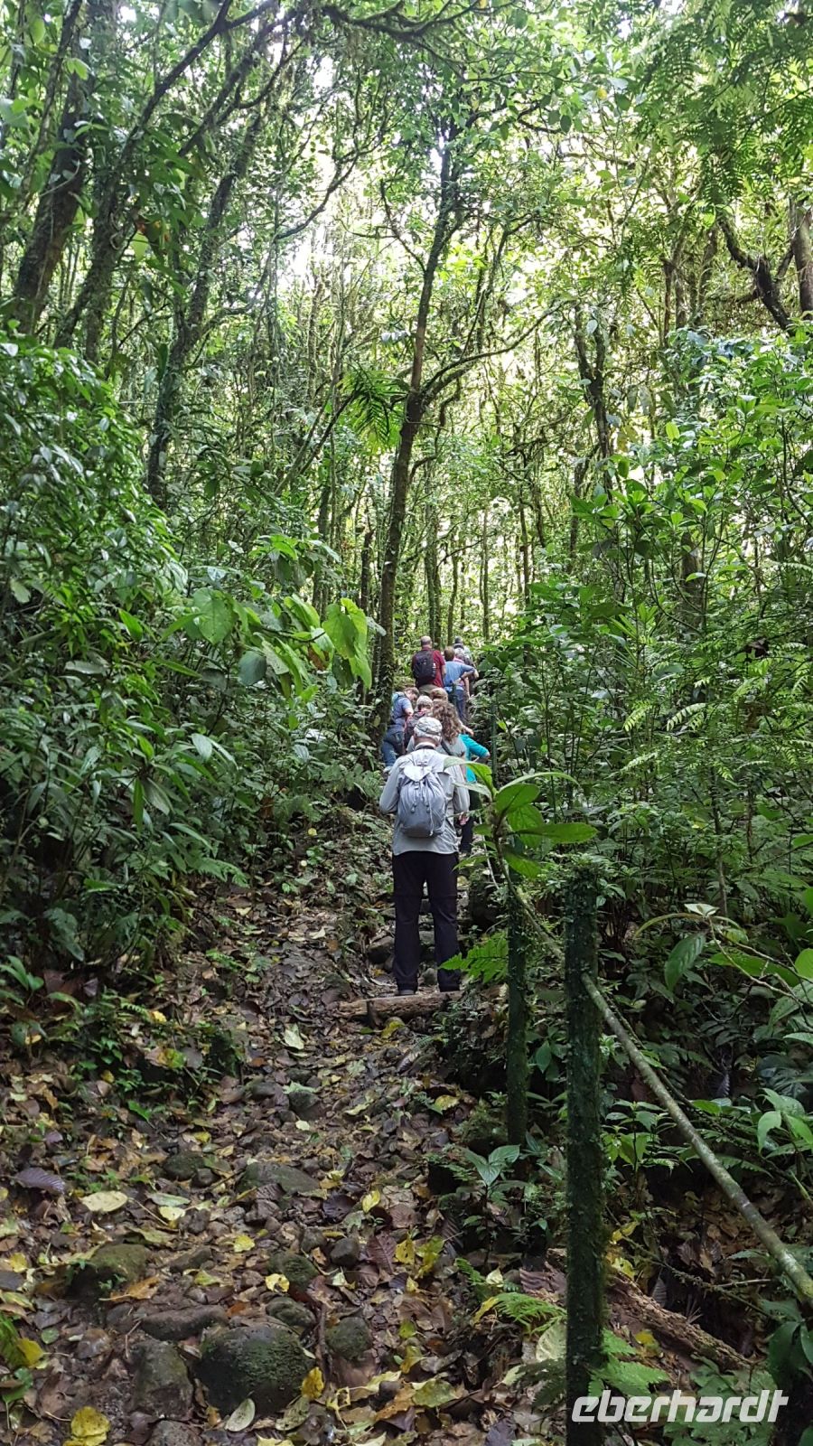 Nach kurzer Fahr mit unserem Bus hinaus aus dem Ort erreichten wir den Startpunkt für unsere Wanderung in Richtung eines Wasserfalles auf dem Quetzal-Wanderweg im Nebelwald. Einige Bauern leben hier und bauen Nutzpflanzen an wie: Kaffee, Weißkohl, Blaukartoffel oder Bananen. Am Fußbereich des Vulkans Barú wachsen schmackhafte wilde Brombeeren. Zahlreiche Wildblumen und Pflanzen säumen den Wanderweg, der sich oft mit dem Fluss aus den Bergen kreuzt. Wir sahen zum Beispiel Bambus, deren Stängel als Rankhilfe für Tomaten oder als Strohhalm genutzt werden kann. Es gibt Bromelien und Heliconien in verschiedenen Ausführungen, Farne, Flechten und verschiedenste farbenfroh blühende Blumen, unter anderem die „Electric flower“, die in der Gastronomie gern zwischen den einzelnen Gängen zur Geschmacksneutralisation genutzt wird. Wir sahen große Ulmen, die hier vermutlich schon über 400 Jahre stehen. Wir begannen unsere Wanderung in einer Höhe von 1500 Metern, bei etwa 1700 Metern kehrten wir um. Unser Hotel liegt bei knapp 2000 Metern Höhe. Bereits bei diesen Höhenunterschieden merkten wir eine deutliche Veränderung des Klimas, besonders die Temperaturen sind deutlich niedriger, je höher man kommt.