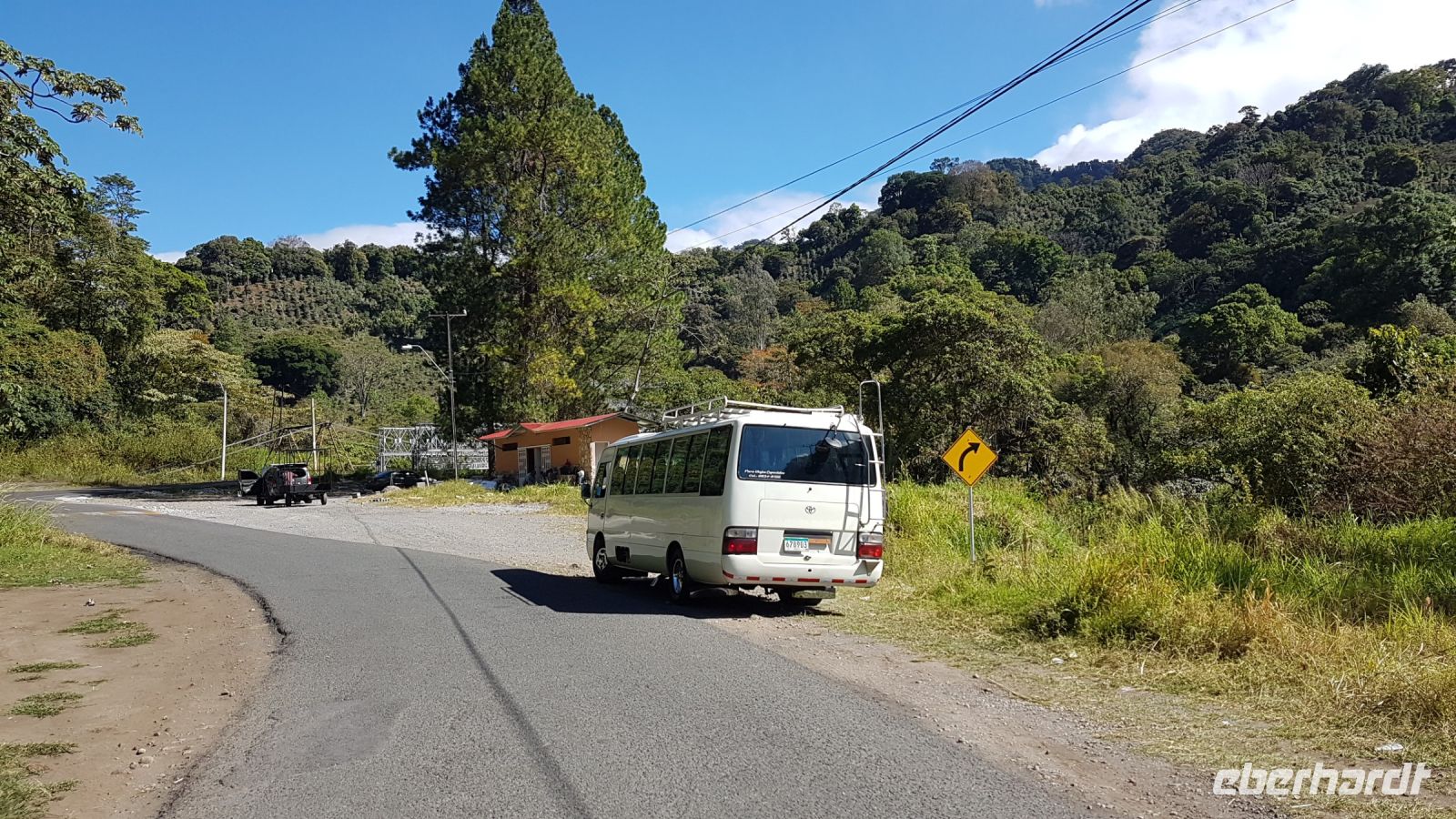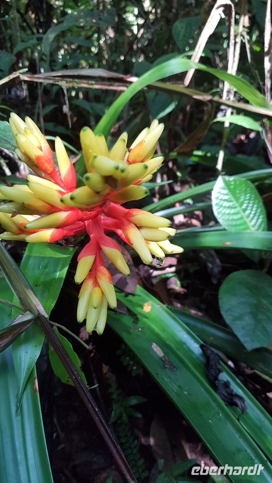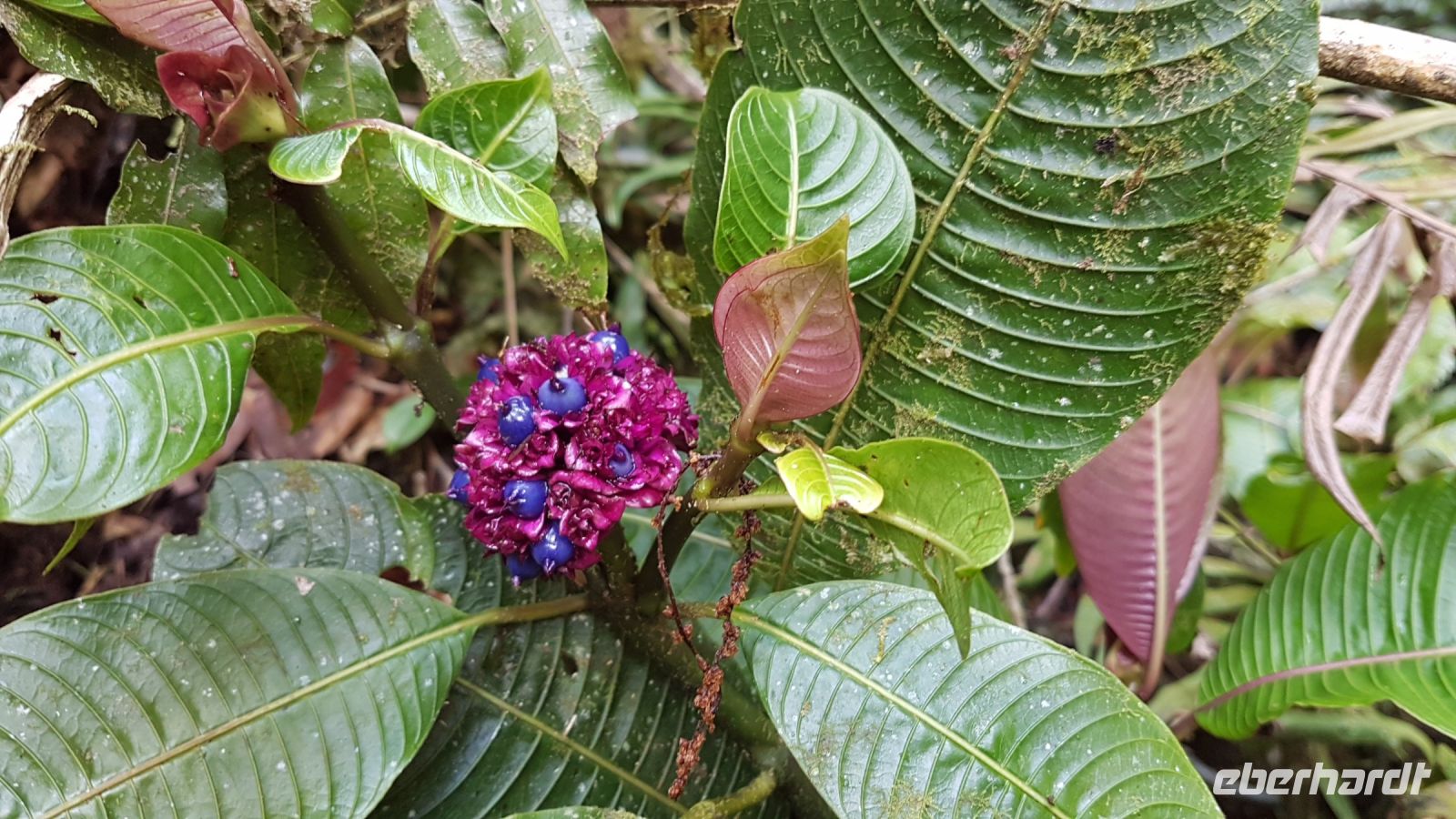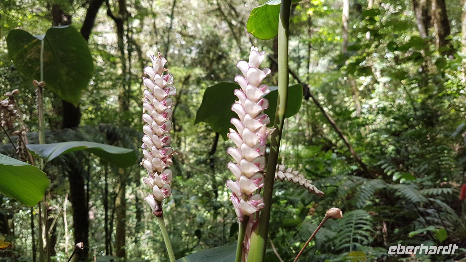 Nach kurzer Fahr mit unserem Bus hinaus aus dem Ort erreichten wir den Startpunkt für unsere Wanderung in Richtung eines Wasserfalles auf dem Quetzal-Wanderweg im Nebelwald. Einige Bauern leben hier und bauen Nutzpflanzen an wie: Kaffee, Weißkohl, Blaukartoffel oder Bananen. Am Fußbereich des Vulkans Barú wachsen schmackhafte wilde Brombeeren. Zahlreiche Wildblumen und Pflanzen säumen den Wanderweg, der sich oft mit dem Fluss aus den Bergen kreuzt. Wir sahen zum Beispiel Bambus, deren Stängel als Rankhilfe für Tomaten oder als Strohhalm genutzt werden kann. Es gibt Bromelien und Heliconien in verschiedenen Ausführungen, Farne, Flechten und verschiedenste farbenfroh blühende Blumen, unter anderem die „Electric flower“, die in der Gastronomie gern zwischen den einzelnen Gängen zur Geschmacksneutralisation genutzt wird. Wir sahen große Ulmen, die hier vermutlich schon über 400 Jahre stehen. Wir begannen unsere Wanderung in einer Höhe von 1500 Metern, bei etwa 1700 Metern kehrten wir um. Unser Hotel liegt bei knapp 2000 Metern Höhe. Bereits bei diesen Höhenunterschieden merkten wir eine deutliche Veränderung des Klimas, besonders die Temperaturen sind deutlich niedriger, je höher man kommt.