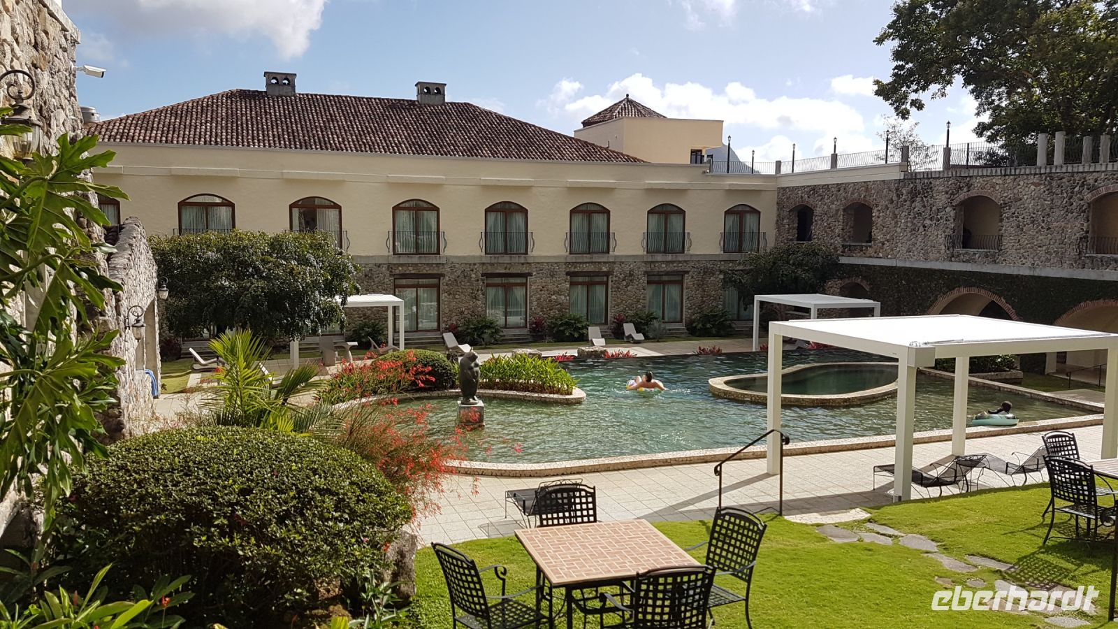 Wir besuchten im Anschluss das Mariposarium, ein Mekka für Schmetterlinge. Per Video erhielten wir eine kleine Einführung in das zumeist kurze Leben und Entstehen dieser schönen Insekten. Danach kamen wir durch eine Schleuse hinein in das Schmetterlingshaus, wo wir von den bunten Schmetterlingen regelrecht umflattert wurden. Wir konnten viele verschiedene Arten beobachten und fotografieren. Ab und zu setzte sich einer von ihnen auf unsere bunten Blusen und Hemden, vielleicht eine besonders anziehende Blüte für ihn. Nach diesem Besuch fuhren wir zu unserem Hotel Los Mandarinos etwas außerhalb von EL Valle. Eine wunderschöne Gartenanlage und ein Poolbereich erwarteten uns. Die verschiedenen Hotelgebäude erinnern etwas an alte Burgen. Wir hatten den restlichen Nachmittag frei und konnten die Annehmlichkeiten unseres Hotels genießen. Einige nutzten die Zeit für eine Erfrischung im Pool.