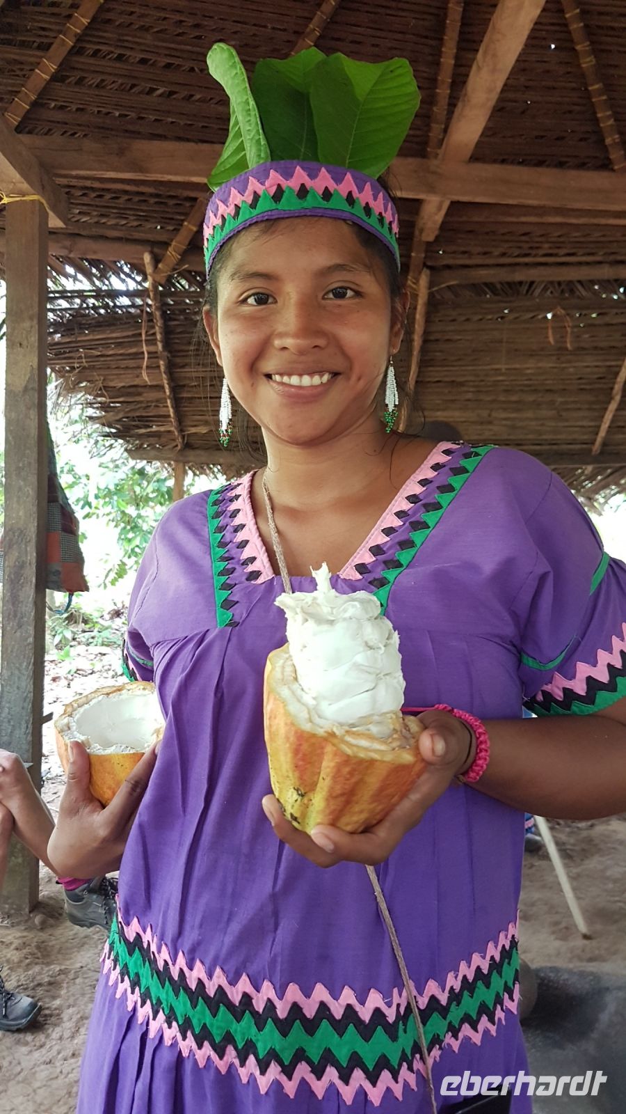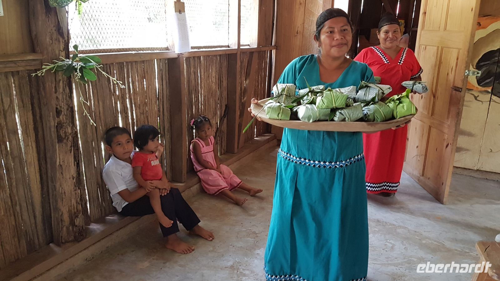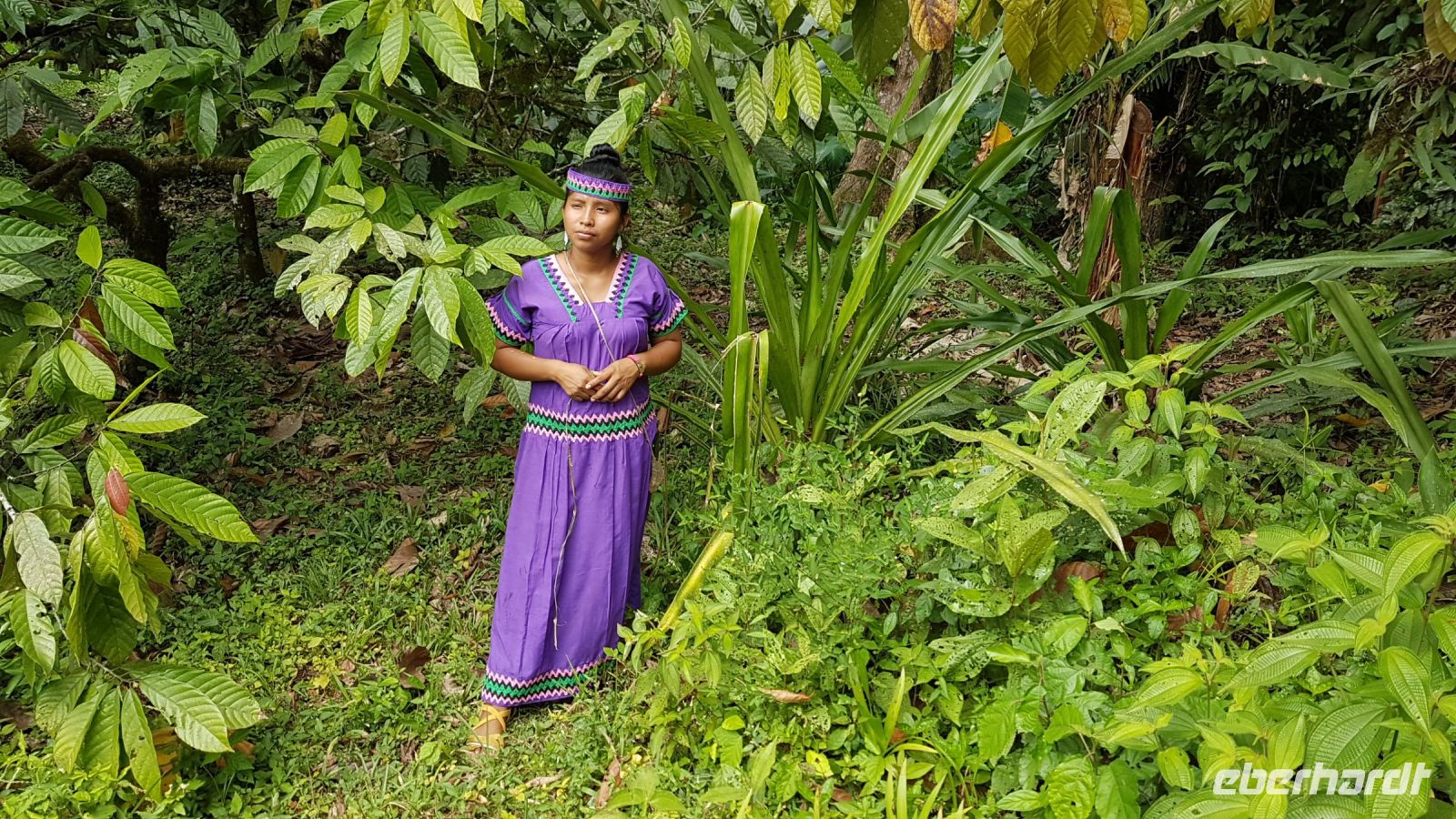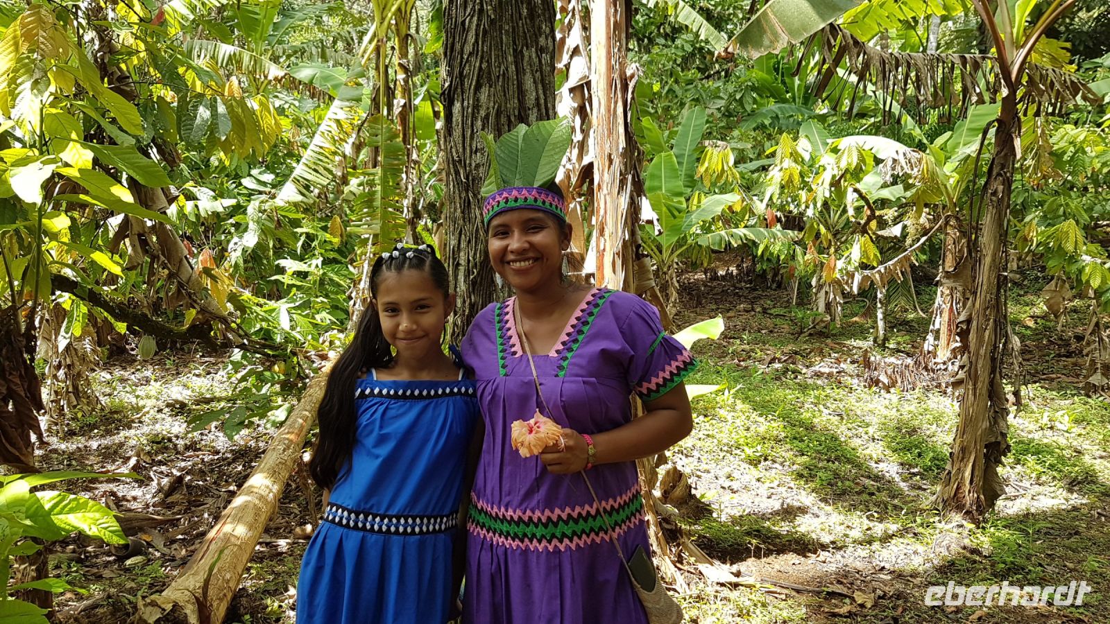 Unsere Zeit in den Bergen ging zu Ende. Also packten wir wieder unsere Koffer, die unser Fahrer Kenny sehr geschickt auf das Dach seines Busses verlud. Wir ließen uns unser Frühstück schmecken und waren recht bald wieder auf Tour in unserem Bus. Wir verließen das fruchtbare Kaffee-Tal um Boquete und unser Bus erklomm Meter um Meter entlang teils steiler Serpentinenstraßen. An einem schönen Aussichtspunkt legten wir einen Halt ein, um zurückzuschauen und noch einmal in Richtung Pazifik zu blicken. Erst in Panama-Stadt würden wir ihn wieder sehen. Unser Bus schraubte sich weiter in die Höhe, erklomm den Pass mit Namen: Gebiss des Teufels (quijada del diablo) in etwa 1.700 m Höhe. Danach ging es allmählich wieder bergab, denn unser Ziel war heute die karibische Seite von Panama. Doch zunächst statteten wir der Dorfgemeinschaft von Oeste einen Besuch ab. Die Einwohner gehören zum Volk der Ngöbe, deren Frauen traditionelle bunte Kleider tragen. Die Dorfgemeinschaft lebt hauptsächlich vom Kakao, der hier aufgrund der klimatischen Verhältnisse sehr gut und in hoher Qualität gedeiht. Wir wurden mit einem typischen Mittagessen begrüßt, das aus Blaukartoffel, Reis und Fisch sowie Bananen und Schokoladenkuchen bestand. Das Hauptgericht war in einem großen Blatt der Blaukartoffelpflanze hübsch verpackt und dieses Blatt ersetzte uns den Teller. Nach dem Essen wurden wir in die Welt des Kakao entführt. Wir durften durch das Dorf und zu den Kakao-Pflanzen wandern, ein Dorfbewohner erklärte uns, wie sie den Kakao hier anbauen und dass seit 44 Jahren ein Pilz ihnen viele Verluste für die Ernte bringt, besonders wenn es feuchte Jahre sind. Eine junge Frau der Gemeinschaft begleitete uns und zeigte uns die ein oder andere Pflanze, die die Menschen hier nutzen, zum Beispiel eine Art Agave, aus deren Pflanzenfasern hier Taschen und Beutel angefertigt werden.
