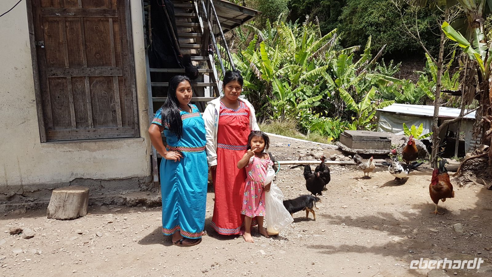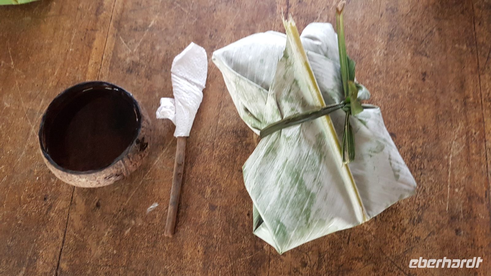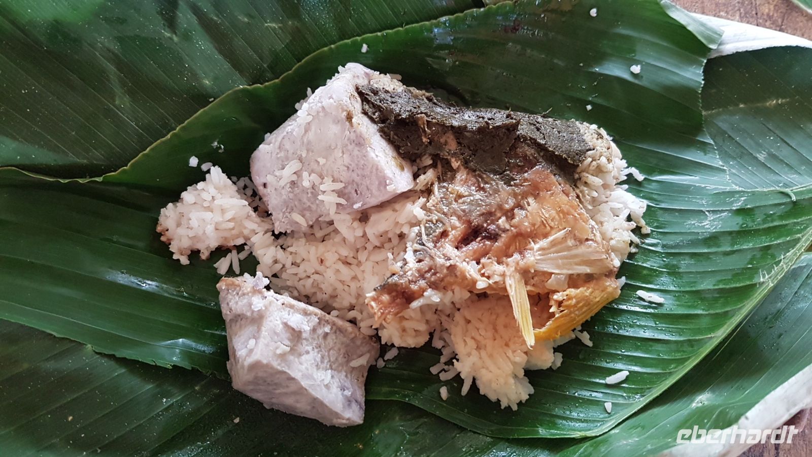 Unsere Zeit in den Bergen ging zu Ende. Also packten wir wieder unsere Koffer, die unser Fahrer Kenny sehr geschickt auf das Dach seines Busses verlud. Wir ließen uns unser Frühstück schmecken und waren recht bald wieder auf Tour in unserem Bus. Wir verließen das fruchtbare Kaffee-Tal um Boquete und unser Bus erklomm Meter um Meter entlang teils steiler Serpentinenstraßen. An einem schönen Aussichtspunkt legten wir einen Halt ein, um zurückzuschauen und noch einmal in Richtung Pazifik zu blicken. Erst in Panama-Stadt würden wir ihn wieder sehen. Unser Bus schraubte sich weiter in die Höhe, erklomm den Pass mit Namen: Gebiss des Teufels (quijada del diablo) in etwa 1.700 m Höhe. Danach ging es allmählich wieder bergab, denn unser Ziel war heute die karibische Seite von Panama. Doch zunächst statteten wir der Dorfgemeinschaft von Oeste einen Besuch ab. Die Einwohner gehören zum Volk der Ngöbe, deren Frauen traditionelle bunte Kleider tragen. Die Dorfgemeinschaft lebt hauptsächlich vom Kakao, der hier aufgrund der klimatischen Verhältnisse sehr gut und in hoher Qualität gedeiht. Wir wurden mit einem typischen Mittagessen begrüßt, das aus Blaukartoffel, Reis und Fisch sowie Bananen und Schokoladenkuchen bestand. Das Hauptgericht war in einem großen Blatt der Blaukartoffelpflanze hübsch verpackt und dieses Blatt ersetzte uns den Teller. Nach dem Essen wurden wir in die Welt des Kakao entführt. Wir durften durch das Dorf und zu den Kakao-Pflanzen wandern, ein Dorfbewohner erklärte uns, wie sie den Kakao hier anbauen und dass seit 44 Jahren ein Pilz ihnen viele Verluste für die Ernte bringt, besonders wenn es feuchte Jahre sind. Eine junge Frau der Gemeinschaft begleitete uns und zeigte uns die ein oder andere Pflanze, die die Menschen hier nutzen, zum Beispiel eine Art Agave, aus deren Pflanzenfasern hier Taschen und Beutel angefertigt werden.