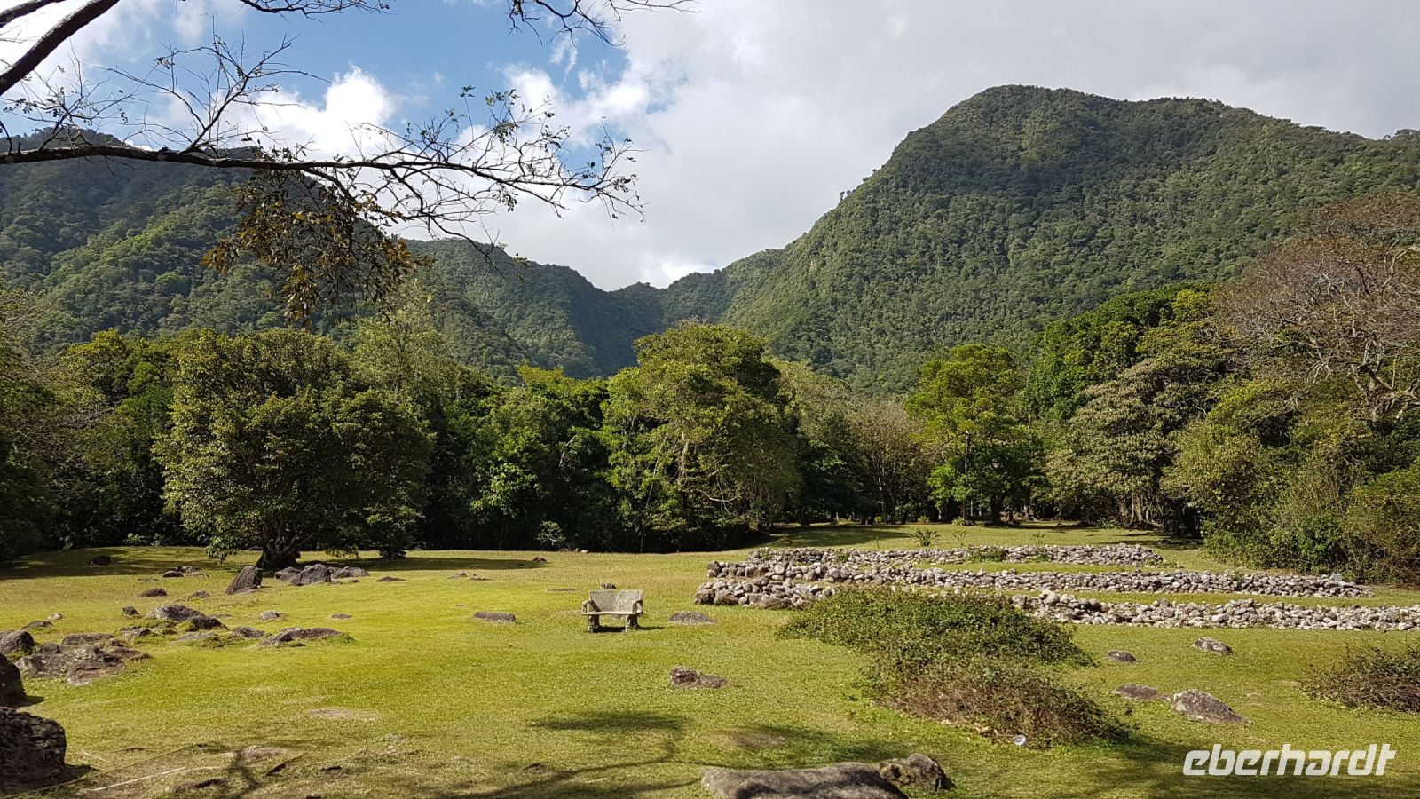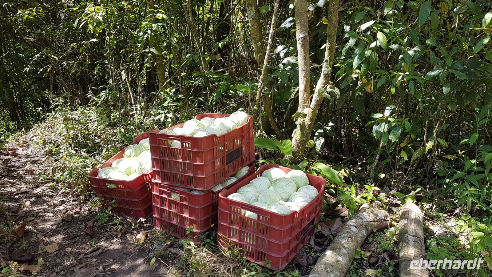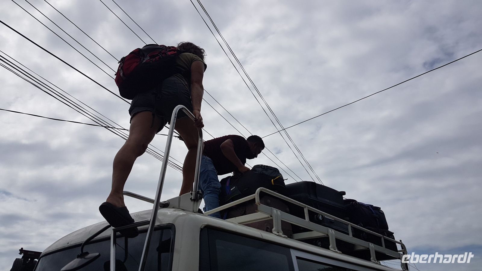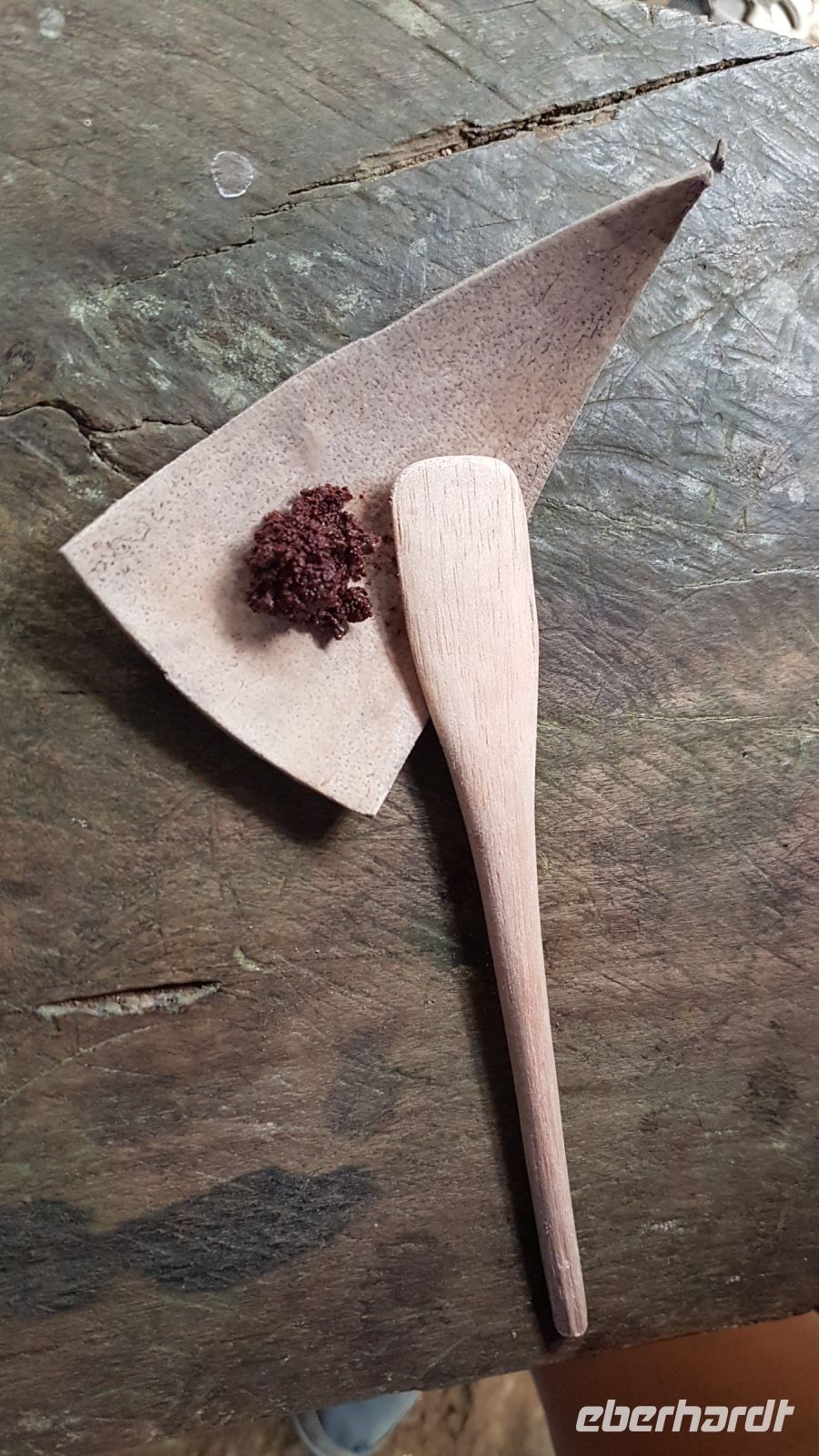 Unsere Zeit in den Bergen ging zu Ende. Also packten wir wieder unsere Koffer, die unser Fahrer Kenny sehr geschickt auf das Dach seines Busses verlud. Wir ließen uns unser Frühstück schmecken und waren recht bald wieder auf Tour in unserem Bus. Wir verließen das fruchtbare Kaffee-Tal um Boquete und unser Bus erklomm Meter um Meter entlang teils steiler Serpentinenstraßen. An einem schönen Aussichtspunkt legten wir einen Halt ein, um zurückzuschauen und noch einmal in Richtung Pazifik zu blicken. Erst in Panama-Stadt würden wir ihn wieder sehen. Unser Bus schraubte sich weiter in die Höhe, erklomm den Pass mit Namen: Gebiss des Teufels (quijada del diablo) in etwa 1.700 m Höhe. Danach ging es allmählich wieder bergab, denn unser Ziel war heute die karibische Seite von Panama. Doch zunächst statteten wir der Dorfgemeinschaft von Oeste einen Besuch ab. Die Einwohner gehören zum Volk der Ngöbe, deren Frauen traditionelle bunte Kleider tragen. Die Dorfgemeinschaft lebt hauptsächlich vom Kakao, der hier aufgrund der klimatischen Verhältnisse sehr gut und in hoher Qualität gedeiht. Wir wurden mit einem typischen Mittagessen begrüßt, das aus Blaukartoffel, Reis und Fisch sowie Bananen und Schokoladenkuchen bestand. Das Hauptgericht war in einem großen Blatt der Blaukartoffelpflanze hübsch verpackt und dieses Blatt ersetzte uns den Teller. Nach dem Essen wurden wir in die Welt des Kakao entführt. Wir durften durch das Dorf und zu den Kakao-Pflanzen wandern, ein Dorfbewohner erklärte uns, wie sie den Kakao hier anbauen und dass seit 44 Jahren ein Pilz ihnen viele Verluste für die Ernte bringt, besonders wenn es feuchte Jahre sind. Eine junge Frau der Gemeinschaft begleitete uns und zeigte uns die ein oder andere Pflanze, die die Menschen hier nutzen, zum Beispiel eine Art Agave, aus deren Pflanzenfasern hier Taschen und Beutel angefertigt werden.