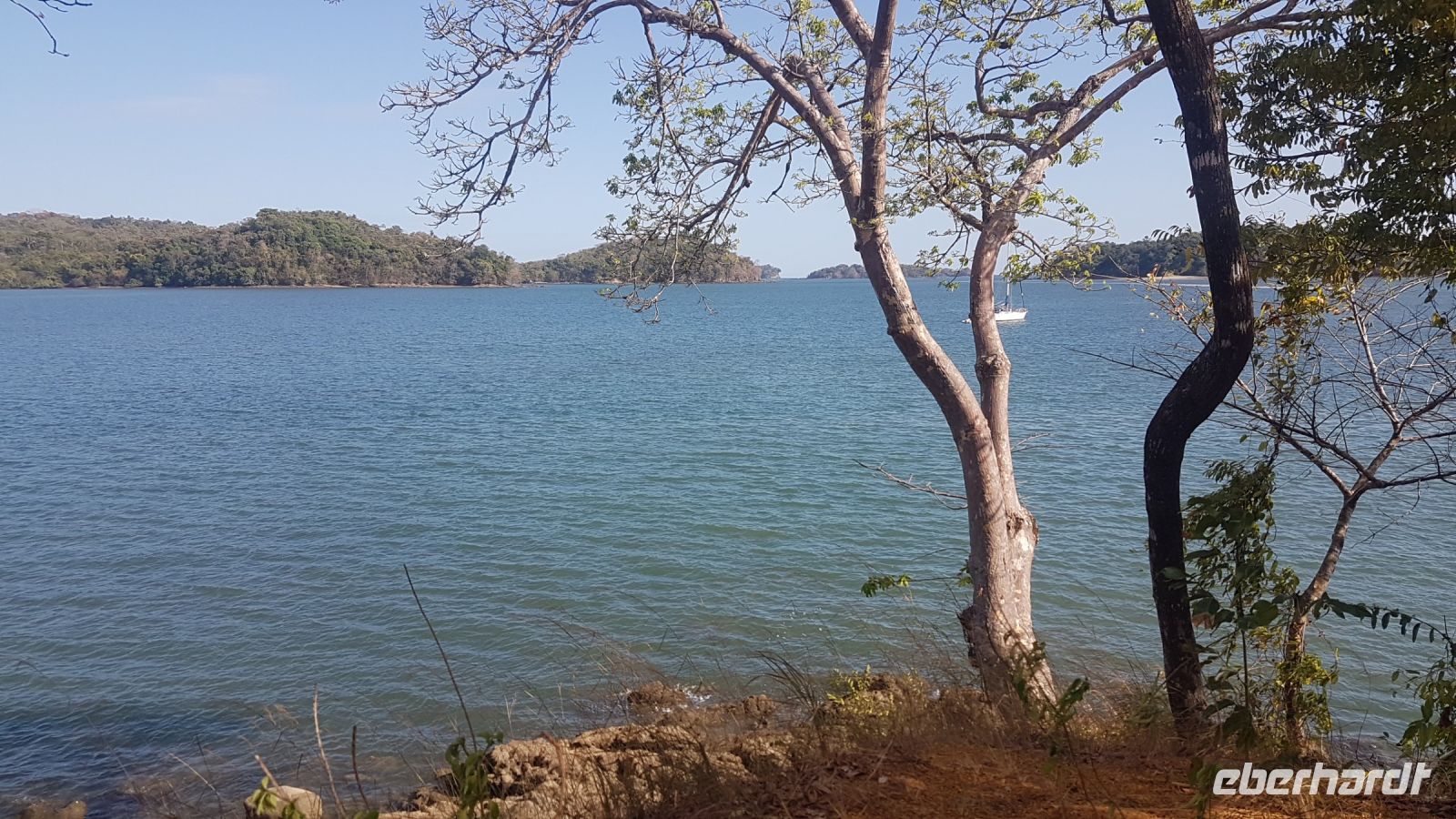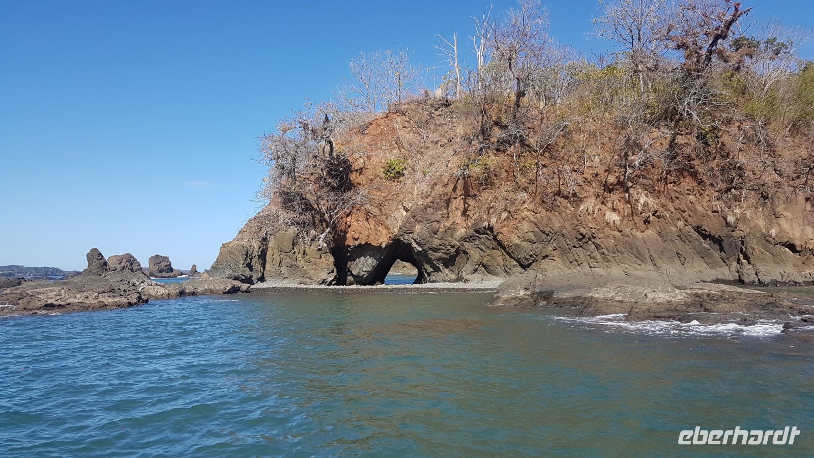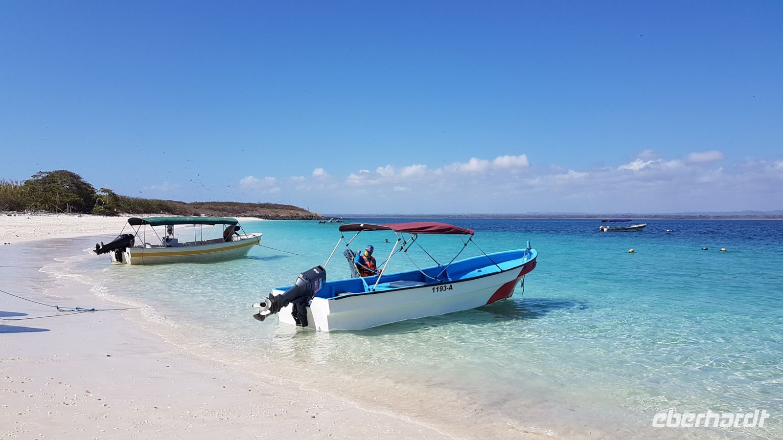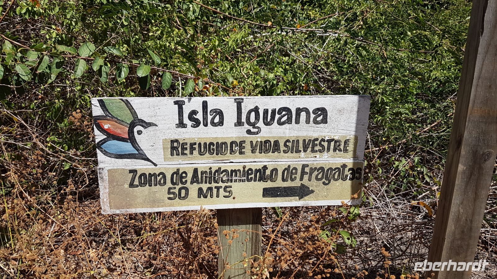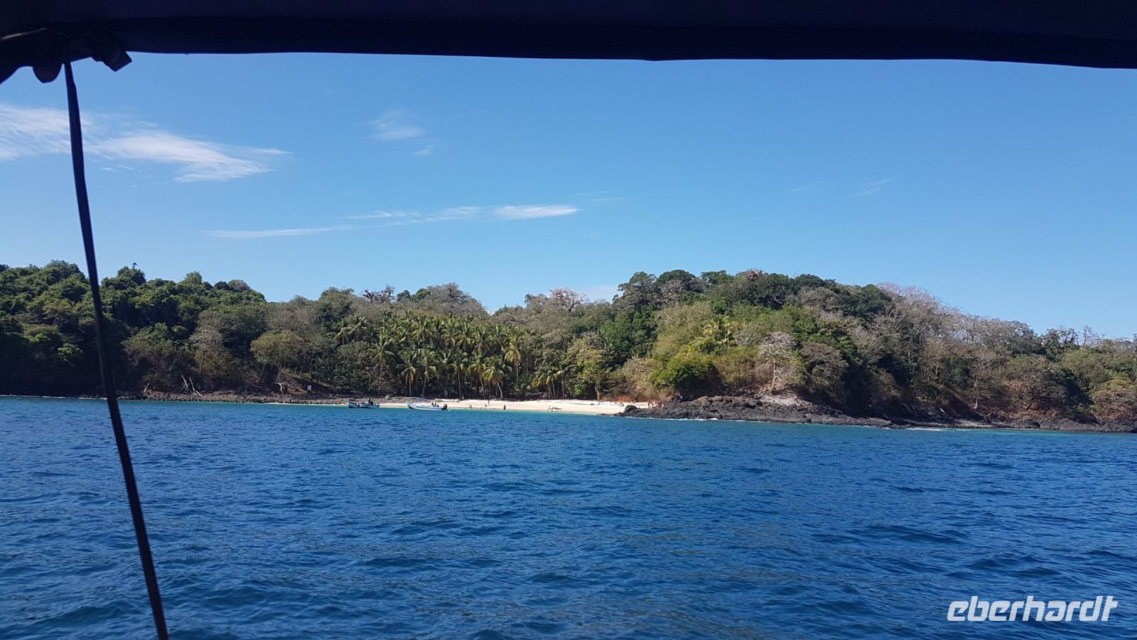 Am Morgen holte uns unsere Reiseleiterin Fine wieder vor unserem Hotel ab, wir stiegen in unseren Bus und fuhren nach Pedasi. An der örtlichen Anlegestelle kletterten wir in drei Schnellboote, die uns auf die nahe gelegene Isla Iguana brachten, die Insel der Leguane. Wir spazierten begleitet von Fine auf die Rückseite der Insel zu einem anderen Strand mit Felsen. Hier konnten wir Fregattvögel beobachten, die auf der Insel nisten. Ständig kreisen Hunderte von ihnen über der Insel. In den Nestern konnte man Weibchen sitzen sehen, die eine weiße Färbung am Kopf haben. Die Männchen sind mit einem roten Kehlsack ausgestattet, den sie kräftig aufblähen, wenn sie den Weibchen imponieren wollen, begleitet von einem knatternden Geräusch. Wir kletterten über schwarze Felsen aus Lavagestein und wanderten durch Pfade im teils dichten, teils spärlichen Grün. Natürlich sahen wir Leguane, aber auch Geckos, zahllose Einsiedlerkrebse und verschiedene Vogelarten.