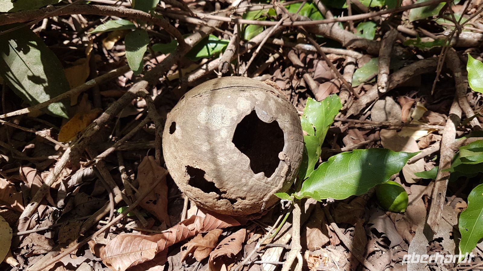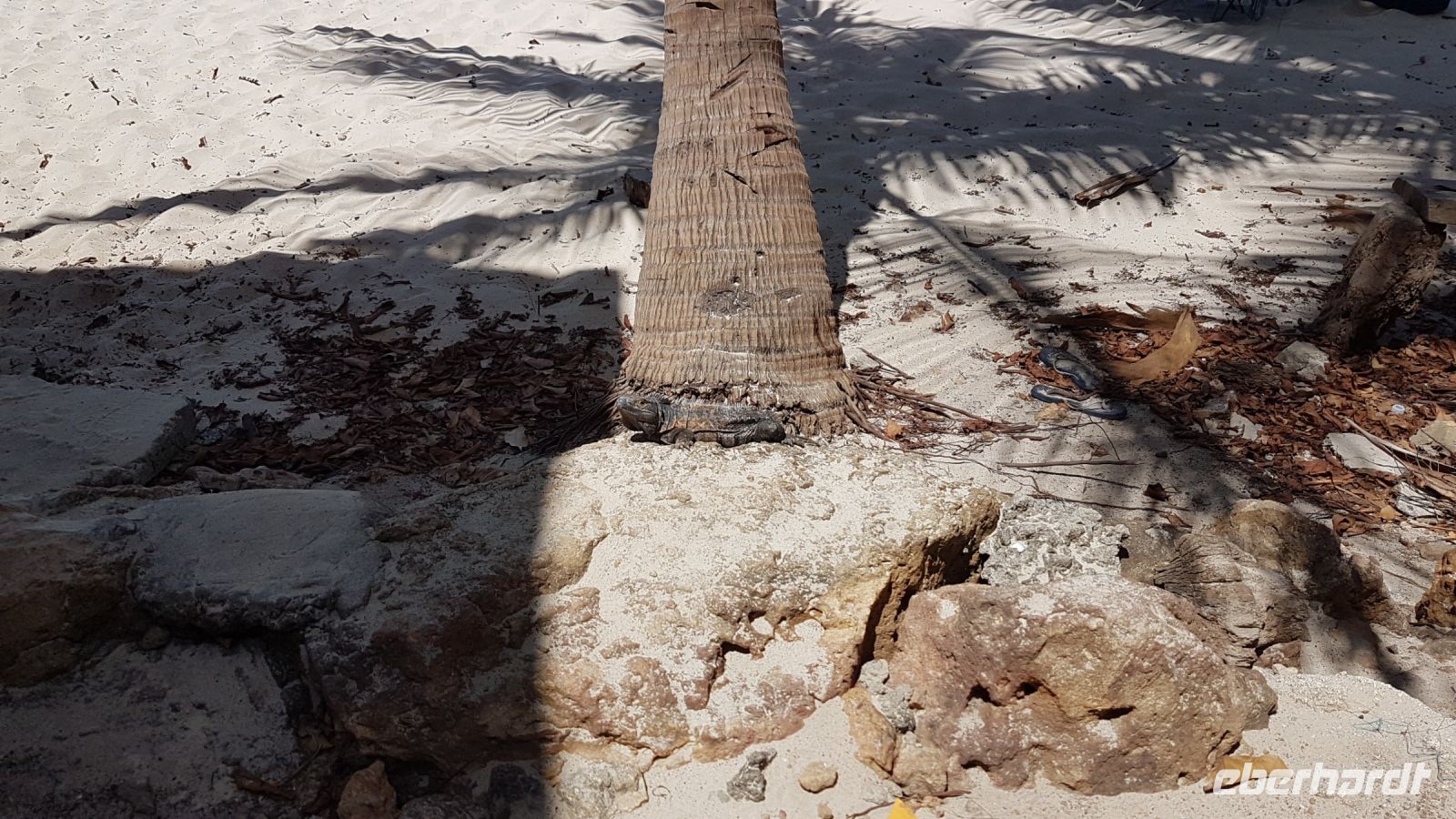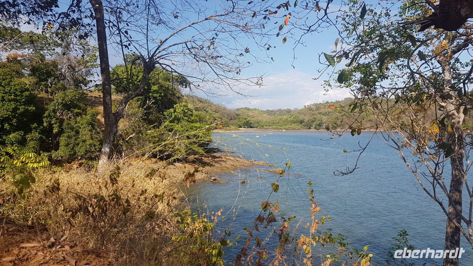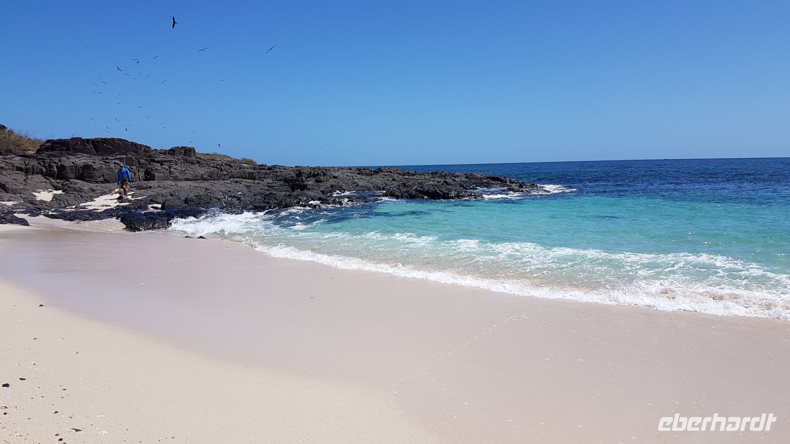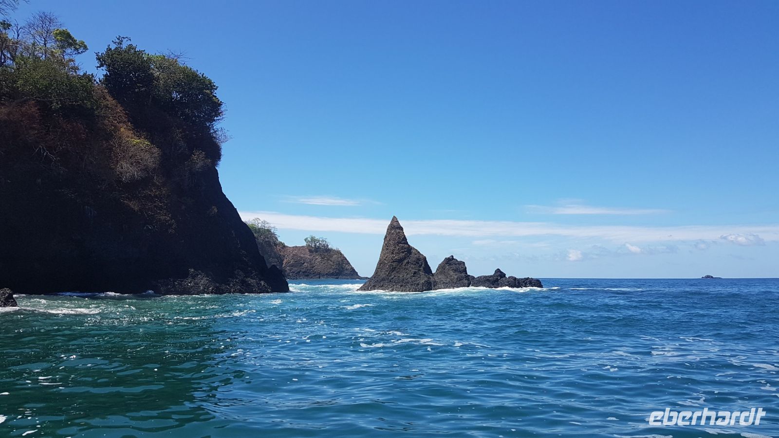 Am Morgen holte uns unsere Reiseleiterin Fine wieder vor unserem Hotel ab, wir stiegen in unseren Bus und fuhren nach Pedasi. An der örtlichen Anlegestelle kletterten wir in drei Schnellboote, die uns auf die nahe gelegene Isla Iguana brachten, die Insel der Leguane. Wir spazierten begleitet von Fine auf die Rückseite der Insel zu einem anderen Strand mit Felsen. Hier konnten wir Fregattvögel beobachten, die auf der Insel nisten. Ständig kreisen Hunderte von ihnen über der Insel. In den Nestern konnte man Weibchen sitzen sehen, die eine weiße Färbung am Kopf haben. Die Männchen sind mit einem roten Kehlsack ausgestattet, den sie kräftig aufblähen, wenn sie den Weibchen imponieren wollen, begleitet von einem knatternden Geräusch. Wir kletterten über schwarze Felsen aus Lavagestein und wanderten durch Pfade im teils dichten, teils spärlichen Grün. Natürlich sahen wir Leguane, aber auch Geckos, zahllose Einsiedlerkrebse und verschiedene Vogelarten.