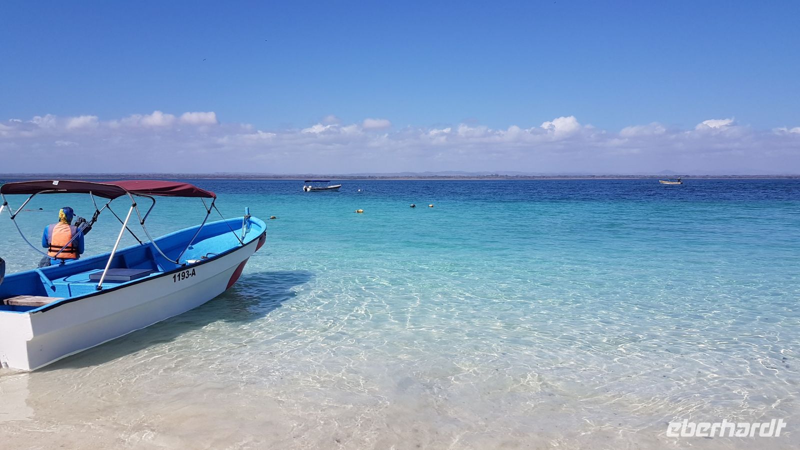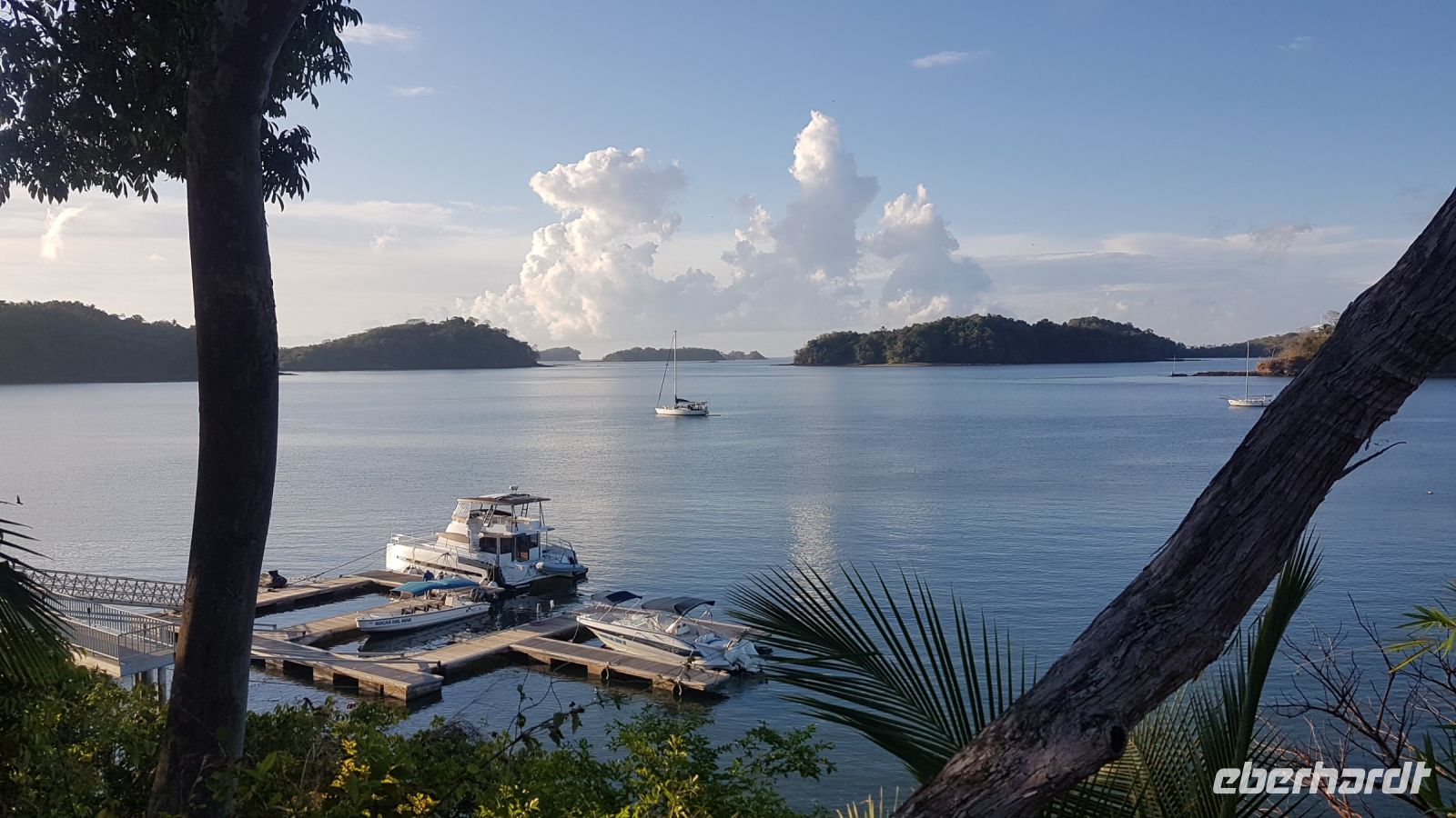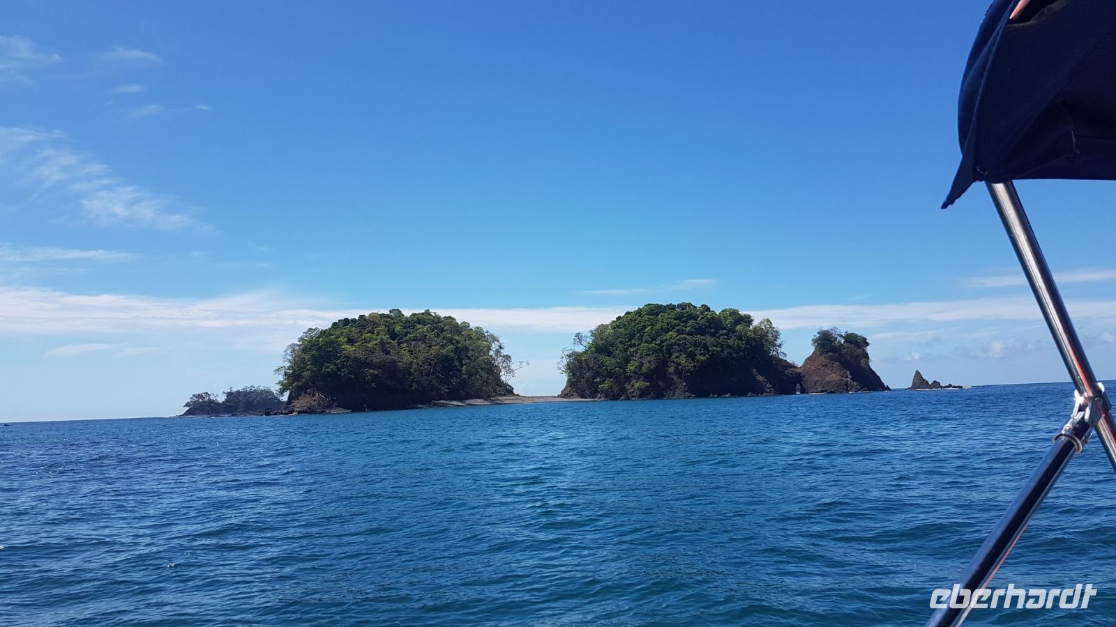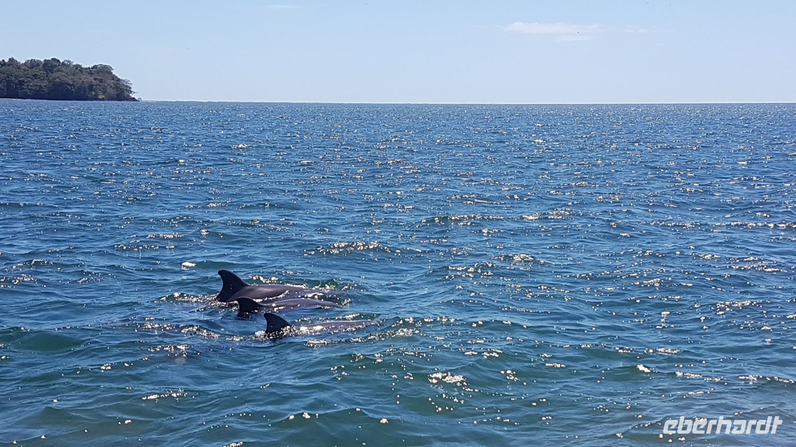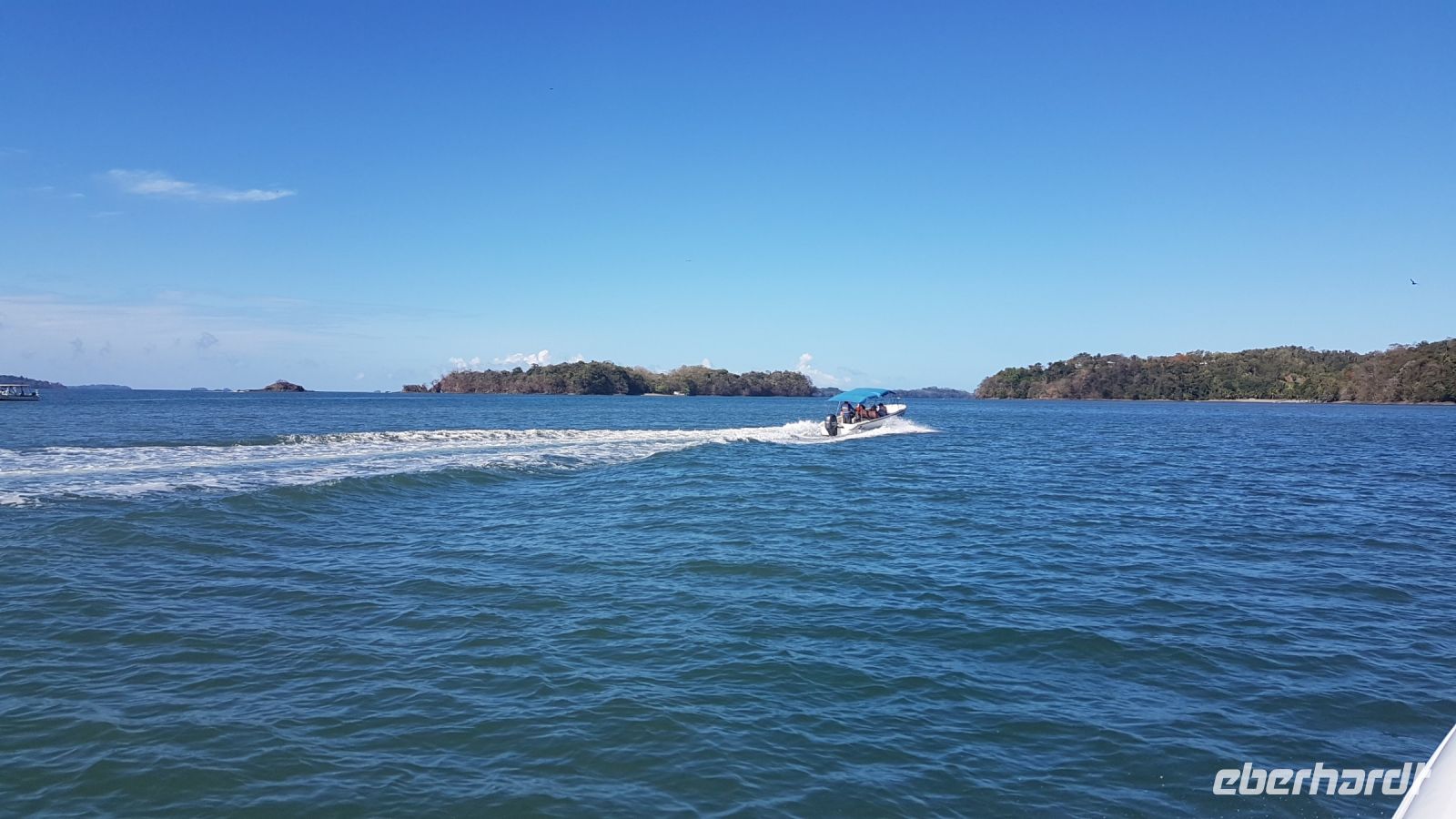Nach dem Frühstück holte uns Orlando vom Hotel Bocas del Mar ab und wir spazierten hinunter zum Bootsanleger. Mit zwei Schnellbooten fuhren wir los in den Golf von Chiriqui. Unterschiedliche Inseln laden zum Verweilen oder auch zum Beobachten von Tieren ein. Wir passierten die „Fensterinsel“, in der durch die Erosion der Wellen schon tunnelartige Durchlässe zu sehen sind, die sogenannten „Fenster“. Vor der Insel Bolanos konnten wir schnorcheln, bei einer Panoramafahrt sahen wir unter anderem die Bischofsinsel, ihre Form erinnert an eine Bischofsmütze. Die Strände der Insel Gamez ließen wir an uns vorbeiziehen. Dort tummelten sich Sonntagsausflügler mit „Kind und Kegel“ bei lauter panamaischer Musik. Wir hingegen suchten die Ruhe und fuhren weiter zur Insel Socorro. Dort erwartete uns schon ein leckeres Picknick, das vom Hotel aus hier vorbereitet worden war: frittierte Huhn- oder Fischbällchen, Salate und Obst, Sandwiches sowie eine große Kiste voller eisgekühlter Getränke. Wir genossen die Zeit, ließen uns das Picknick schmecken, badeten im türkisblauen Meer oder entspannten im Schatten mit Blick auf Kokospalmen und idyllischen Strand. Wir probierten Kokosnuss-Schaum, was vielen von uns neu war. Auf dem Rückweg zum Hotel passierten wir Battia de los muertos, ein Bereich im Golf, der von den vor den Spaniern hier lebenden Indios dafür benutzt wurde, ihre Verstorbenen dem Meer zu übergeben. Heute tummeln sich dort Flaschennasendelfine, die auch neben unseren Booten ein Stück mit schwammen. Wer schnell war, konnte sie fotografieren. Am frühen Nachmittag erreichten wir unser komfortables Hotel, der Rest des Tages stand uns zur freien Verfügung.