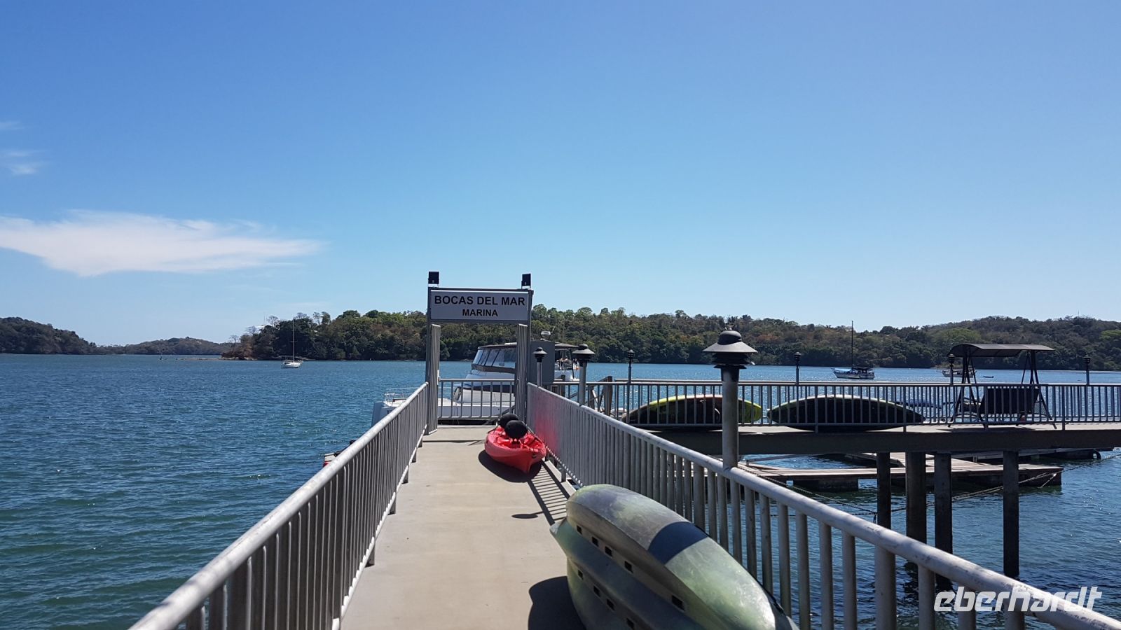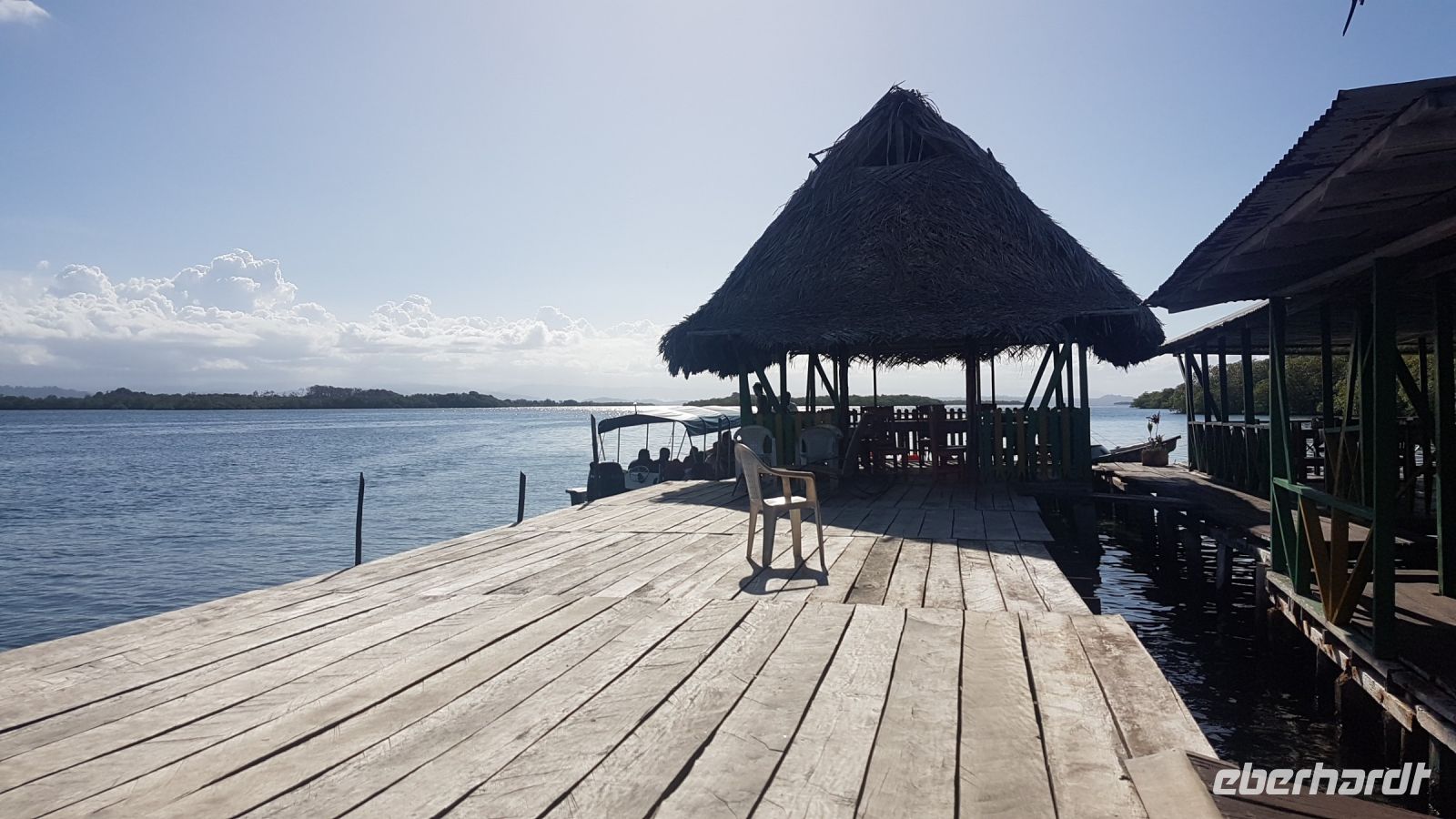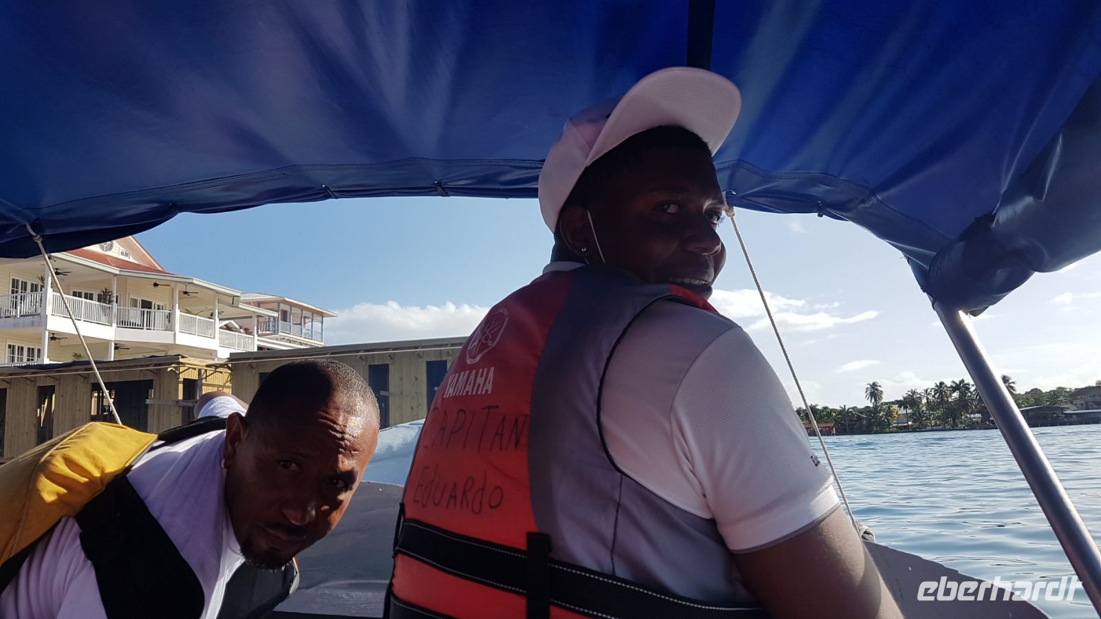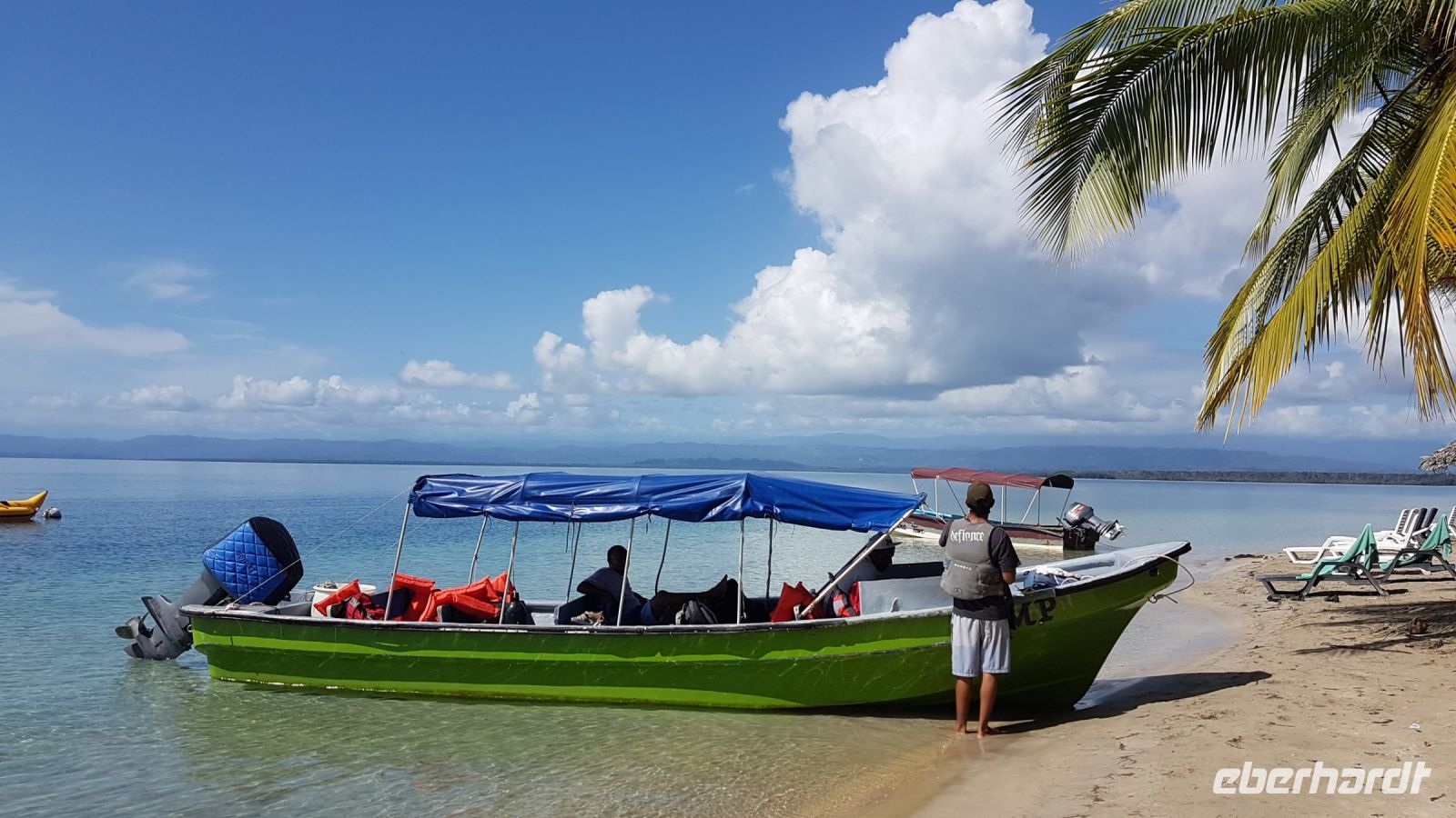 Nach kurzer Fahrt erreichten wir den Hafen von Almirante. Unser Gepäck wurde vom Bus in ein Schnellboot geladen, wir stiegen ebenfalls ein und sausten mit hoher Geschwindigkeit vom Festland hinüber auf die Insel Colon. Dort angekommen, wurden wir von zwei Kleinbussen erwartet, unser Gepäck wurde erneut umgeladen und so erreichten wir bald unser Hotel Tortuga in Bocas del Toro. Wir genossen den restlichen Nachmittag und badeten in der Karibik oder ruhten uns ein wenig von der anstrengenden Anreise aus. Am Abend sahen wir uns alle wieder im Restaurant des Hotels, das sich auf einer Art Seebrücke über dem Wasser der Karibik befindet. Wir ließen den Abend bei karibischer Musik und Meeresrauschen ausklingen.