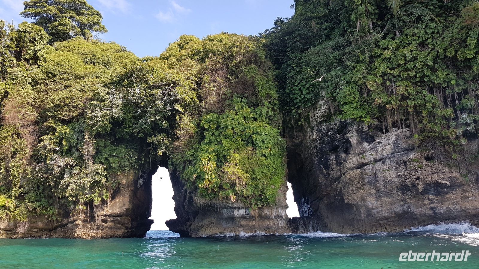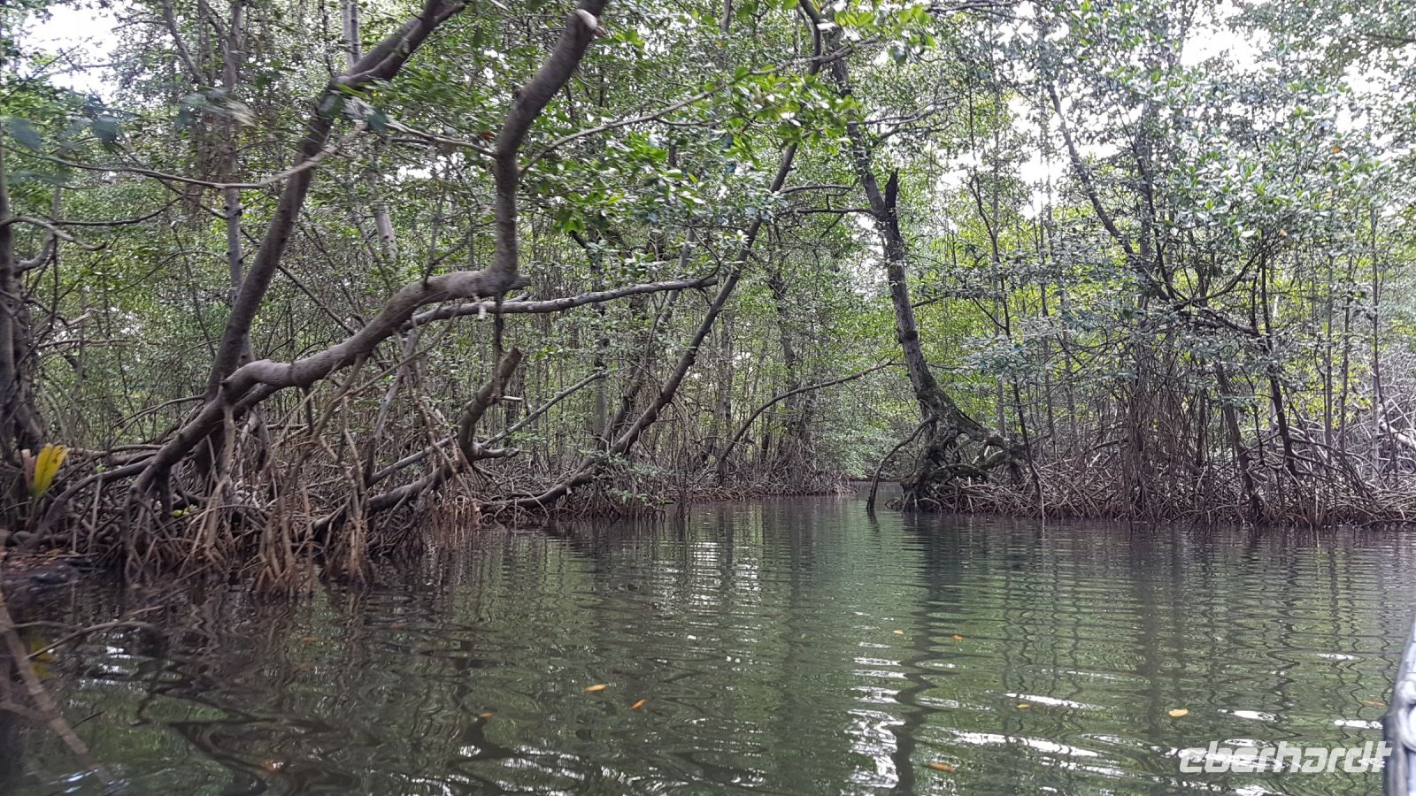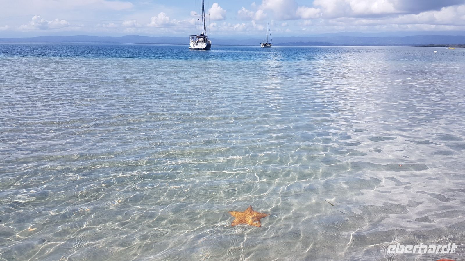 Wir verließen unser Hotel für einen Ausflug in die Welt der kleinen Inseln im karibischen Teil Panamas. Am Hafen in Bocas del Toro bestiegen wir ein kleines Boot, das uns zunächst zur Vogelinsel Bird Island brachte. Diese kleine Insel steht unter Schutz, hier nisten zahlreiche Seevögel, unter anderem Tropicvögel, die mit ihrem langen weißen Schwanz sehr elegant über uns hinweg flogen. Es gibt Fregattvögel und Pelikane. Am karibischen Strand Estrella Beach legten wir das erste Mal an. Wir stiegen aus unserem Boot und genossen den feinen Sand, das warme karibische Wasser und den palmengesäumten Strand. Das Besondere dieses Strandes sind aber die tierischen Bewohner, die im flachen Wasser auf dem feinen Sand liegen und sehr gut zu fotografieren sind, denn sie sind reglos und scheinen sich nicht von der Stelle zu rühren: zahlreiche orangefarbene Seesterne. Nach unserem Aufenthalt an der Estrella Beach brachte uns unser Boot zu den Mangrovenwäldern der Insel Bastimentos. Langsam glitten wir an den dichten grünen Mangroven vorbei und hielten Ausschau nach Faultieren und Kaimanen. Das ein oder andere Faultier konnten wir im Laufe dieses Ausfluges hier entdecken. Mitten im Mangrovengebiet wohnen einige Mitglieder der indigenen Volksgruppe der Ngöbe. In ihrem Lebensraum gibt es eine langgezogene Höhle, in der verschiede Arten von Fledermäusen ihr zu Hause haben und an den Tropfsteinen der Decke der Höhle ausruhen. Darüber hinaus gibt es verschiedene Spinnen, die an den felsigen Wänden in der Höhe leben. Einige Mutige unserer Gruppe stiegen mit einem einheimischen Führer in die Höhle hinein, deren Boden mit Wasser bedeckt ist. Mit Badesachen bekleidet und einer Stirnlampe auf dem Kopf ging es hinein in die Höhle bis zu einem Schwimmbecken im Fels, das etwa drei Meter tief ist und von einem kleinen Wasserfall gespeist wird. Die anderen Gäste spazierten im tropischen Wald vor der Höhle mit einem anderen Führer und bestaunten die üppige Vegetation mit Baumfarn, Helikonien und Palmen. Faultiere und winzige orange-rote Pfeilgiftfrösche konnten sie beobachten.