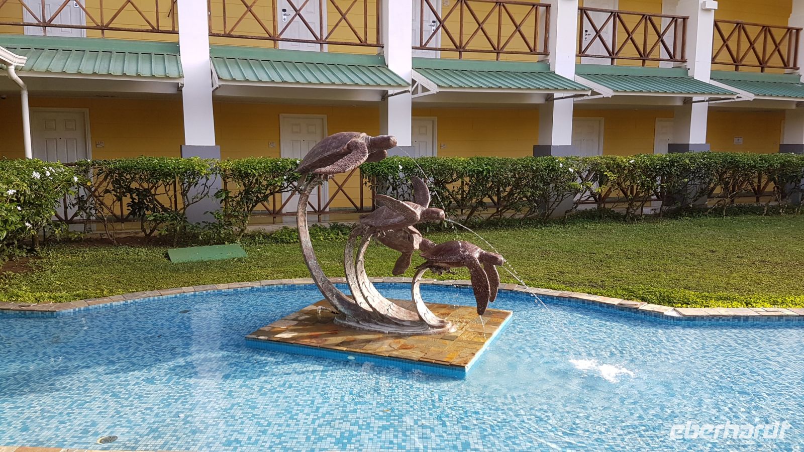Nach unserer sehr angenehmen Mittagspause setzten wir unsere Fahrt fort. Es dauerte nun nicht mehr lange, und wir erreichten unser Hotel Bocas del Mar in Boca Chica für die nächsten zwei Nächte. Wir wurden begrüßt mit einem kühlen Glas Saft und bezogen unsere komfortablen Zimmer, die sich ein einer wunderschön angelegten Gartenanlage mit zwei Pools, einem schönen Restaurant, einigen blauen Schafen als Kunstinstallation sowie herrlichen Ausblicken auf die Bucht von Chiriquí befinden. Wir erkundeten die Anlage, ein Wanderpfad führt zu einem Aussichtspunkt, auch vorbei an einer großen Voliere mit verschiedenen Papageien und Tucanen. Einige genossen den Garten, andere entspannten auf der Terrasse ihres Zimmers oder nahmen eine erste Erfrischung im Restaurant. Am Abend trafen wir uns wieder zu einem gemeinsamen Abendessen im Hotelrestaurant, das eine vorzügliche Küche bietet. Der „Fang des Tages“ war Red Snapper, den einige auch gleich probierten.