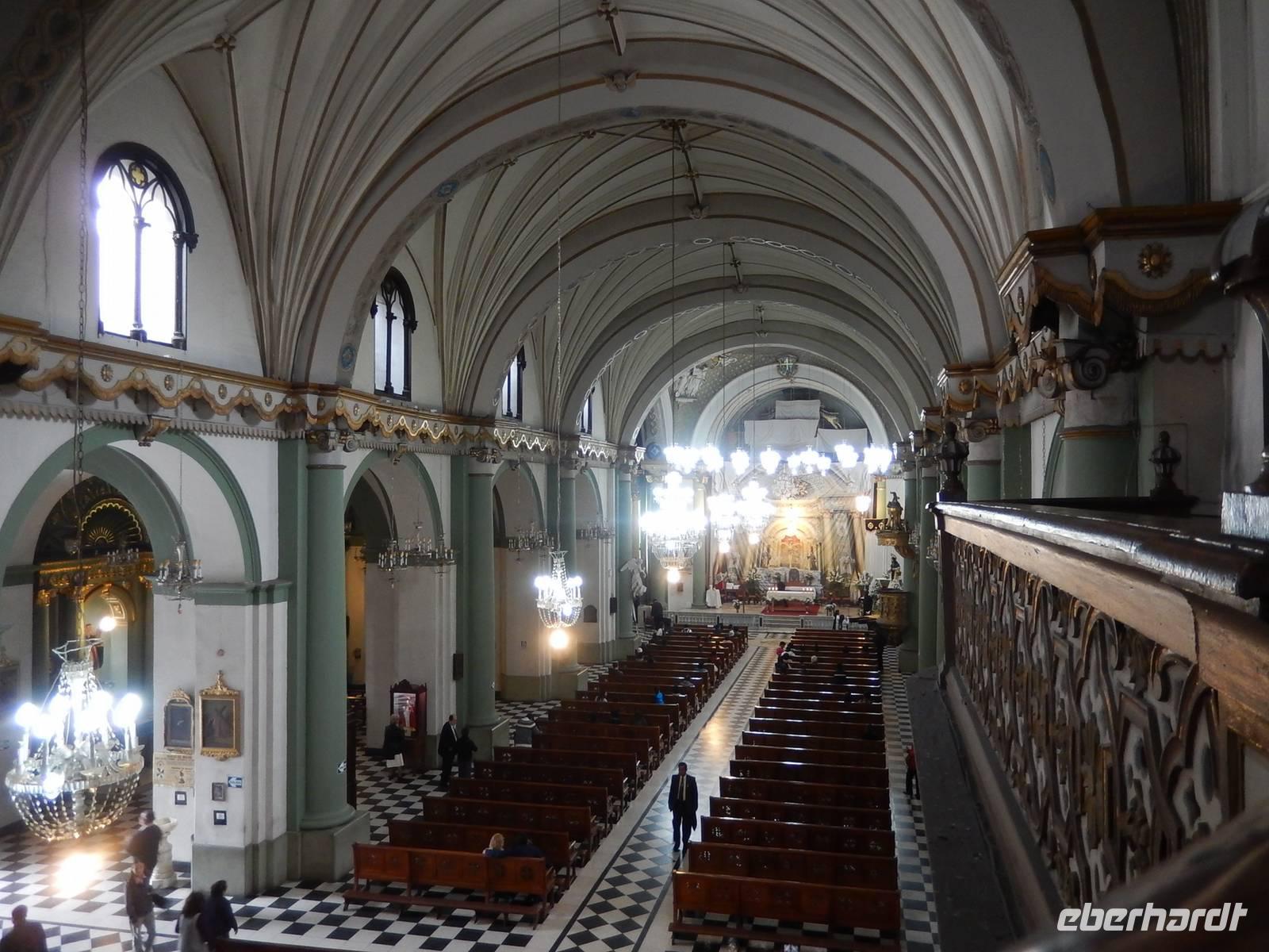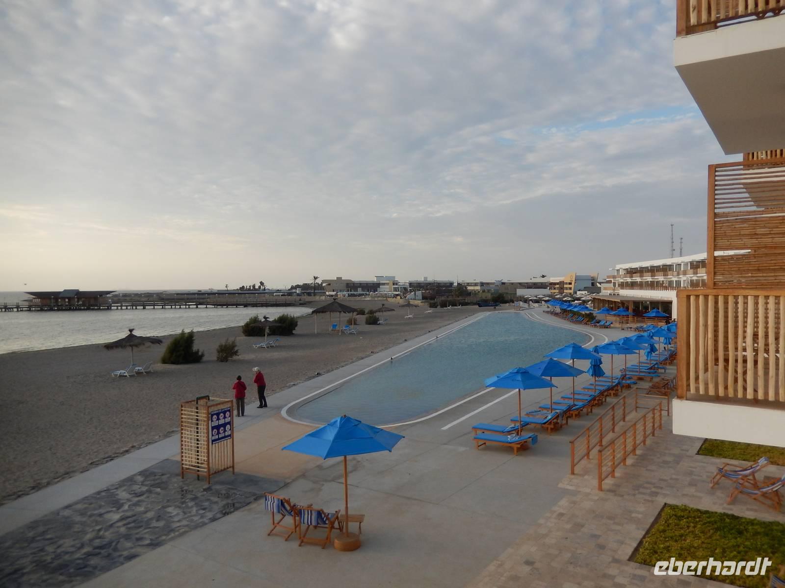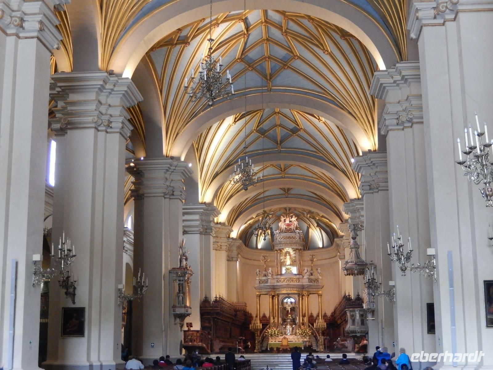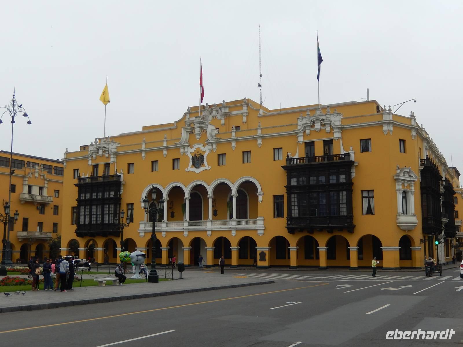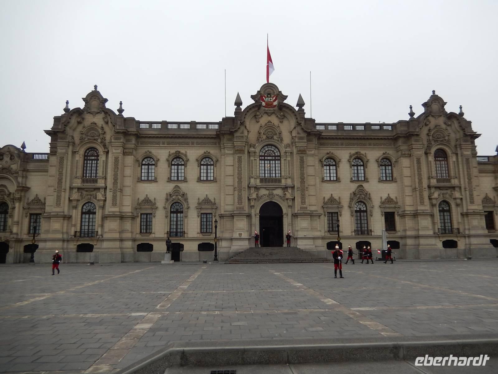 Trotz der Erschöpfung vom Vortag sind heute alle übermäßig pünktlich zum Frühstück und wie sich das gehört, werden gleich die ersten landdestypischen Speisen probiert. Um 09.00 Uhr erwarten uns dann Karina und unser Busfahrer Jorge Luiz zur Stadtrundfahrt in Lima. Vorher müssen wir aber alle erstmal unseren Pass von der Rezeption holen und kontrollieren, ob der Einreisezettel auch beiliegt. Dies wird unser Ritual für die kommenden Tage, in jedem Hotel Pass abgeben, am Folgetag wieder abholen, Zettel kontrollieren... Wir starten den Besuch der Millionenmetropole am Pazifik mit einem Fotostopp am Parque del Amor, einem kleinen Park in Miraflores dem der Güell-Park in Barcelona als Vorbild diente und der dominiert wird von einer riesigen Statue „Der Kuss". Die ersten Fotos schießen wir und dann fahren wir weiter in Richtung Altstadt, u.a. vorbei an einem riesigen Pyramidenkomplex, der noch aus der Zeit der Besiedlung des heutigen Gebietes von Lima stammt. Das 28 Meter Hohe Bauwerk diente als Opferstätte und wurde größtenteils aus Lehnziegeln geschaffen. Karina füttert uns mit Informationen zur Geschichte der Stadt vor allem auch aus der Zeit als Lima ein gefährliches Pflaster war und sich die terroristischen Vereinigungen von Tupac Amaru und Senduro luminoso erbitterte Kämpfe lieferten, die Mehrheit der Bevölkerung darum aus der Innenstadt floh und Lima auch die Beinamen wie „die Hässliche" oder „die Schreckliche" trug. Vorbei am Parque de la Exposicion, dem Plaza Miguel Grau und dem Justizpalast fahren wir nun zum Plaza Mayor, dem Zentrum der Altstadt. Uns bietet sich ein fantastisches Ensemble von Kathedrale, Erzbischöflichem Palast, Regierungspalast, Rathaus, Finanzamt etc. Wir stoppen für Fotos und beginnen dann einen kleinen Spaziergang mit Karina, der uns u.a. vorbei am ehemaligen Postamt zuerst zum noch in Betrieb befindlichen Dominikaner-Kloster „Heiligtum der Heileigen Rosa von Lima" führt. Karina führt uns und neben handwerklichen Meisterleistungen beeindruckt vor allem der wunderschöne Patio im Inneren der Anlage, die altehrwürdige Bibliothek mit über 23.000 - teils original erhaltenen - Büchern und natürlich die Kirche an sich. Besonderer sportlicher Höhepunkt des Morgens wird die Besteigung des Glockenturms, von dem man einen super Rundblick auf die Stadt genießen kann, wenn es nicht gerade Nebel hat. Nach dem Abstieg und noch ein paar Besichtigungen, beginnen wir gemütlich über eine Fußgängerzone zum Plaza de San Martin zu schlender, ein prunkvoller Platz zu Ehren des Gründers Perus im Jahre 1821. Hier besuchen wir das ehrwürdige Hotel Bolivar und genießen eine alkoholische Spezialität des Landes - einen Pisco Sour, bestehend aus Pisco (spezieller peruanischer Schnaps aus Traubensaft gewonnen), Limettensaft, Eiweiß und Sirup. Alle finden es echt lecker, auch wenn der Alkohol bei fehlendem Mittagessen und einsetzender Sonne die Müdigkeit befördert. Nebenbei lernen wir mit „Arriba - Abajo - Al Centro y al dentro" auch gleich unseren ersten peruanischen Trnkspruch. Nach dem flüssigen Pausenbrot geht es schnell in den Bus und Richtung Paracas. Wir fahren nach Süden auf der Panamericana, einer der bekanntesten Straßen weltweit. Leider geht die Romantik etwas verloren angesichts voller Straßen vor allem mit LKWs. Die Gegenseite der Panamericana ist über zig Kilometer für eine Ralley gesperrt, an der allerdings gefühlt nur 20 autos teilnehmen, dafür wird ein Kilometer langer Stau aber in Kauf genommen. Wir durchfahren sehr arme Regionen, wo die Häuser hauptsächlich verarmt, wie die Landbevölkerung generell, sind. Bis zum Mittagsstopp dann gegen 16.00 Uhr in Chinch ist noch etwas Zeit und so genießen wir bei einer Mütze Schlaf oder dem Blick auf die Pazifikküste erstmal die Ruhe im Bus. Aber „Langsam, langsam" - wie Karina ständig zu sagen pflegt - nähern wir uns einem zugegebener Maßen sehr chaotischen Stopp an einer Rastmöglichkeit im Städtchen Chincha. Nach unserem Erstkontakt mit Empanadas ist es nicht mehr soweit bis zum Übernachtungsort Paracas. Dieser liegt direkt im Naturschutzgebiet und wir beziehen ein traumhaftes Hotel am Strand mit wundervollem Pool. Jenny, Eva und ich nutzen natürlich dieses Angebot und genießen, wenn auch teilweise bibbernd, einen super Sonnenuntergang überm Meer direkt aus dem Pool heraus. Das gemeinsame Abendessen ist auch in allen Gängen ein Genuss und so gehen wir beseelt zu Bett, denn morgen erwartet uns das erste Riesen-Highlight der Reise....