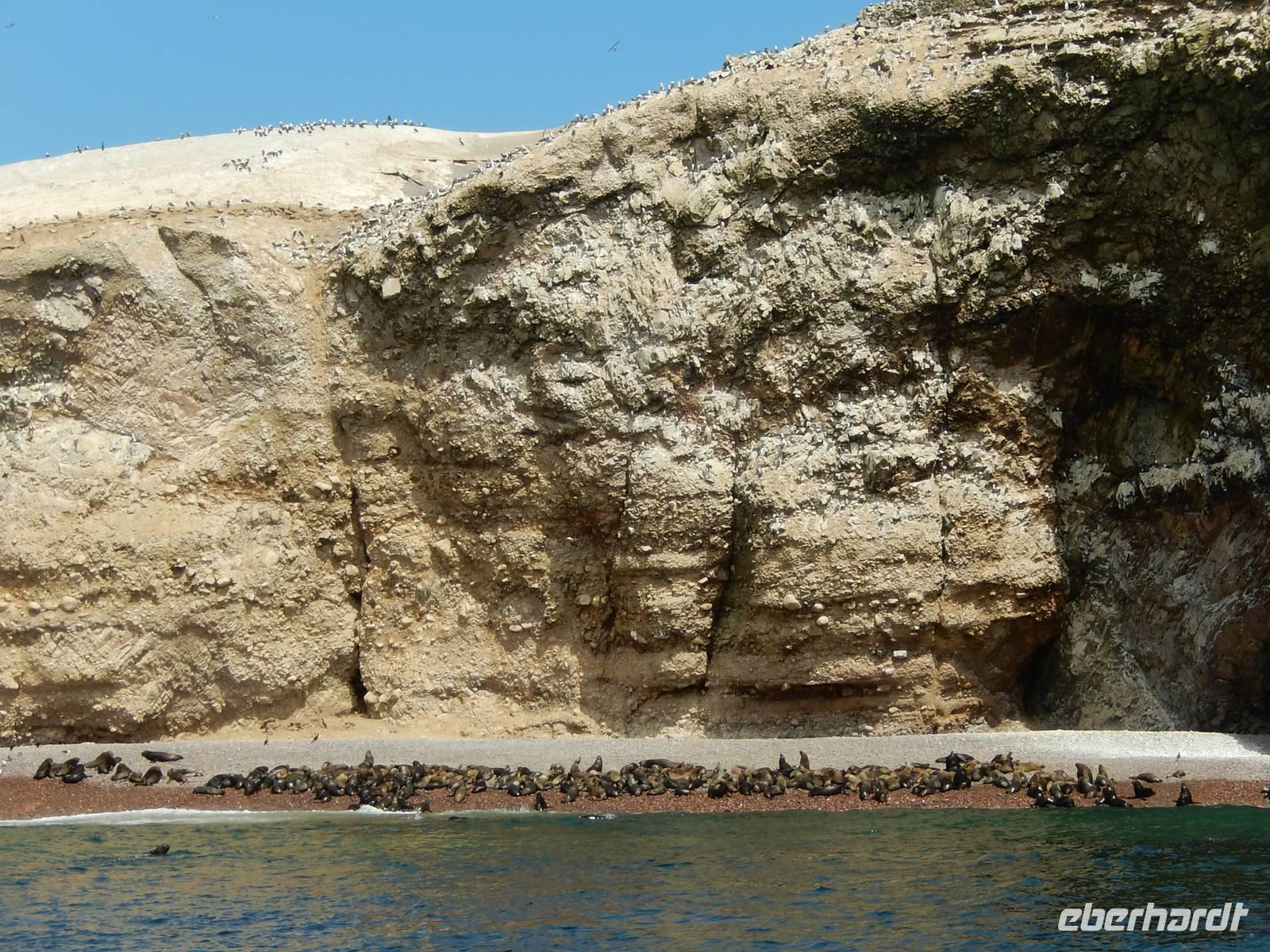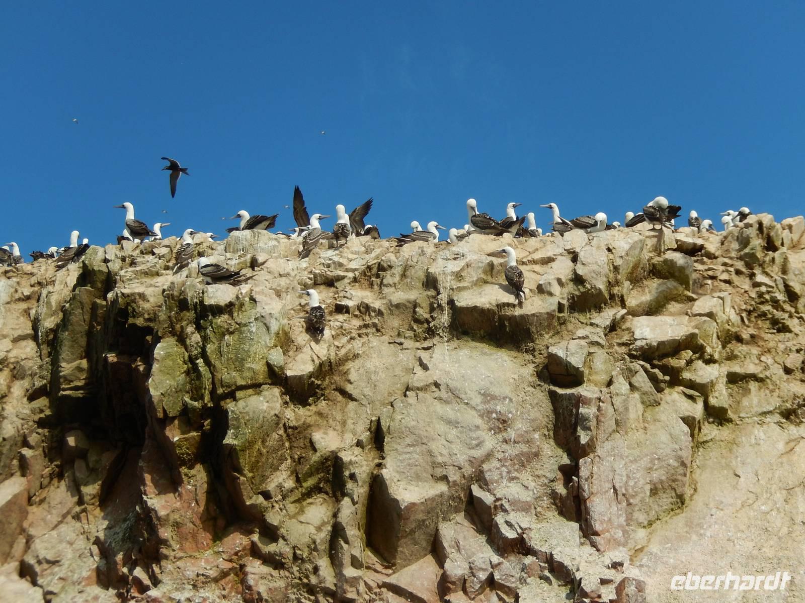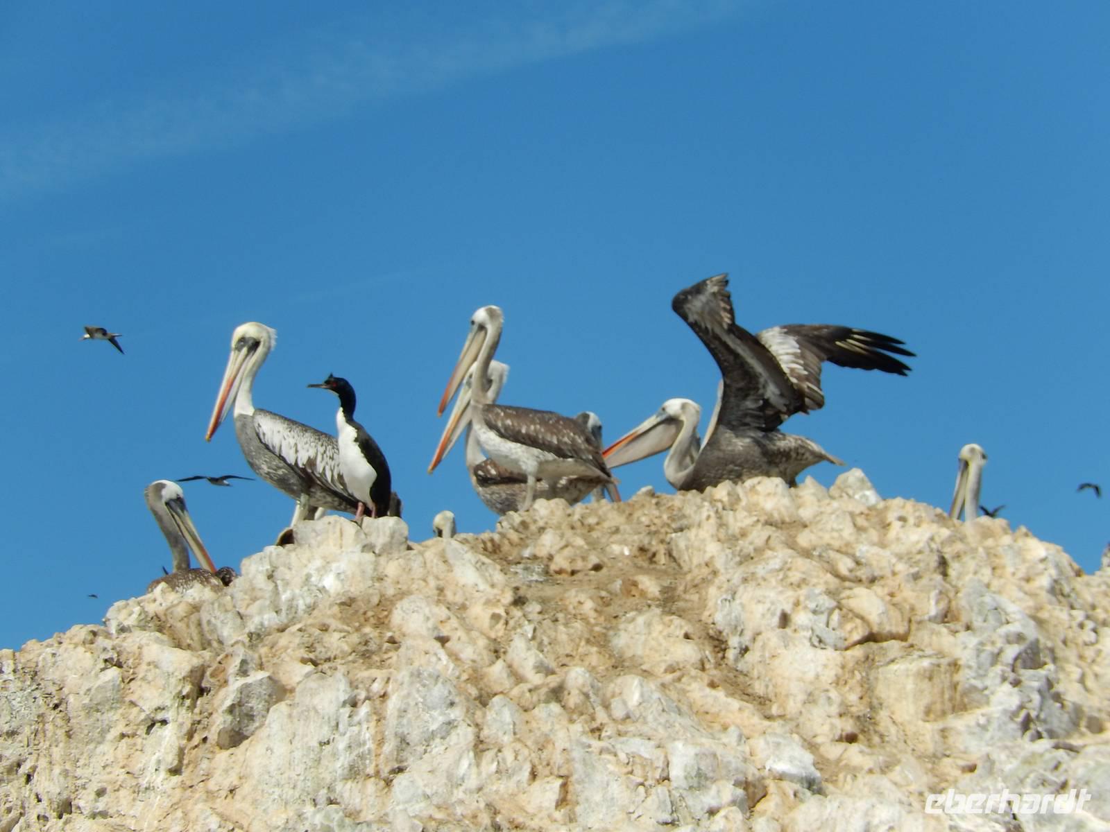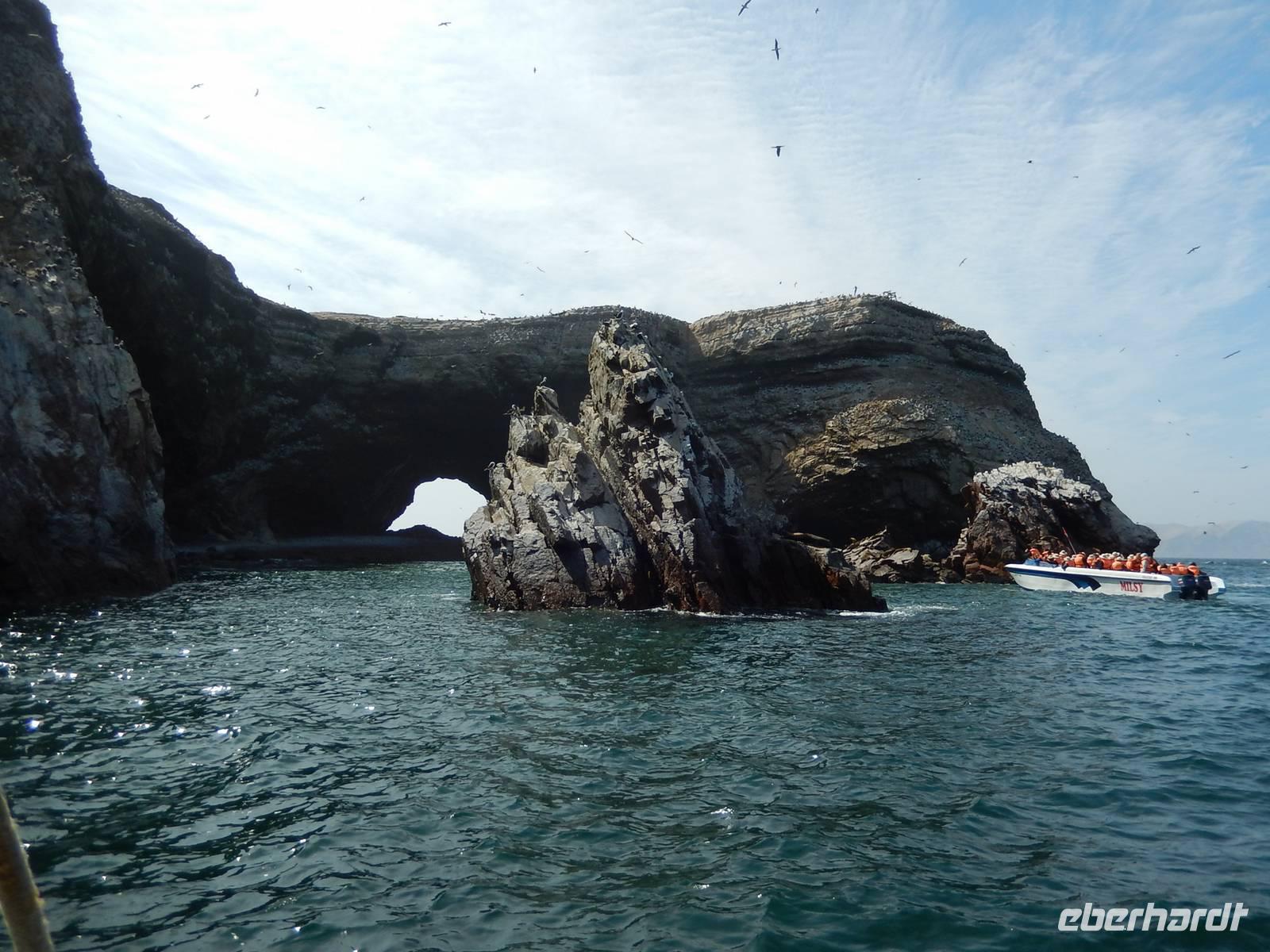 Der Tag steht unter dem Motto: Peru, zu Wasser, zu Land und aus der Luft. Heute müssen wir etwas eher raus, denn die Ballestas-Inseln erwarten unseren Besuch. Erstmal genießen wir das Frühstück und dann bringt uns der Bus in die Nähe des Bootsanlegers. Wir besteigen unser offenes Boot und unser Kapitän Giuliano und der Guide Eric gehen mit uns auf eine erstaunliche Fahrt. Direkt vom Hafen weg werden wir von Delfinen aus dem Hafen geleitet und die ersten Pelikane und Kormorane umfliegen unser Schnellboot. Die See ist ruhig und die Sonne strahlt, also ein idealer Tag für einen Ausflug auf den Pazifik. Der erste Stopp findet an „El Cantelabro" statt, einer riesigen Bilddarstellung an einem Fels, die den Nazcalinien ähnelt. Ob ein Zusammenhang besteht, konnte bisher noch nicht festgestellt werden. Nun geht die Fahrt aber weiter zu den Islas Ballestas mit ihrem unvorstellbaren Vogelreichtum. Faszinierend sind sowohl sowohl die Felsformationen aus bizarren Inseln, Grotten und Felsbögen als vor allem die unglaubliche Anzahl an Kormoranen, Pelikanen, Tölpel etc. Dazu gesellen sich jede Menge Seelöwen und an den Felsvorsprüngen sehen wir Krabben, Muscheln und andere Seefrüchte. Auch die Islas Ballestas zählen zu den sogenannten Guano-Inseln, die Peru zu einem gewissen Reichtum verhelfen. Bei Guano handelt es sich um getrocknete Vogel-Exkremente, die vor allem als Dünger nach Europa exportiert werden. Pro Kilo Guano kann man 1 US-Dollar verdienen und es gibt regelrechte Guano-Arbeiter, die für peruanische Verhältnisse gutes Geld verdienen. Allerdings widmen sie sich nur mit Hacke und Schaufel bewaffnet auch einer der gefährlichsten und gesundheitsschädigenden Jobs der Welt. Per Hand wird das Guano „geerntet" und verpackt und nicht selten erreichen die Arbeiter höchstens das 40. Lebensjahr. Warum können wir erahnen, denn neben der Staubentwicklung können wir die Hauptanteile an Ammoniak und Phosphor vor allem in der Nase spüren. Unser Kapitän umkreist die Inseln gemütlich und so bleibt für alle die Chance auf das beste Foto aller Bewohner - wir sind fasziniert. Warum wir heute die Kopfbedeckung nicht vergessen sollten, wird uns bei dem ein oder anderen „Guano-Regen" auch bewusst... Nach gute einer Stunde an den Inseln geht es rasant zurück in den Hafen und mit einem kleinen Präsent in der Tasche spazieren wir durch das kleine Örtchen zurück zum Hotel. Hier bleibt uns noch Freizeit, die die meisten zu einem weiteren Bad im Pool nutzen. Kurz nach Mittag heißt es dann Koffer verladen und Abfahrt zum Flughafen von Pisco, wo unser nächstes Abenteuer wartet.