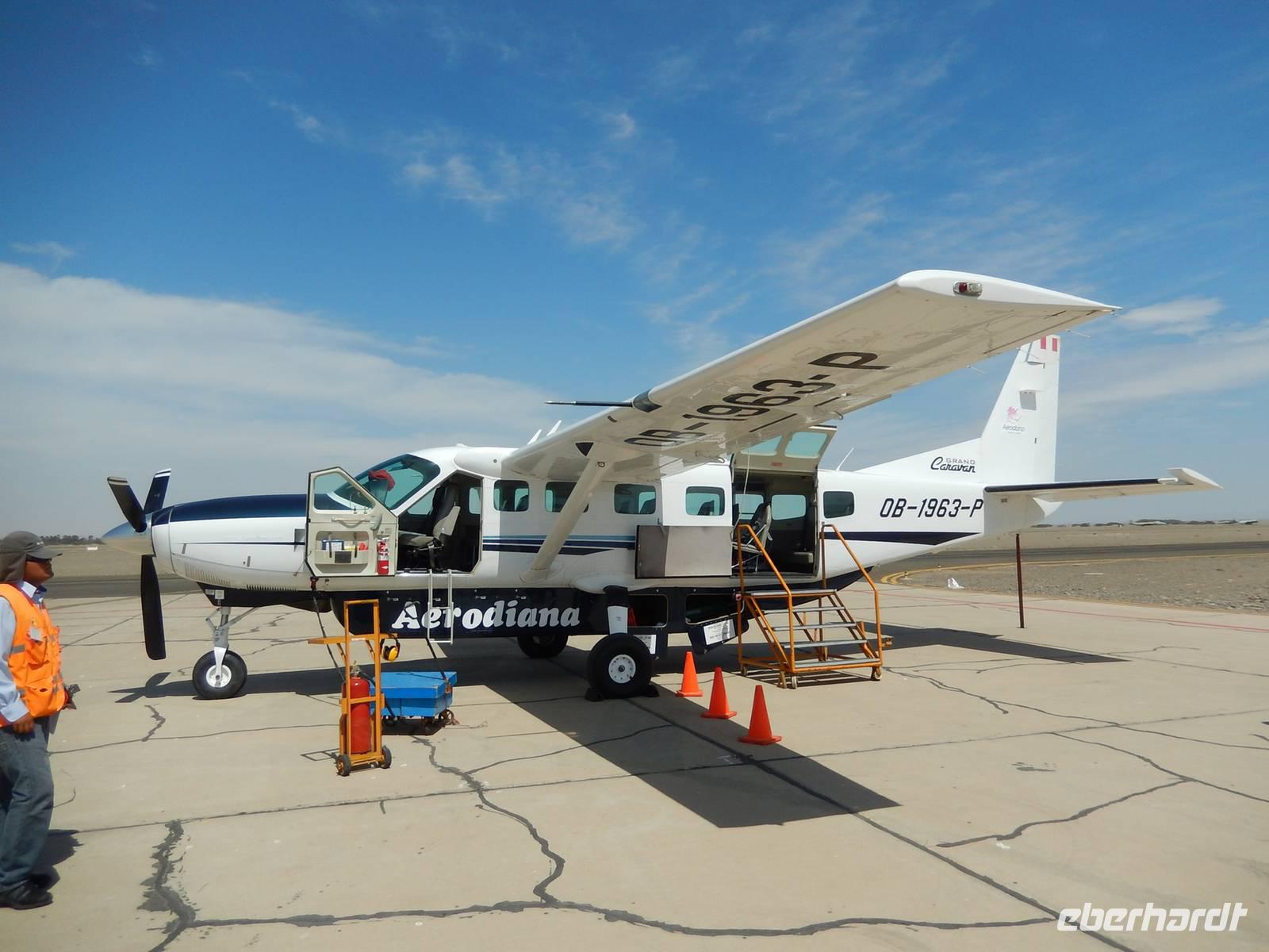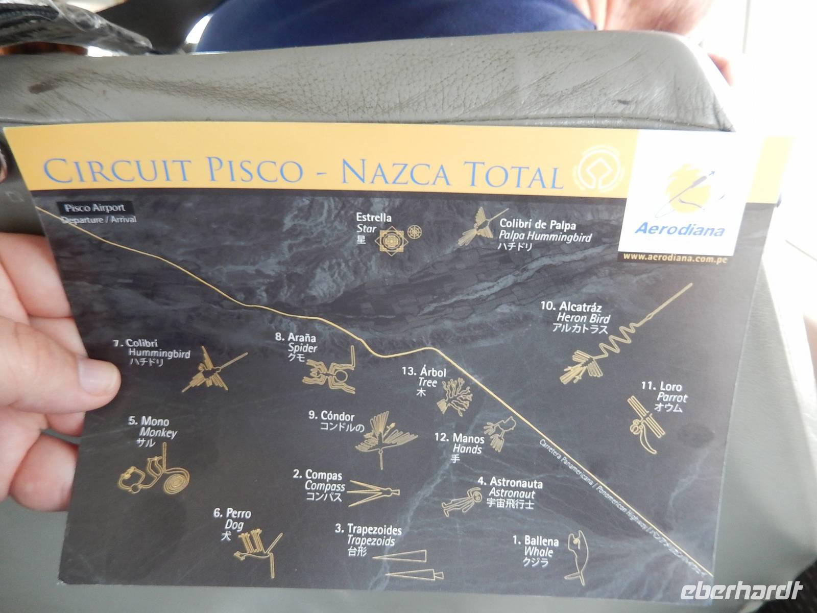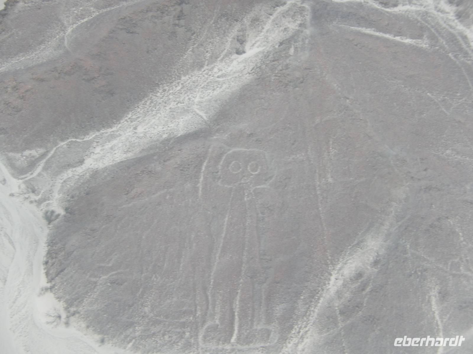 Wir werden heute das Mysterium Nazca-Linien bei einem Überflug kennenlernen. Zuerst checken wir auf dem Mini-Flughafen wie bei richtigen Flügen mit dem Pass ein. Zur genauen Sitzverteilung muss dann nochmal jeder auf die Waage und wir erhalten unsere Bordkarten. Wir fliegen mit 12-Sitzer-Maschinen so dass sich unsere Gruppe auf zwei Flieger verteilt. Noch kurz warten und dann geht der Flug los. Da wir in Pisco starten, können wir erstmal 40 Minuten Flug bis zu den Linien und die Landschaftsformen, u.a. Sanddünen, Oasen und Gebirgszüge, genießen. Anschließend wird es dann nicht mehr ganz so lustig, denn die Piloten wollen allen Insassen den besten Blick auf die geheimnisvollen Linien gewähren und steuern dazu in wilden Manövern und waghalsigen Kurvenflügen die einzelnen Bilder an. Das bekommt nicht wirklich jedem und so müssen einige auf Bilder und Genuss verzichten und mit den eigenen Mysterien kämpfen... Allen denen es einigermaßen gut geht, bieten sich hingegen tolle Ausblicke auf „Astronaut", „Kolibri", „Spinne", „Affe", „Wal"... Trotz des Fluges sehr beeindruckend und die Fragen nach dem „woher" bleiben... Auf dem Flug zurück nach Pisco können sich dann Gleichgewichtssinn und Magen wieder erholen und nachdem alle wieder auf dem Boden sind, starten wir unsere noch ausstehende Busfahrt. Erster Stopp auf unserer langen Strecke ist das Regionalmuseum von Ica. Hier sind wunderbare Exponate aus der pre-inkaischen Kulturen dieser Gegend ausgestellt. Besondere Aufmerksamkeit legen wir dabei auf die nicht unerhebliche Sammlung von Mumien und Totenköpfen aus der Kultur der Nazca, Paracas und Chincha. Bei der kleinen Führung durch Karina blüht die Archäologin zusehends auf und beantwortet uns alle Fragen. Nach dem Besuch liegen weitere 3 Stunden Fahrt in Richtung Nazca vor uns. Dabei durchqueren wir weiterhin die Provinz Ica, die sehr große landwirtschaftliche Bedeutung für Peru hat, da hier die größten Anbaugebiete für Mango, Avocado, Spargel, Wein... des Landes zu finden sind. Wir fahren entlang der Panamericana, auf der das Fahren im Dunkeln keinen wirklichen Spaß macht. Spät erreichen wir Nazca und freuen uns auf unser Abendessen im Restaurant „El Portón". Nach dem Essen fahren wir dann noch kurz ins Hotel und fallen erschöpft kurz vor Mitternacht ins Bett. Doch am nächsten Morgen heißt es sehr zeitig aufstehen...