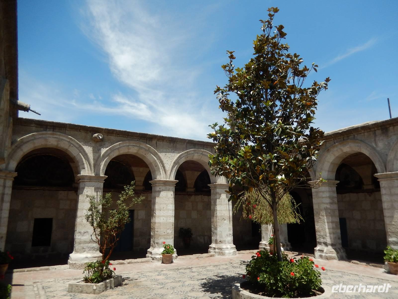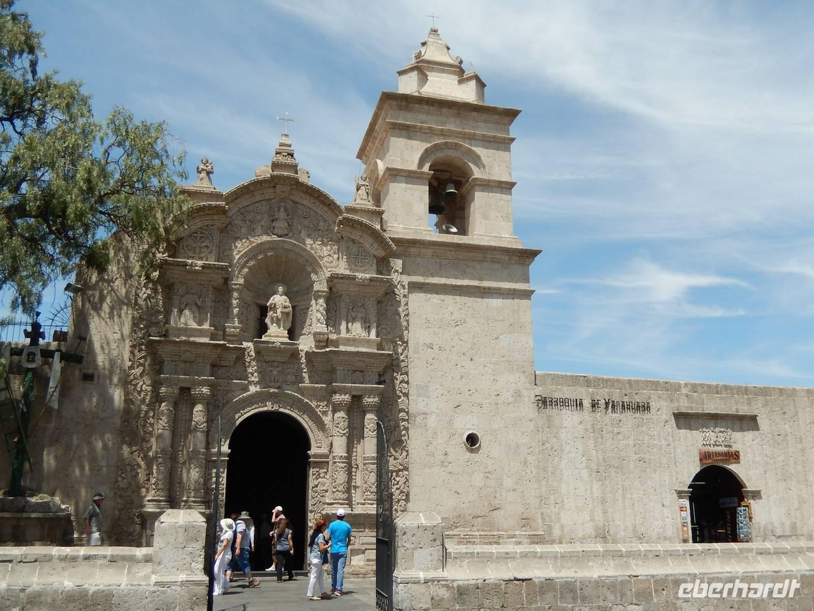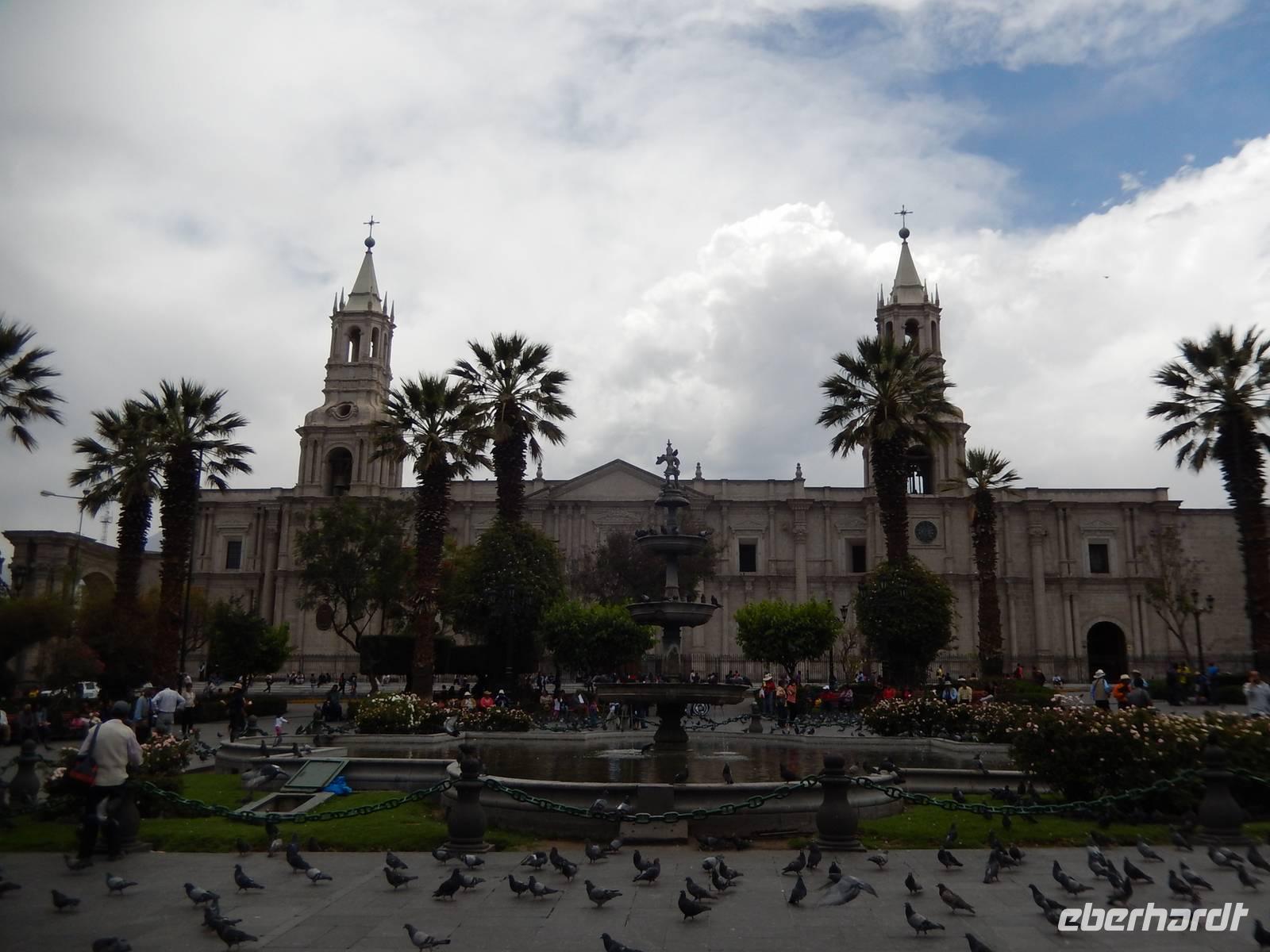 Regelrecht erholsam wollen wir heute erst 9 Uhr starten, doch das erste Highlight gibt es schon beim Frühstück. Unser Hotel direkt am Hauptplatz hat einen Teil des Restaurants auf einem Balkon im Freien und so genießen wir Kaffee und Brötchen mit direktem Blick auf die Kathedrale von Arequipa und wer ganz zeitig da war, kann sogar noch eine Prozession von diesem Logenplatz aus verfolgen. Dann treffen wir unsere neue Reiseleiterin für die nächsten Tage, eine echte Quechua, Yudy. Mit einem neuen Bus geht es zunächst auf Stadtrundfahrt und Yudy kann ihre arequipanische Herkunft und ihren Nationalstolz kaum verbergen als sie uns über den Salpeterkrieg mit Chile und dessen Folgen berichtet. Erster Stopp ist am Aussichtspunkt Mirador del Carmen alto, von wo aus wir einen fantastischen Blick in das fruchtbare Arequipa-Tal haben und die Vulkane Chachani, Misti und Picchu Picchu super im Blick haben. Nebenbei erklärt uns Yudy was es mit den Papaya arequipana auf sich hat und stellt uns auch eine sehr gesunde Wurzel, die Maca, vor, deren Likör wir auch probieren können. Und natürlich darf in Vorbereitung auf die kommenden Tage auch eine Erklärung zu Cocablättern nicht fehlen. Die ersten decken sich auch schon mit entsprechenden Bonbons oder Blättern ein und anschließend geht es weiter in das schöne Viertel Yanahuara, wo wir auch nochmal einen schönen Blick auf die zweitgrößte Stadt des Landes haben und eine Kirche im mestizischen Barock bewundern. Ganz nebenbei bestaunen wir auch noch den Dreh eines Musikvideos. Eine untersetzte Dame, verkleidet als Glitzerbonbon singt zum Playback schmachtende Schnulzen... Am Besten mal das Bild in der Bildergalerie anschauen. Fast alle wichtigen Gebäude sind in Arequipa mit Tuffstein errichtet und verhelfen der Stadt zu ihrem Beinamen, „Die weiße Stadt". Nun kehren wir ins Stadtzentrum zurück und besuchen den Convent Santa Catalina, eine Stadt in der Stadt mit einer Fläche von 20.000 km², die noch heute als Dominikaner-Kloster dient. Carmen führt uns auf deutsch und so lernen wir vieles über das eigentlich ganz bequeme Leben der Nonnen und Novizinnen früherer Tage. Nach gut einer Stunde haben wir Unterkünfte, Küchen, Dormitorium etc. gesehen und laufen mit Yudy zurück zum Hauptplatz, wo wir noch einiges über die Kathedrale und die Jesuitenkirche erfahren. Unser Stadtspaziergang endet im ehemaligen Jesuiten-Kloster und für den Nachmittag haben wir Freizeit. Die Mehrheit nimmt dies zum Anlass, sich in ein kulinarisches Abenteuer zu stürzen. Wir gehen gemeinsam ins schöne Restaurant Paladar 1900 und bestellen fast alle Cuy - Meerschweinchen. Es hat allen geschmeckt, auch wenn man vielleicht das Aussehen besser hintenan stellt und als Peru-Besucher sollte und kann man sich auf dieses Erlebnis ruhig einlassen. Die restliche Zeit bis zum gemeinsamen Abendessen verbringen wir dann mit dem Besuch der Kathedrale, kleineren Einkäufen und einem Getränk auf der Terrasse des Hotels. Am Abend speisen wir in einem Restaurant ca. 5 Minuten vom Hotel entfernt. Im ZIG-ZAG haben sich die meisten für Quinoa-Suppe (eine Art peruanischer Reis als Grundmittel) und die Trilogie vom Fleisch entschieden - so haben wir heute kulinarisch einen Rundumschlag mit peruanischen Spezialitäten getan. Es war köstlich und Herr Reinhold stellt sogar fest, die „...beste Lachsforelle seines Lebens..." gegessen zu haben.