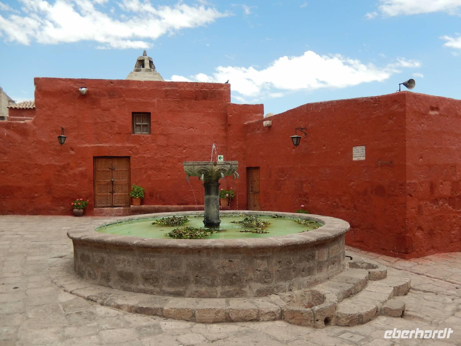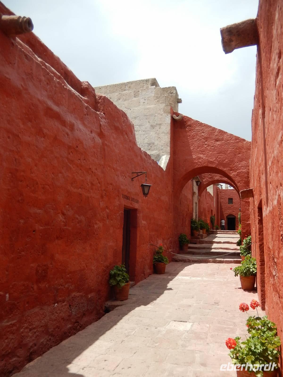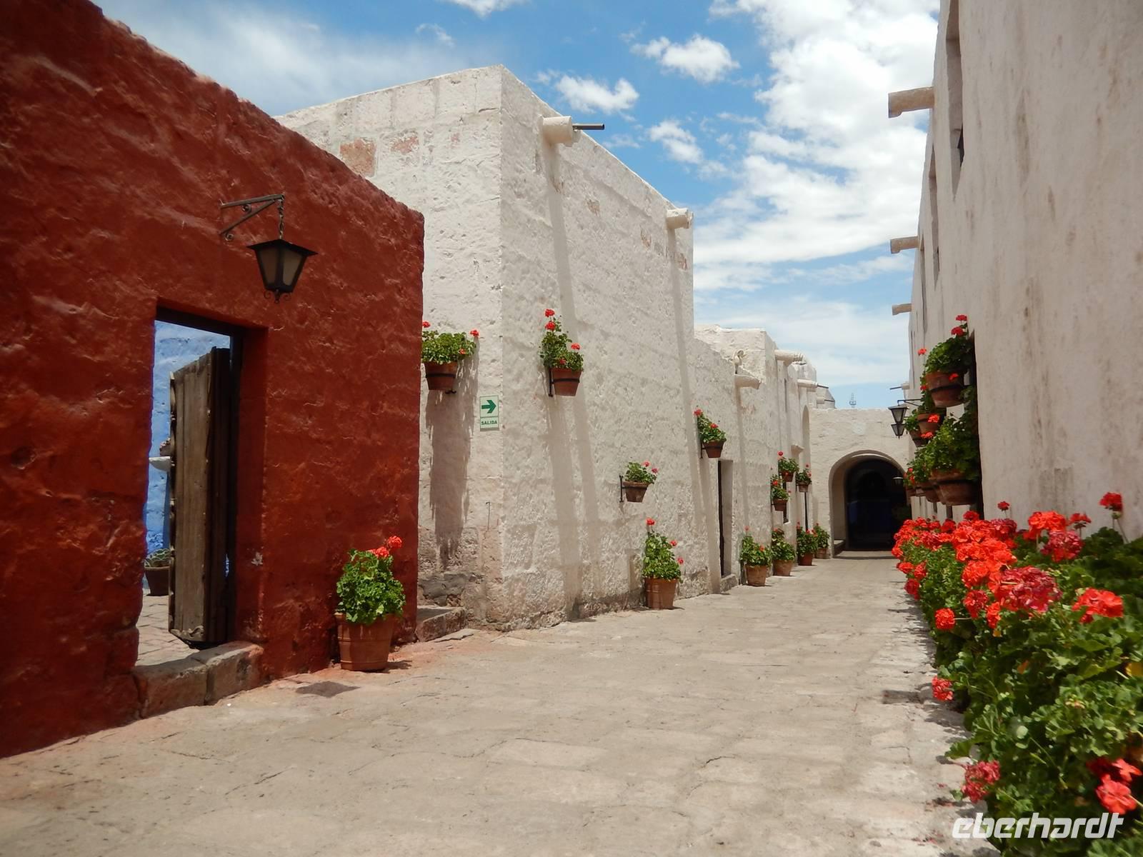 Regelrecht erholsam wollen wir heute erst 9 Uhr starten, doch das erste Highlight gibt es schon beim Frühstück. Unser Hotel direkt am Hauptplatz hat einen Teil des Restaurants auf einem Balkon im Freien und so genießen wir Kaffee und Brötchen mit direktem Blick auf die Kathedrale von Arequipa und wer ganz zeitig da war, kann sogar noch eine Prozession von diesem Logenplatz aus verfolgen. Dann treffen wir unsere neue Reiseleiterin für die nächsten Tage, eine echte Quechua, Yudy. Mit einem neuen Bus geht es zunächst auf Stadtrundfahrt und Yudy kann ihre arequipanische Herkunft und ihren Nationalstolz kaum verbergen als sie uns über den Salpeterkrieg mit Chile und dessen Folgen berichtet. Erster Stopp ist am Aussichtspunkt Mirador del Carmen alto, von wo aus wir einen fantastischen Blick in das fruchtbare Arequipa-Tal haben und die Vulkane Chachani, Misti und Picchu Picchu super im Blick haben. Nebenbei erklärt uns Yudy was es mit den Papaya arequipana auf sich hat und stellt uns auch eine sehr gesunde Wurzel, die Maca, vor, deren Likör wir auch probieren können. Und natürlich darf in Vorbereitung auf die kommenden Tage auch eine Erklärung zu Cocablättern nicht fehlen. Die ersten decken sich auch schon mit entsprechenden Bonbons oder Blättern ein und anschließend geht es weiter in das schöne Viertel Yanahuara, wo wir auch nochmal einen schönen Blick auf die zweitgrößte Stadt des Landes haben und eine Kirche im mestizischen Barock bewundern. Ganz nebenbei bestaunen wir auch noch den Dreh eines Musikvideos. Eine untersetzte Dame, verkleidet als Glitzerbonbon singt zum Playback schmachtende Schnulzen... Am Besten mal das Bild in der Bildergalerie anschauen. Fast alle wichtigen Gebäude sind in Arequipa mit Tuffstein errichtet und verhelfen der Stadt zu ihrem Beinamen, „Die weiße Stadt". Nun kehren wir ins Stadtzentrum zurück und besuchen den Convent Santa Catalina, eine Stadt in der Stadt mit einer Fläche von 20.000 km², die noch heute als Dominikaner-Kloster dient. Carmen führt uns auf deutsch und so lernen wir vieles über das eigentlich ganz bequeme Leben der Nonnen und Novizinnen früherer Tage. Nach gut einer Stunde haben wir Unterkünfte, Küchen, Dormitorium etc. gesehen und laufen mit Yudy zurück zum Hauptplatz, wo wir noch einiges über die Kathedrale und die Jesuitenkirche erfahren. Unser Stadtspaziergang endet im ehemaligen Jesuiten-Kloster und für den Nachmittag haben wir Freizeit. Die Mehrheit nimmt dies zum Anlass, sich in ein kulinarisches Abenteuer zu stürzen. Wir gehen gemeinsam ins schöne Restaurant Paladar 1900 und bestellen fast alle Cuy - Meerschweinchen. Es hat allen geschmeckt, auch wenn man vielleicht das Aussehen besser hintenan stellt und als Peru-Besucher sollte und kann man sich auf dieses Erlebnis ruhig einlassen. Die restliche Zeit bis zum gemeinsamen Abendessen verbringen wir dann mit dem Besuch der Kathedrale, kleineren Einkäufen und einem Getränk auf der Terrasse des Hotels. Am Abend speisen wir in einem Restaurant ca. 5 Minuten vom Hotel entfernt. Im ZIG-ZAG haben sich die meisten für Quinoa-Suppe (eine Art peruanischer Reis als Grundmittel) und die Trilogie vom Fleisch entschieden - so haben wir heute kulinarisch einen Rundumschlag mit peruanischen Spezialitäten getan. Es war köstlich und Herr Reinhold stellt sogar fest, die „...beste Lachsforelle seines Lebens..." gegessen zu haben.