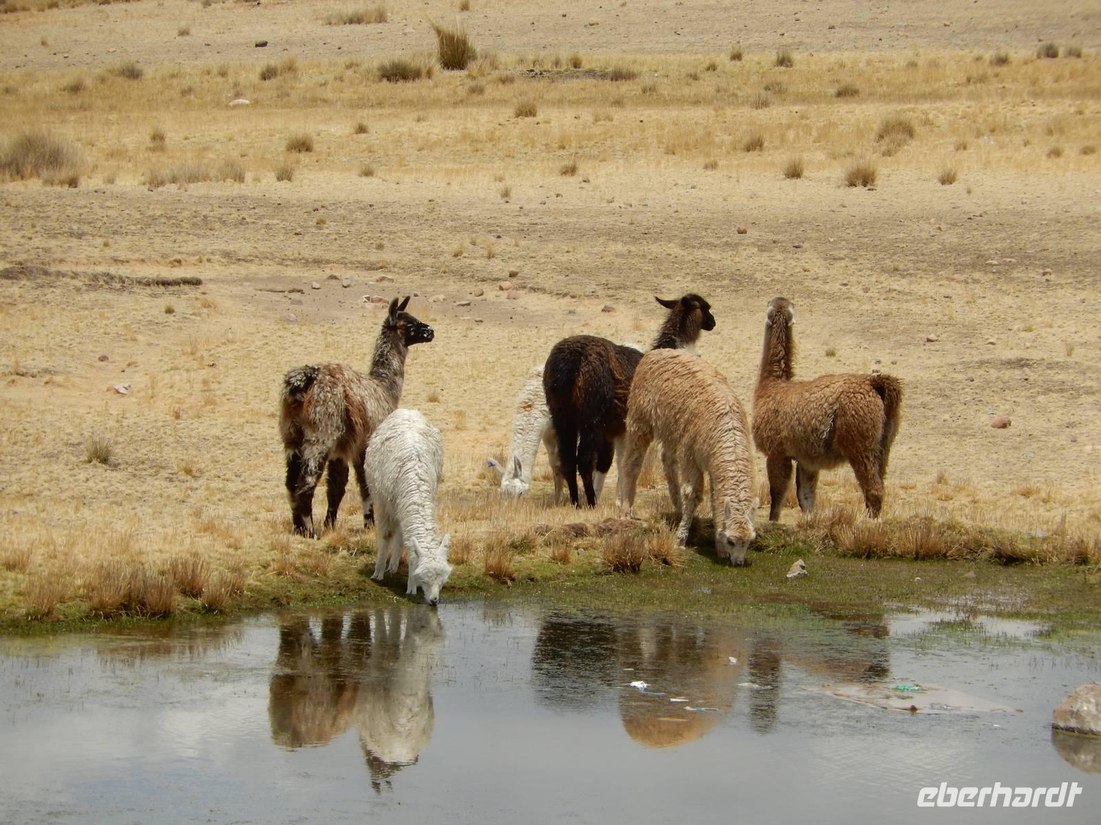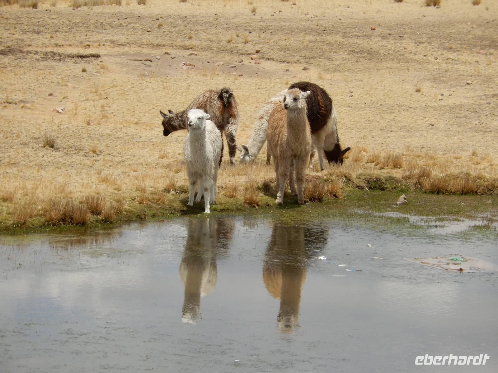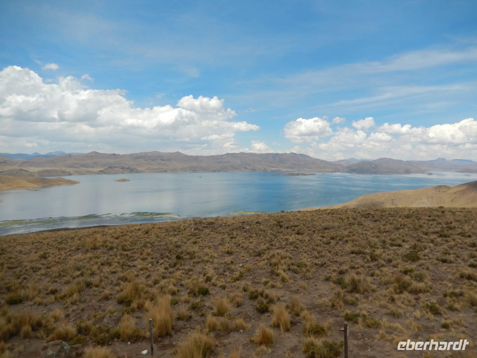 Heute verlassen wir zwar das Hochland, nicht jedoch die Höhe, die die kommende Woche noch unser Begleiter sein wird. Ganz im Gegenteil, am Ende des Tages wollen wir am berühmten Titicaca-See in Puno noch höher hinaus. Die Fahrt beginnt heute zu einer humanen Zeit und wir können uns auch Zeit lassen, denn außer dem Ziel in Puno steht heute nichts auf dem Programm. Wir müssen zuerst die Strecke zurück nach Patahuasi, zum großen Straßenkreuz nach Cusco, Arequipa und an den Titicaca-See. Das heißt aber auch, wir müssen den höchsten Punkt unserer Reise - den Patapampa-Pass in 4.910 Meter Höhe - nochmals passieren. Da wir inzwischen einigermaßen akklimatisiert sind in der Höhe und dank der medizinischen Anleitung von Yudy, können diesmal alle das fantastische Wetter und das Panorama auf die Vulkane genießen. Wir schießen noch ein Gruppenfoto und dann geht die Fahrt weiter. In Patahuasi, was wir ja auch schon von der Hinstrecke kennen, gebe ich nochmals einen Triple-Tee aus, damit die positive Gesundheit in der Gruppe auch weiterhin anhält. Die ersten Souvenire des Tages werden gekauft und der Wasservorrat aufgefüllt und dann erwarten uns noch über 220 Kilometer nach Puno. Unterwegs bleibt Zeit für weitere Fotostopps, zum Beispiel um Lamas zu fotografieren. Wir passieren die zweithöchste Stelle heute, den Cruzeiro Alto (4.528 m) und stoppen an der Laguna Lagunillas, ein riesiger See eingebettet in das tolle Panorama des Hochlandes. Ein atemberaubender Blick bietet sich uns und wir freuen uns über soviel traumhafte Landschaften. Und dann die Stände der Einheimischen - jetzt geht es los und Mützen, Jacken, Tücher, Läufer... alles können wir scheinbar gebrauchen und decken uns ausgiebig mit Alpaca-Wolle ein. Anschließend geht die Fahrt über Straßen, die eigentlich hauptsächlich aus Löchern bestehen weiter bis nach Puno. Dort erreichen wir am Nachmittag unser schönes Hotel Casa Andina Tikarani. Was bleibt zu Puno zu sagen: Es ist mit Abstand die bislang - Entschuldigung - hässlichste Stadt unserer Reise und auch die wunderschöne kleine Kathedrale kann die unschönen Seiten der Stadt nicht übertünchen. Wir bummeln also schnell über aufgerissene Hauptstraßen und versorgen uns mit Wasser, Geld, Briefmarken und dann kehren wir ins Hotel zurück. Vielleicht tun wir der Hauptstadt der gleichnamigen Region Unrecht, aber sie wird bei der Masse der positiven Eindrücke nicht in Erinnerung bleiben. Zum Abendessen gehen wir heute in ein Restaurant und die Mehrheit freut sich auf ein Alpaca-Steak, eine Spezialität der Region, doch irgendwie geht in der Höhe der Hunger verloren. Wir werden übrigens heute von Maya zum Abendessen begleitet, einer Deutschen, die neben ihrem Job als Lehrerin auch als Reiseleiterin tätig ist. Wir verschwinden schnell im Bett, denn morgen geht es wieder mal sehr früh raus...